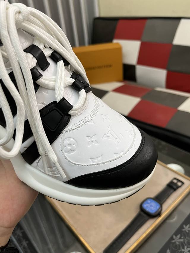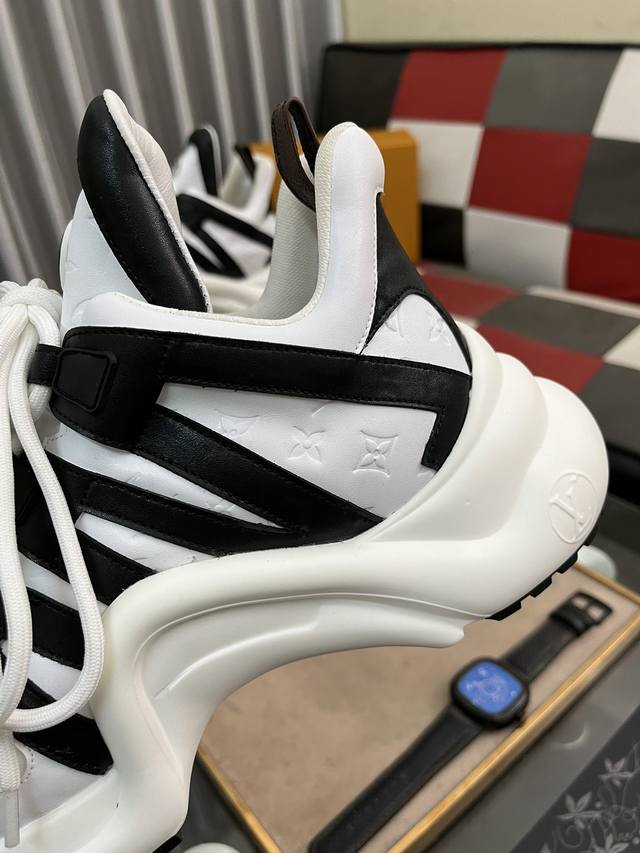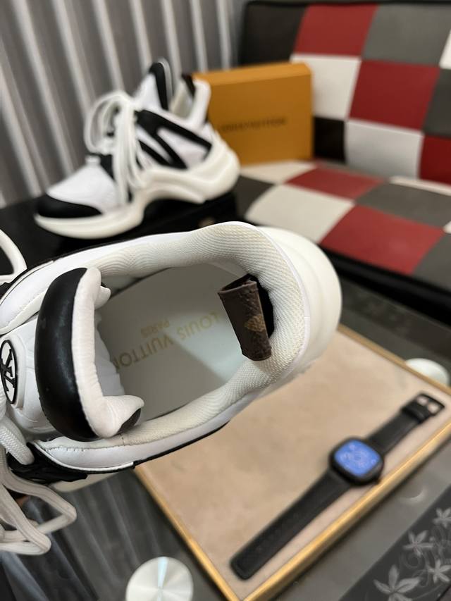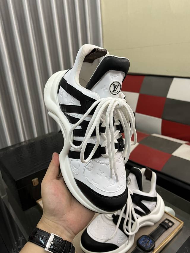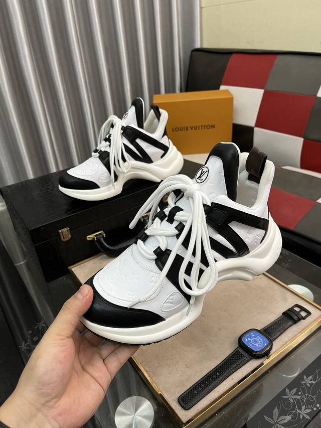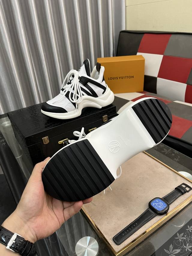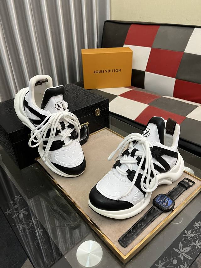 Factory Price (pp): Lv Archlight Sneaker, a sporty dad shoe from the Lv brand. This futuristic sneaker features a bouncy arched outsole paired with a striking large tongue and low-top construction, highlighting a refined women's shoe style. "Therefore, it is named after its arched sole and lightweight design. The LV Archlight sneakers, with their exaggerated arched outsole and futuristic look, are now incredibly popular! LV chunky sneakers are widely recognized as the ultimate leg -slimming shoe, extremely versatile, lightweight, and comfortable. The classic arched design instantly adds 5cm to your height, winning over many fans. Material: Transparent PVC, a blend of various original materials. Lining: Imported original sheepskin lining. Insole: Original silk cowhide insole. Outsole: TPU vacuum-sealed non-slip, anti-yellowing sole. Packaging: Full set of top-tier original packaging from authorized retailers. Shoe size: 38-44."