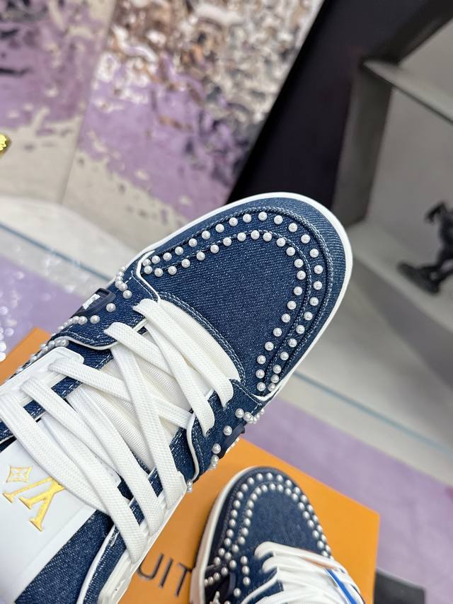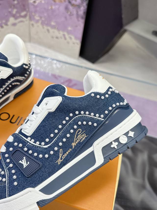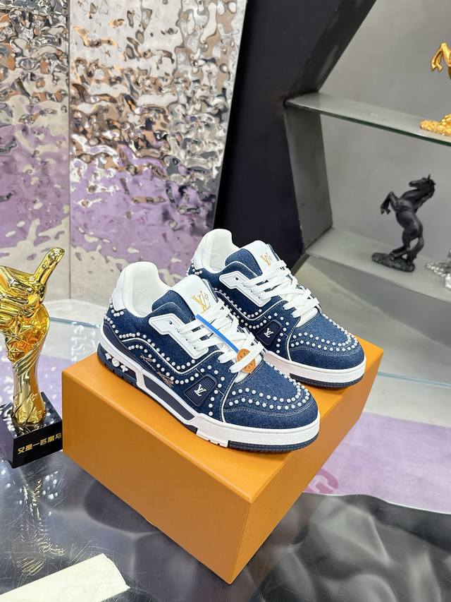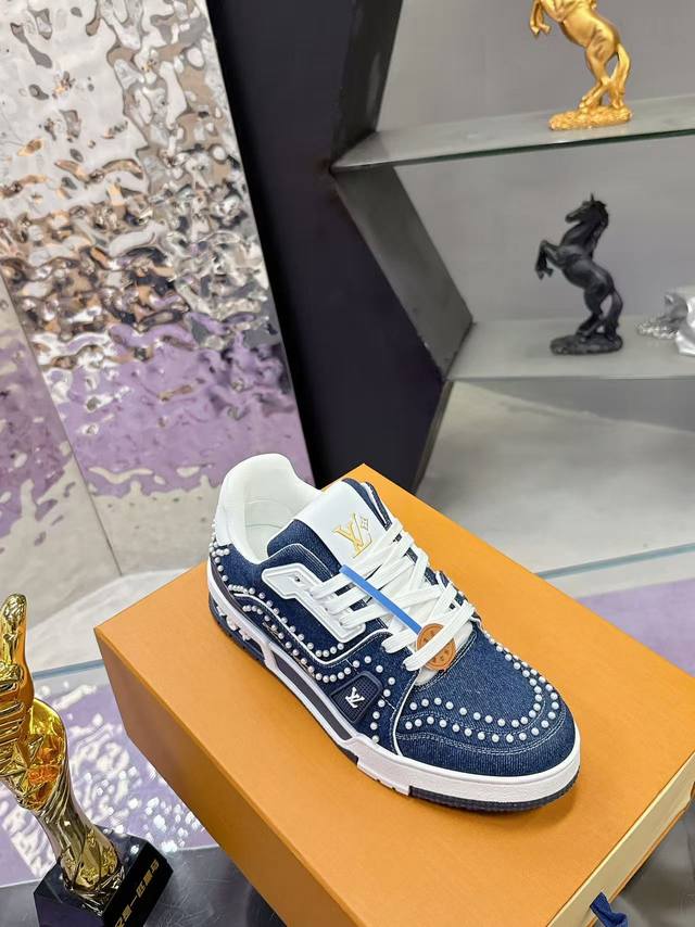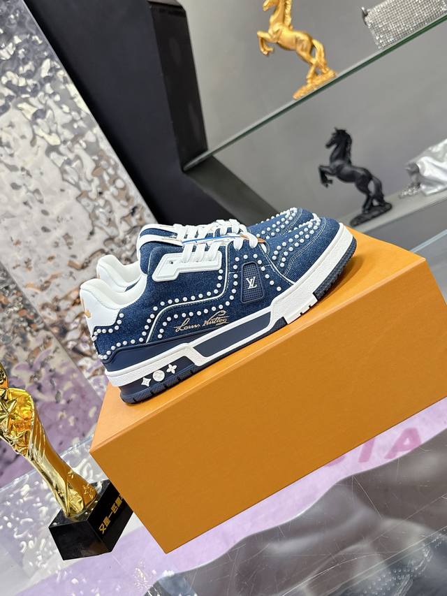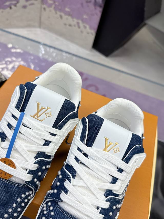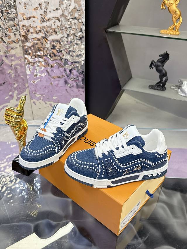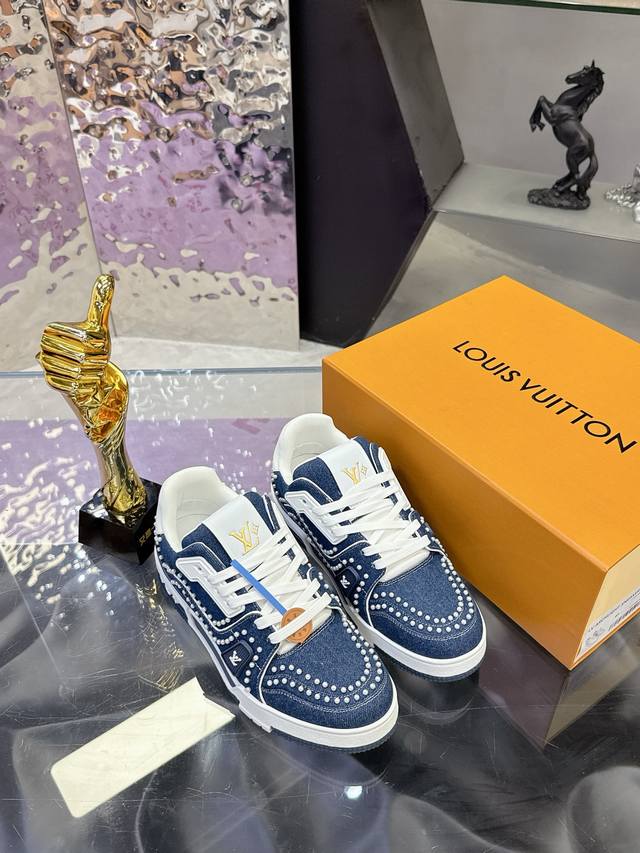 Factory Price: This Louis Vuitton Trainer sneaker pays homage to the collaboration between Pharell Williams and Nigo at the Fall/Winter 2025 menswear show. The smooth cowhide leather upper is adorned with meticulously crafted studs, featuring the designers' initials that complement the portrait pattern on the back. Rubber Louis Vuitton lettering and logo complete the eye-catching design. Comes with exquisite boutique packaging. Material: Original custom top-grain cowhide leather. Lining: Original custom breathable mesh lining. Outsole: Original molded two-tone TPU combination outsole. Sole thickness: 3cm. Size: Women's 35-40, Men's 38-46 .