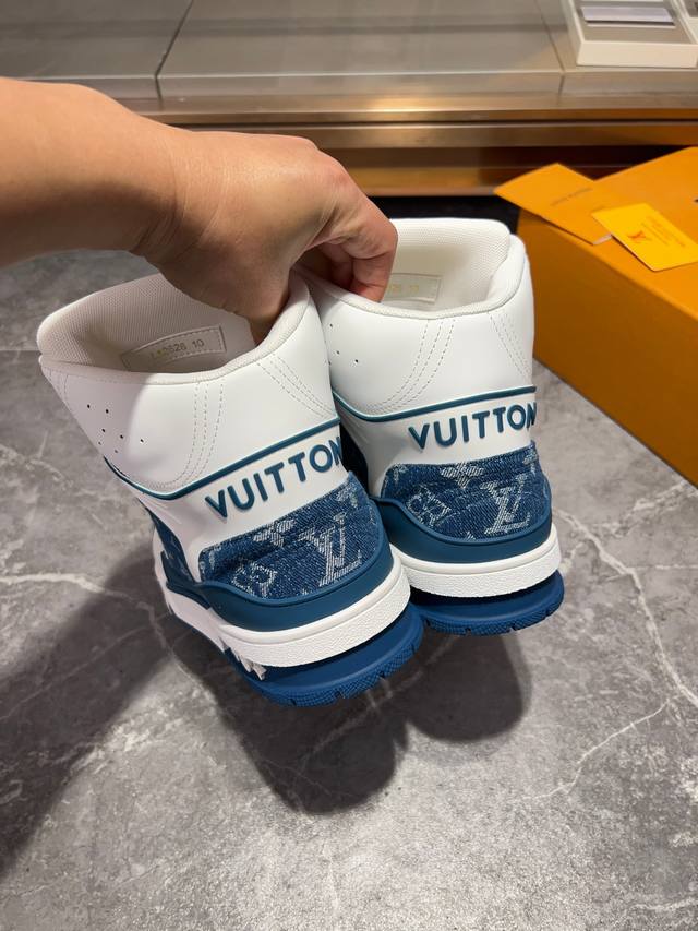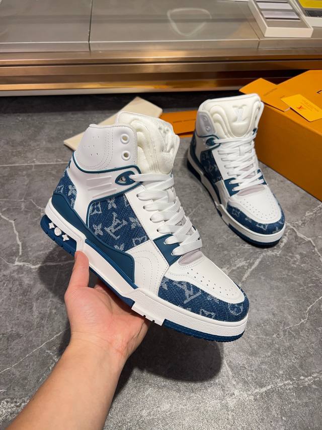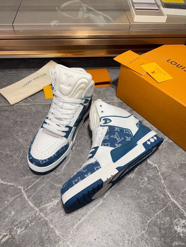 L Men's Autumn/Winter High-Top Classic Casual Sneakers. This sneaker features soft cowhide leather embossed with the classic Damier pattern, accented with a large "LV" lettering on the side for a vibrant look. A rubber outsole completes the overall design, while a memory foam ergonomic insole enhances comfort. The Italian imported pure cotton lining offers premium comfort, and the original outsole is lightweight and durable! Handmade, details determine quality! Available in sizes 38-44, 38, 45, and 46 (custom sizes available).