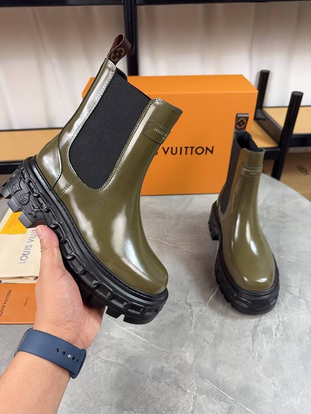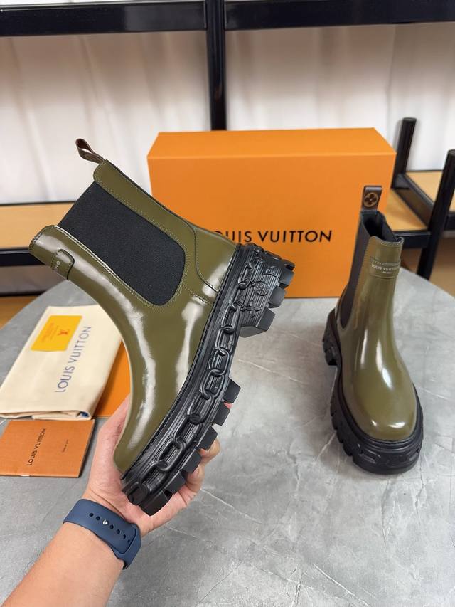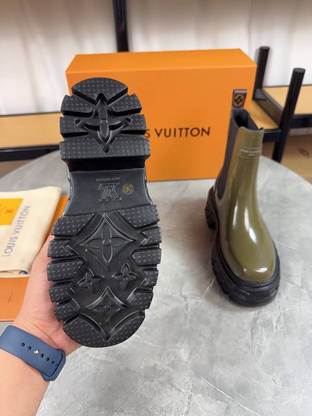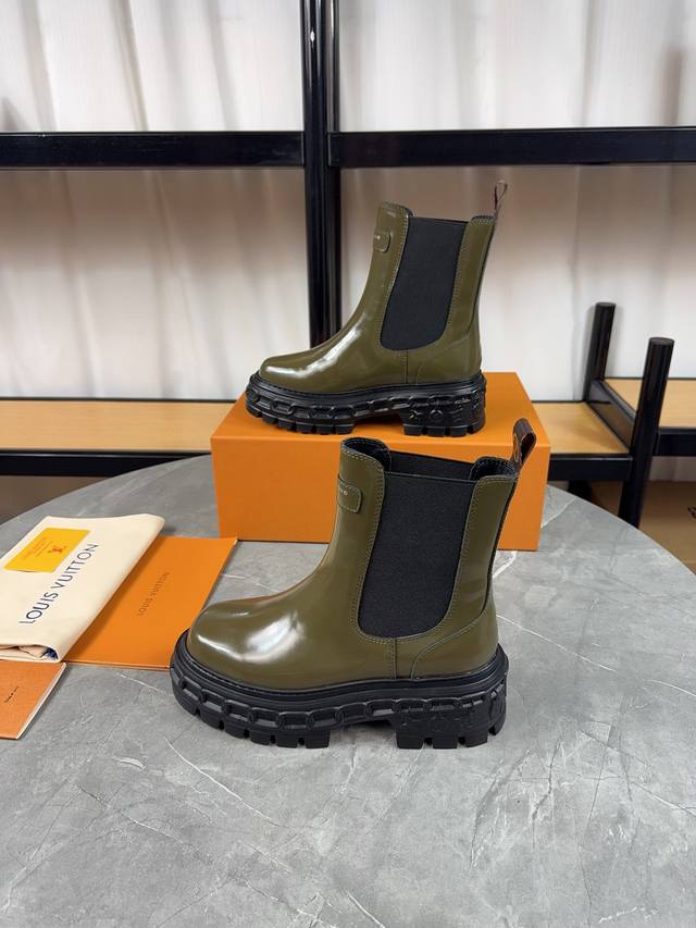 Louis Vuitton New Ankle Boots; Elegant lines avoid bulkiness, original top-grain cowhide combined with high-gloss matte cowhide, thin strap motorcycle boots for easy on and off, no comparison without protection against the winter cold. Upper: Original split-edge cowhide; Lining: Cowhide; Insole: Cowhide; Outsole: Original wear-resistant and non-slip rubber sole; Height: 6 inches; Packaging: Original LV box; Sizes: 34-41; Sizes 34 and 41 are custom-made and non-refundable; Boot height 6 inches; Colors: Black, Army Green.