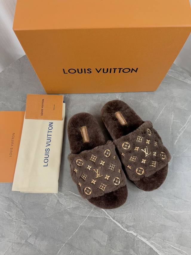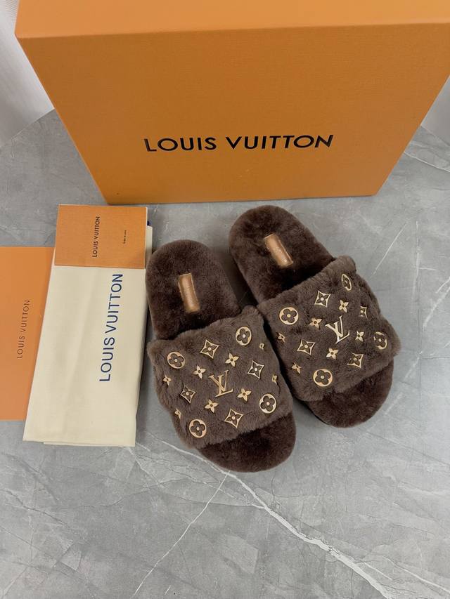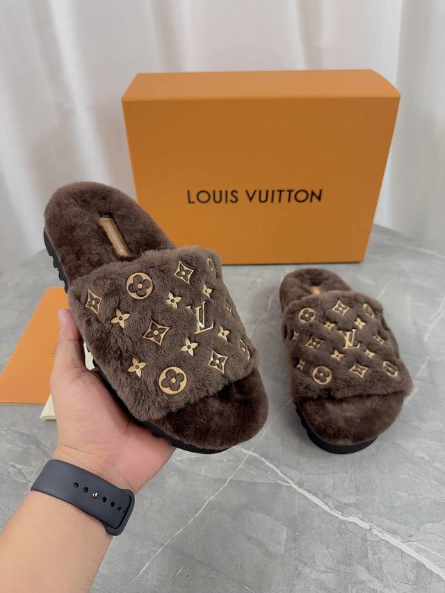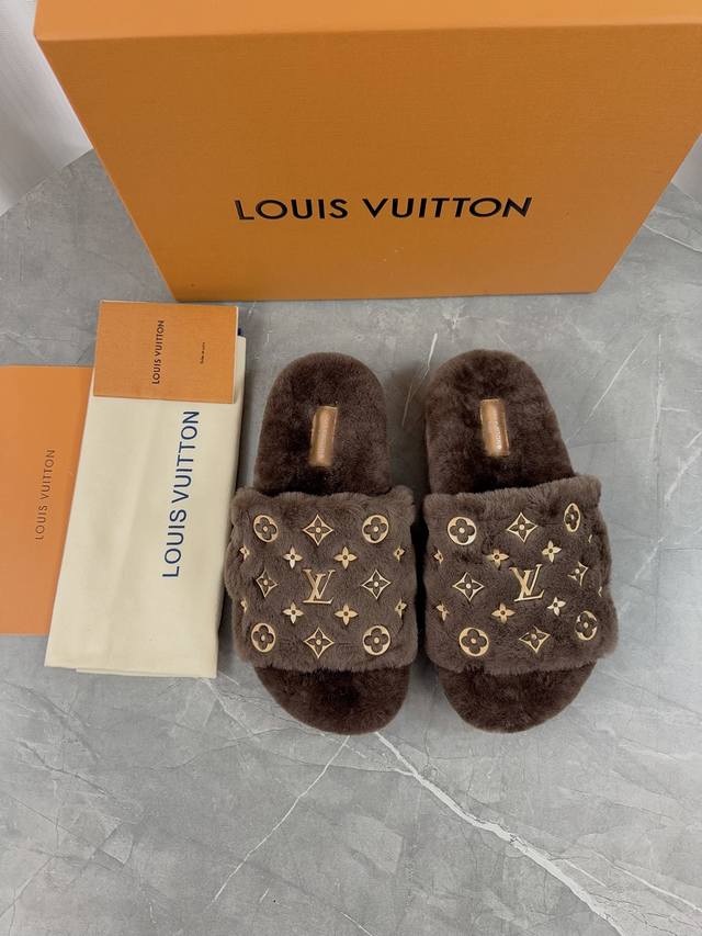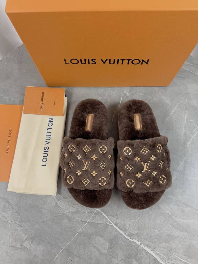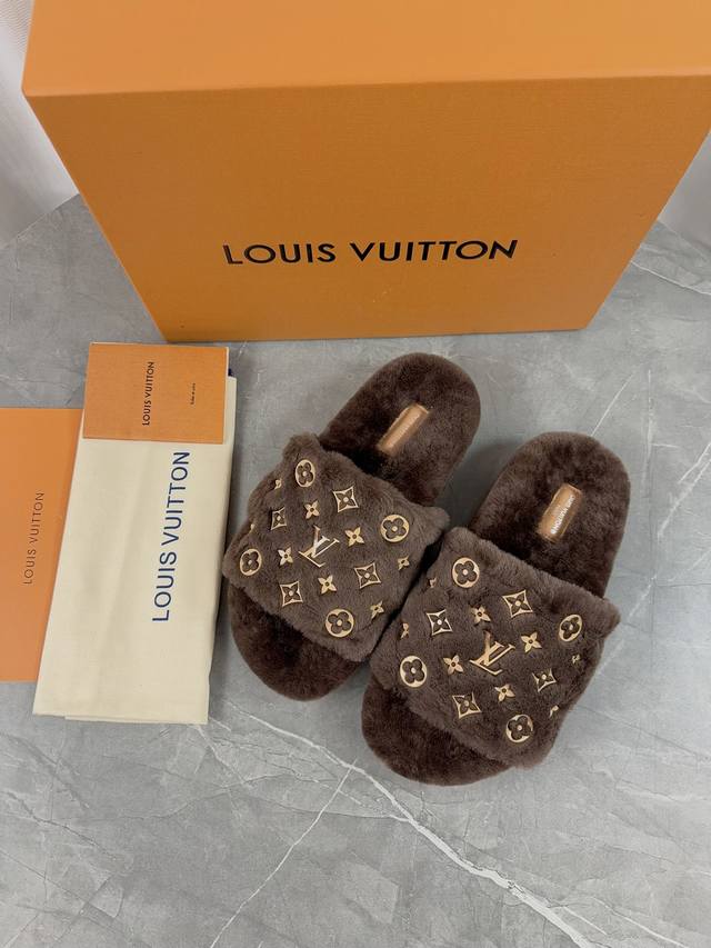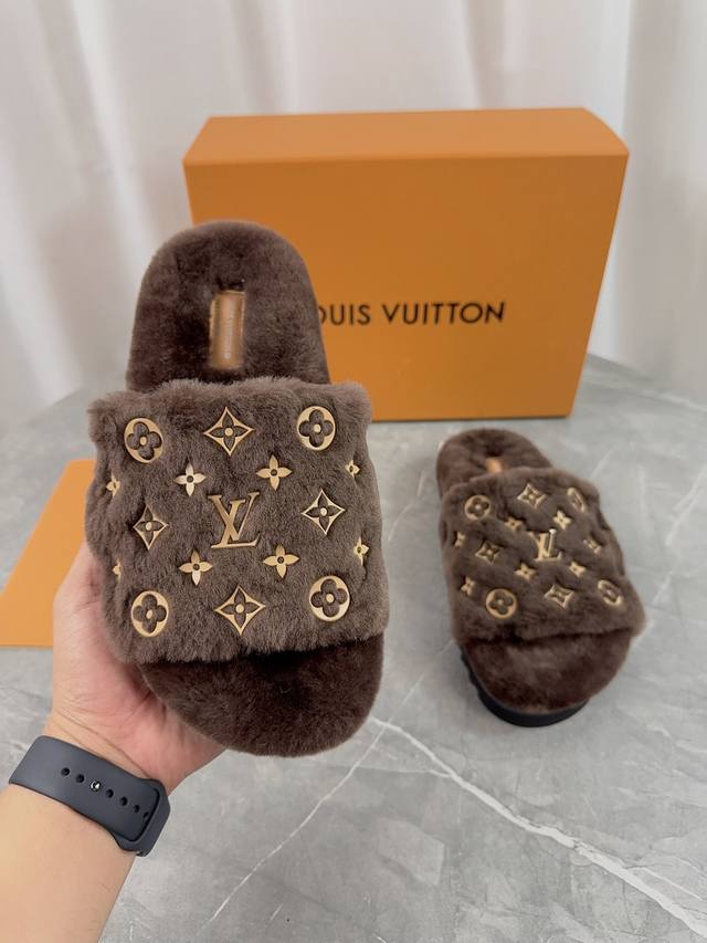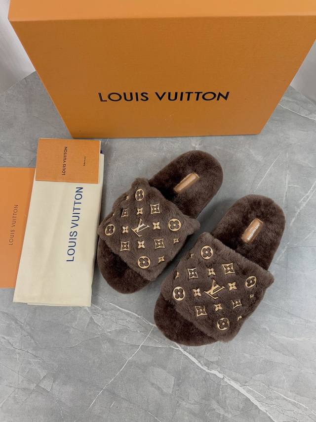 Louis Vuitton New Wool Slippers - Soft and Fine Wool, Top Quality Pure Fur Straight Hair! Super warm, wearing them feels like walking on clouds. Classic LV monogram embellishments, exquisite and sophisticated! This elevates the value of these slippers! The sole is an original molded EVA foam non-slip outsole, very comfortable and non-slip, and the sole has a certain thickness for excellent comfort! Upper: Original Australian Wool Lining: Australian Wool Insole: Australian Wool Outsole: Original Foam Sole Height: 3.5cm Packaging: Original Drawer Box Sizes: 35-40, 34, 40, 41 (Custom orders are non-refundable) Color: Official website synchronized color batch: