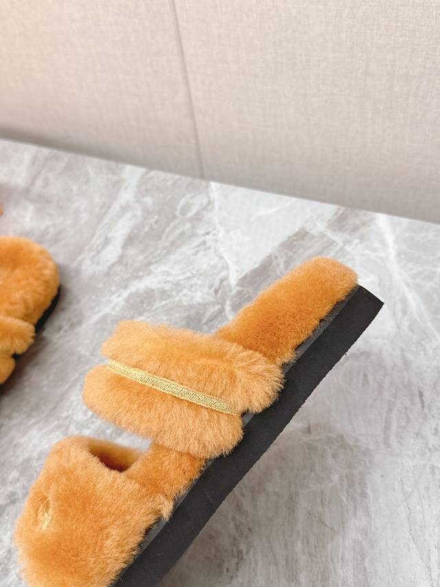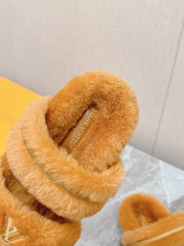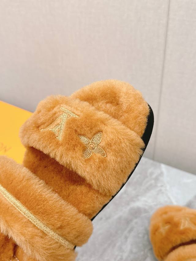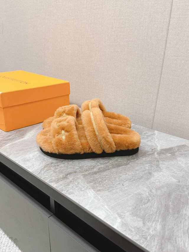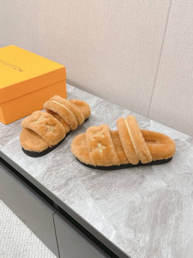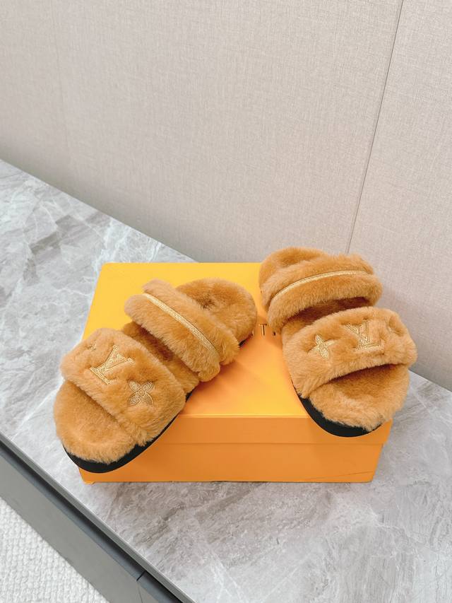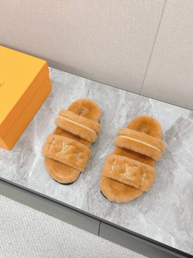 Louis Vuitton's latest autumn/winter pure wool slippers, thick-soled, height-increasing, outerwear wool slippers, diamond pattern cross wool slippers, diamond pattern two-line wool slippers. A must-have for petite women, these slippers are height-increasing, slimming, exquisite, sophisticated, and effortlessly chic. They're so cute and fluffy! The upper, lining, and insole are made of genuine wool, providing warmth, comfort, and a premium feel. Sizes: 35-41.