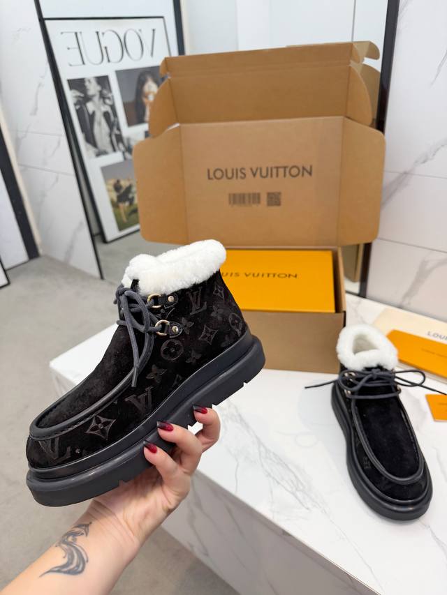 LV has captured the essence of autumn/winter | Defining luxurious warmth in the cold season. The 2025 autumn/winter runway show leads straight to your wardrobe. Front laces outline minimalist lines. The neckline is adorned with creamy lamb's wool. High-gloss suede cowhide exudes a soft satin sheen. The lining is gently wrapped in dense wool. The thick sole subtly insulates against the cold ground. Winter elegance is, in fact, readily available warmth and composure. #LouisVuitton #LVAutumnWinter #LuxuryFashion #WarmWinterBoots Upper: Imported high-gloss cowhide with embossed design. Lining: Super warm fleece lining. Sole: Original molded foam composite outsole. Packaging: Full set of exquisite packaging. Sizes: 35-42. Size 42 is custom-made and non-refundable.