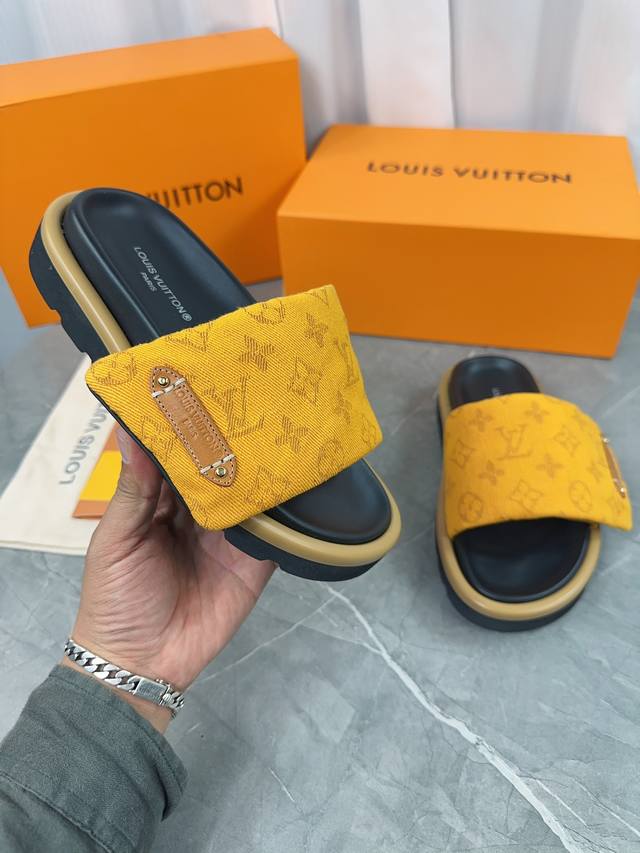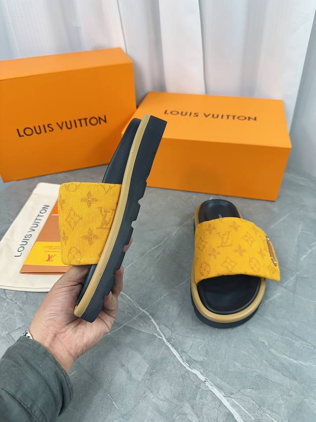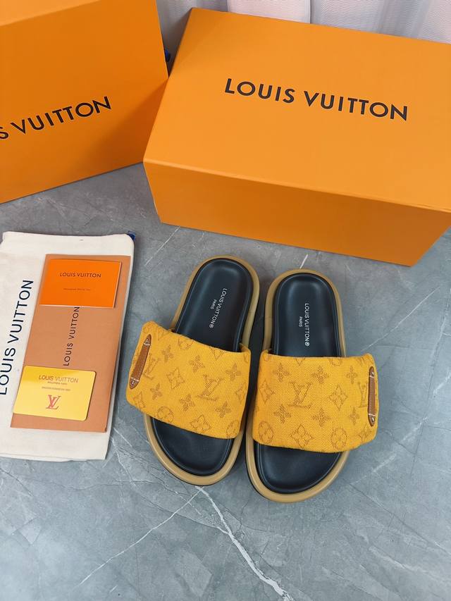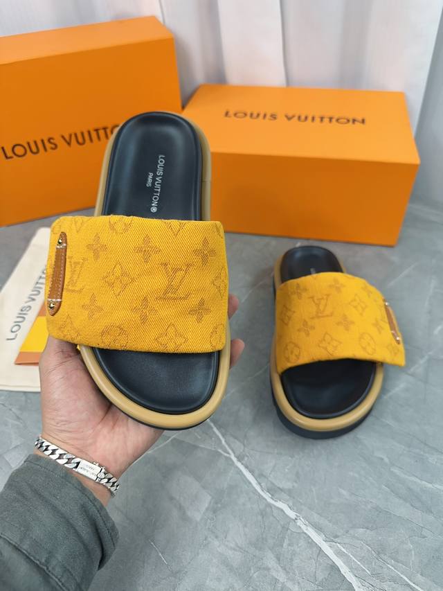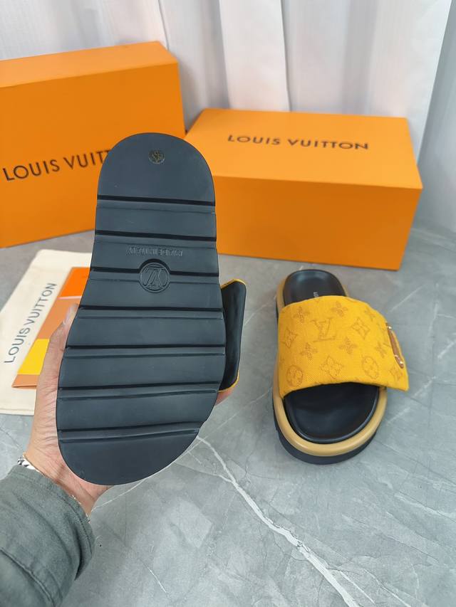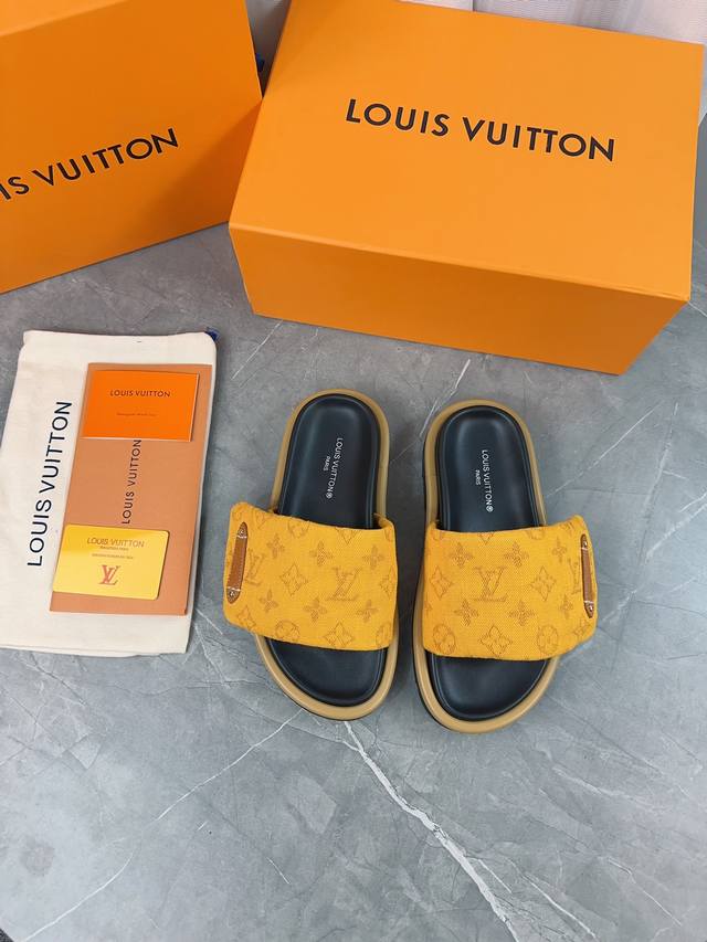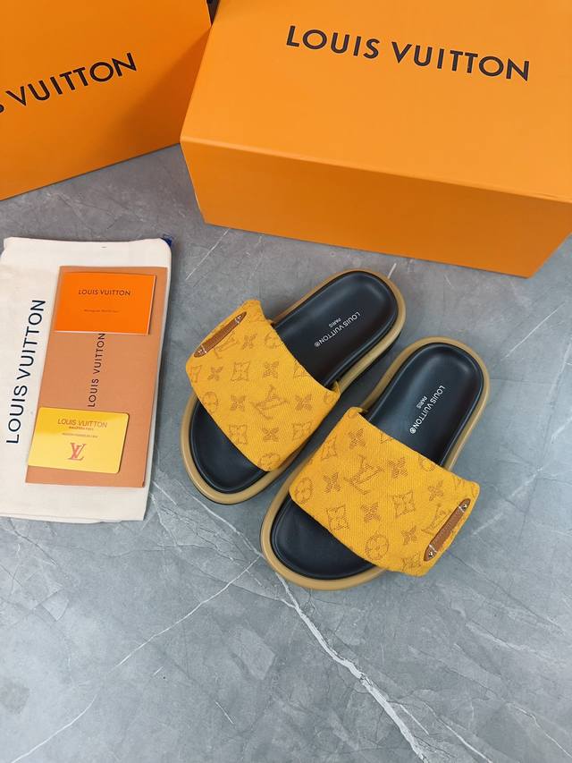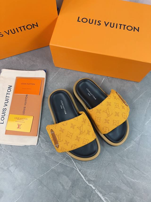 LV (Louis Vuitton) best-selling embossed logo sandals. These Pool Pillow Comfort flat sandals are crafted from technical fabric, using high-frequency embossing technology to reinterpret the Monogram pattern. The soft, padded upper features an adjustable Velcro closure, and the comfortable, resilient insole adds a harmonious touch. Materials: Original custom technical fabric; Lining: Soft sheepskin; Outsole: Original molded rubber foam outsole; Colors: Sky Blue, Yellow, Black; Size: 35-45 DDD