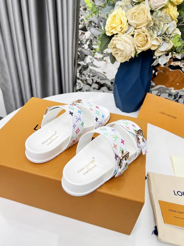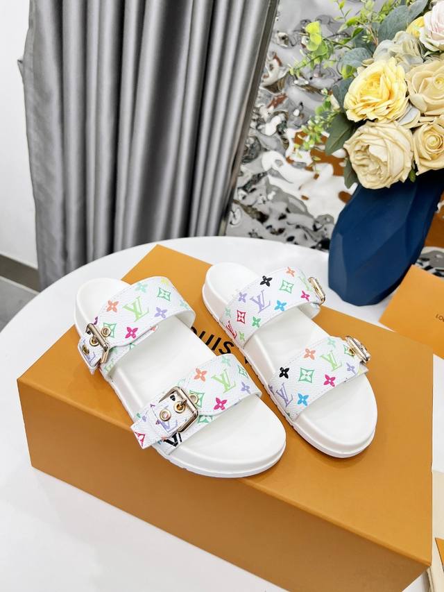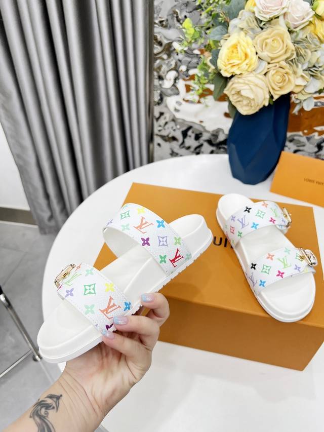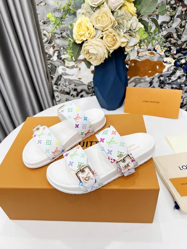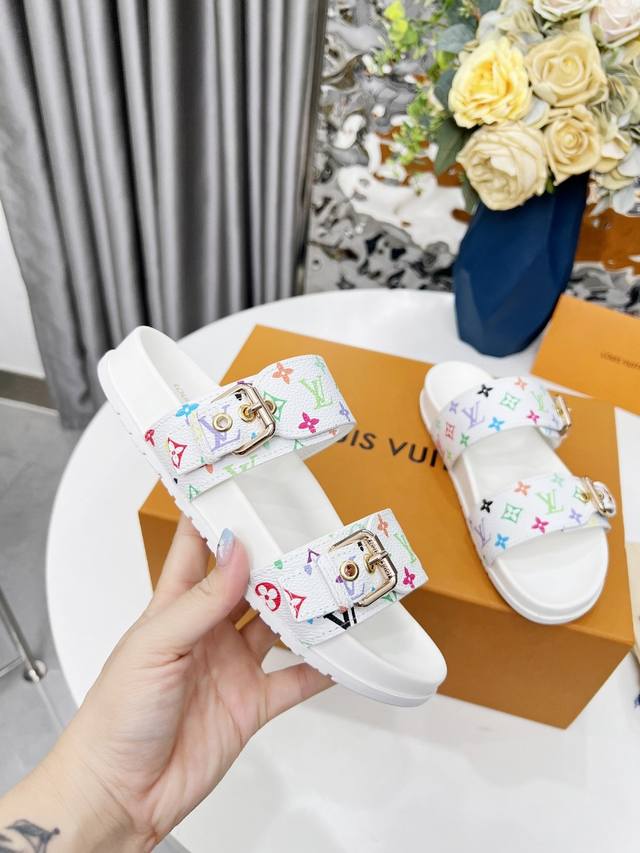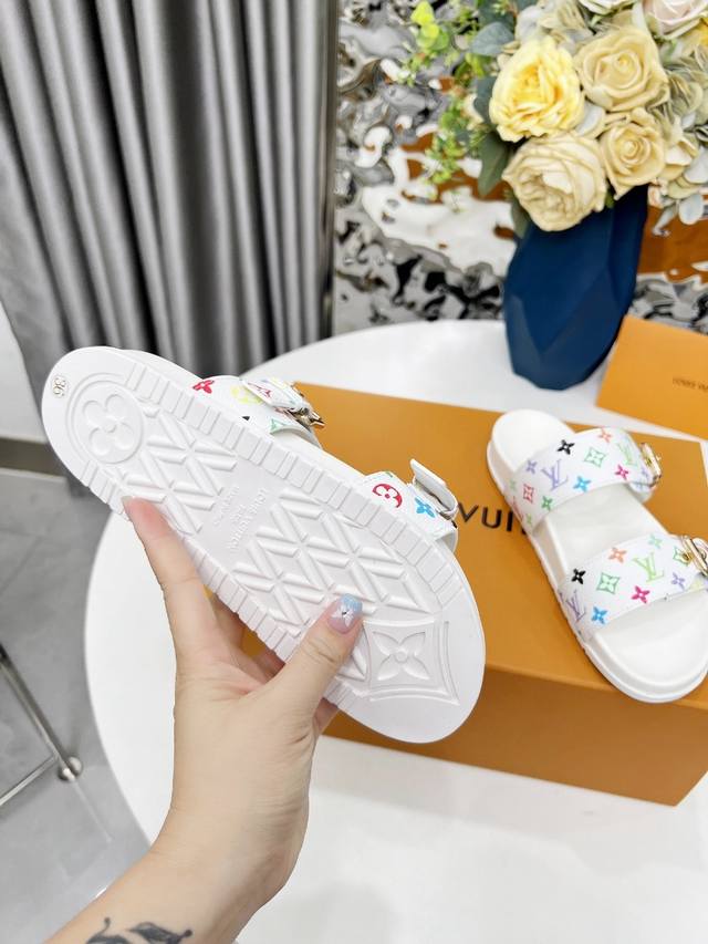 Lv Spring/Summer New Slippers with Adjustable Belt Buckle Design, Full of Beach Style. Original mold, Lv metal logo decoration, both fashionable and beautiful, super versatile. Custom upper with imported jacquard fabric, original monogram leather, water-dyed sheepskin lining, platform + wear-resistant fleece + rubber sole, three-layer combination outsole. Size: Women's 35-43, Men's 38-44.