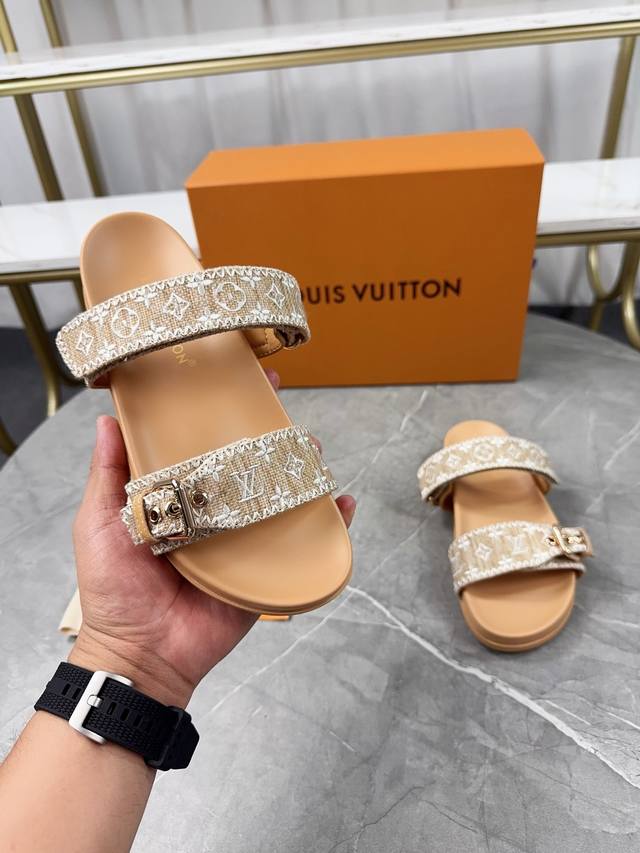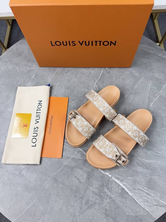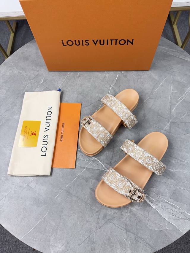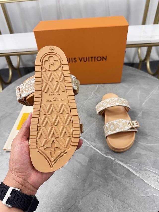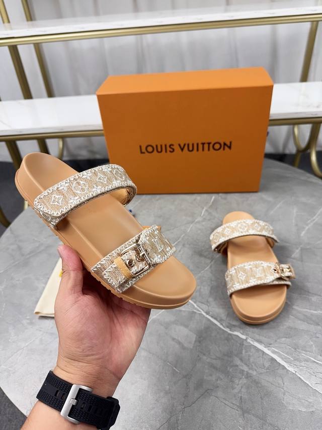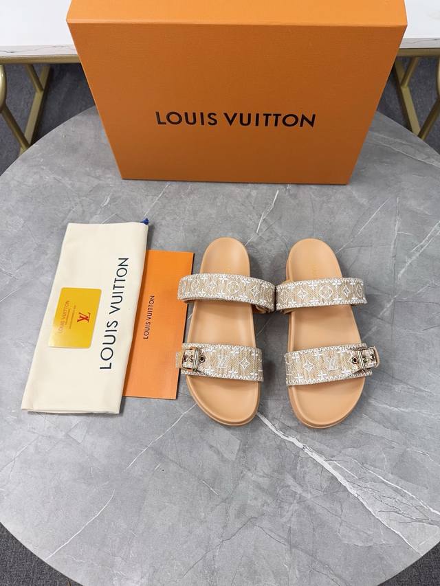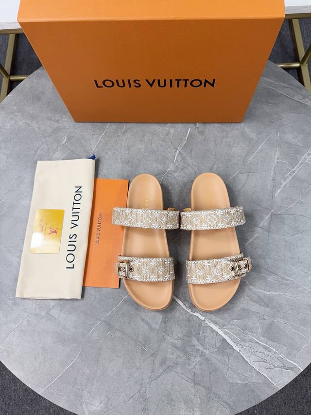 LV2025 Spring/Summer New Slippers with Adjustable Belt Buckle Design, Full of Beach Style. Original mold, LV metal logo decoration, both fashionable and beautiful, super versatile. Upper made of cowhide, custom imported jacquard fabric, original monogram leather, water-dyed sheepskin lining, platform + rubber sole, three-layer combination outsole. Size: Women's 35-43, Men's 38-46.
