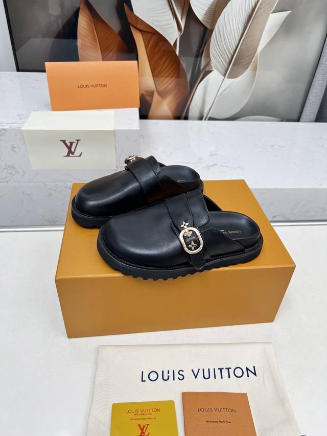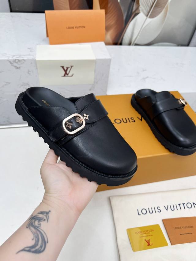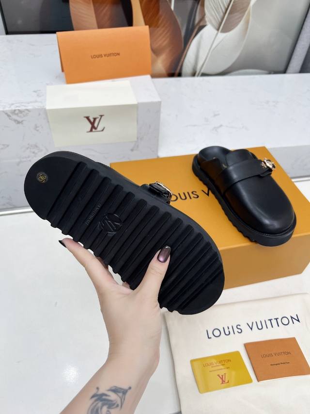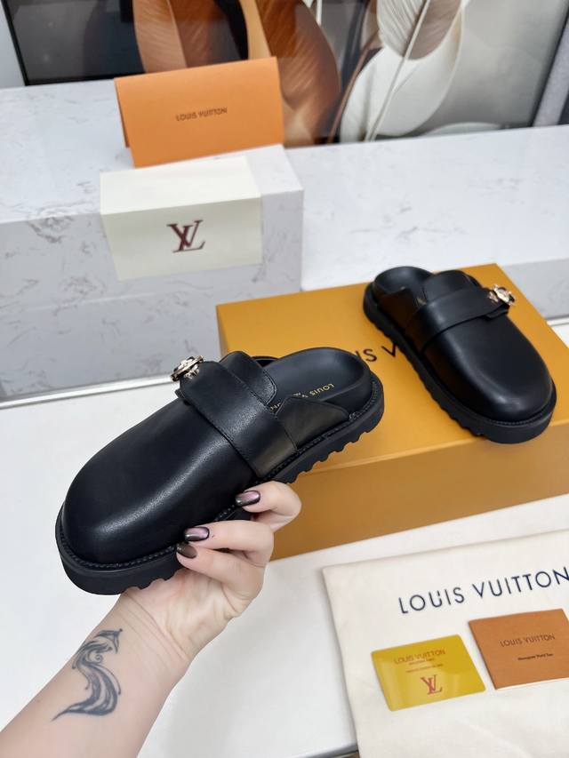LV's new Winterbreak Comfort flat slippers with closed toe and half-slippers feature a leather upper with LV monogram and floral motifs, paired with a sheepskin lining. Perfect for both indoor and outdoor wear. Made of high-density foam, the platform is lightweight and comfortable, and the sole has a nice thickness for height-enhancing effect! Available in sizes 35-45,