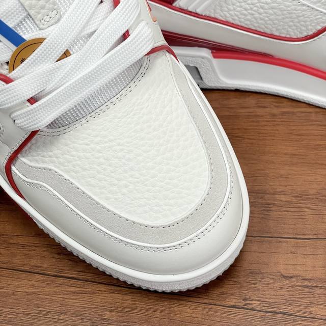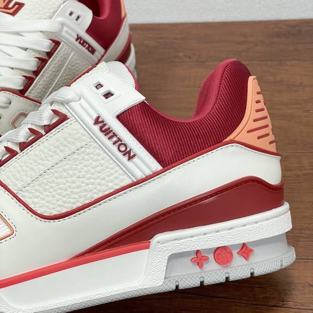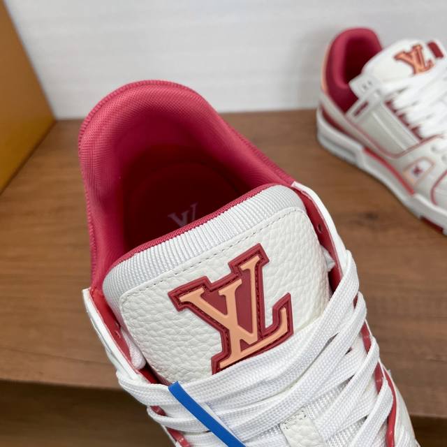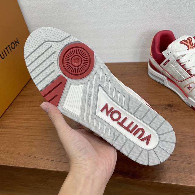 New LV Trainer Men's Sneakers - Shipped! This LV Trainer sneaker is crafted from grained cowhide leather, paying homage to Virgil Abloh's original classic design inspired by retro basketball shoes with vibrant colorways. The upper is adorned with rubber LV lettering and the Vuitton logo, while the Monogram floral pattern embellishes the technical rubber outsole. The original design, created by Virgil Abloh, showcases the inspiration from retro basketball shoes. Continuing the intricate upper design, the glued rubber outsole retains iconic elements, and the standard insole ensures continued comfort. Comes with original box and complete packaging! Sizes: 39-40-41-42-43-44 (Standard dress shoe size 38, 45). Custom orders are possible. Returns and exchanges are not supported. Item Number: 1659 (White and Red Two-Tone).