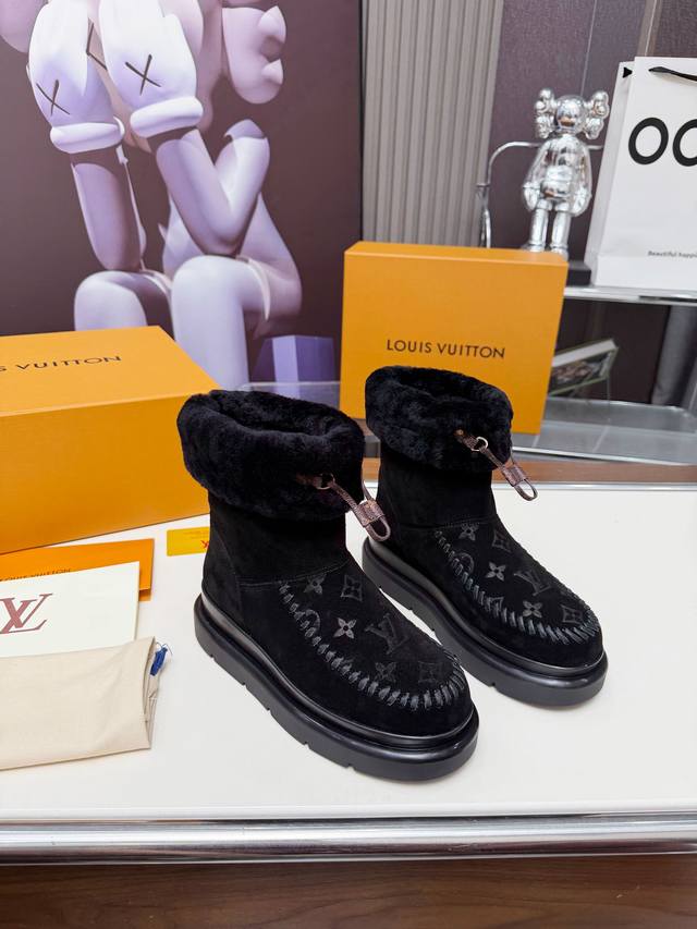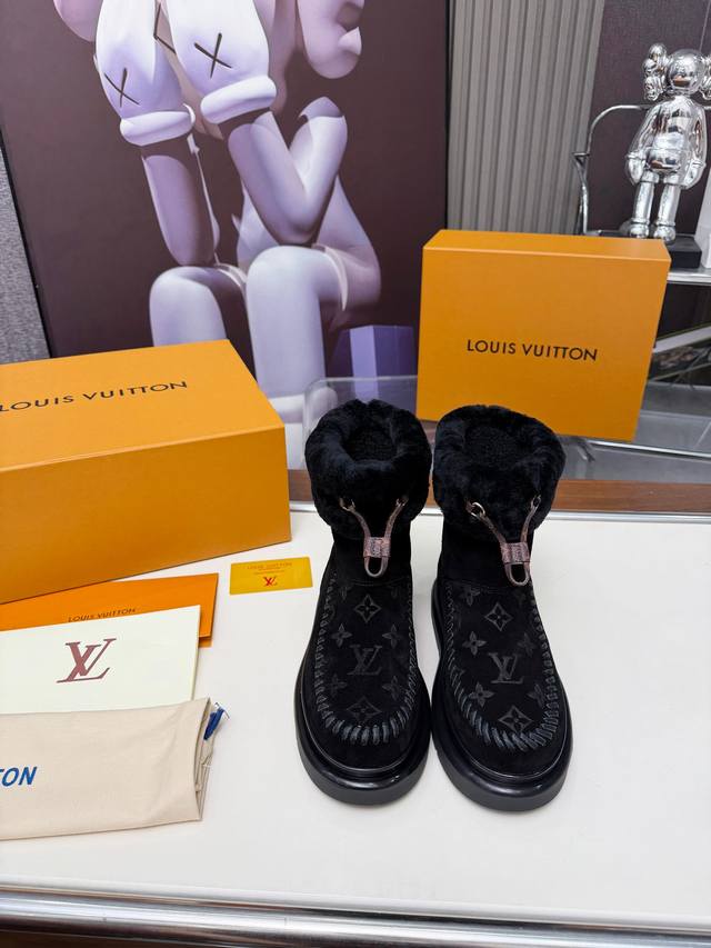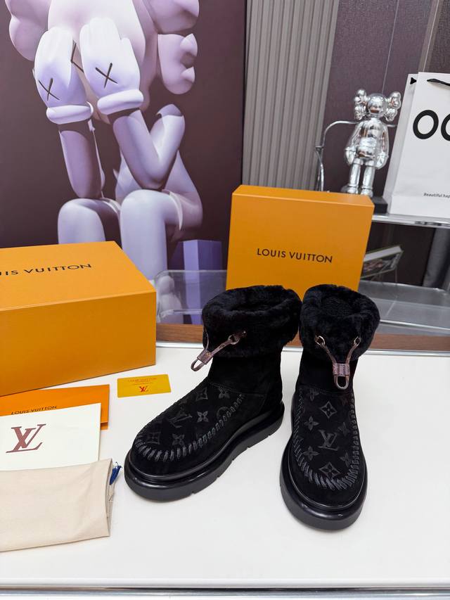 Size: 35-42 Size 42 is custom-made and non-refundable. Louis Vuitton Fall/Winter Newest Fur Boots. 2025 LV Runway Style. Upper: Imported high-gloss cowhide. Lining: Super warm fur lining. Original molded foam sole, complete with exquisite packaging.