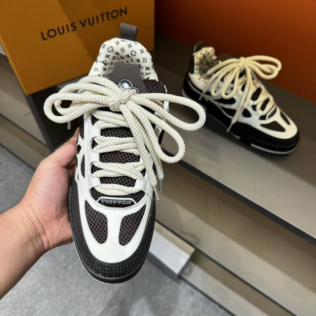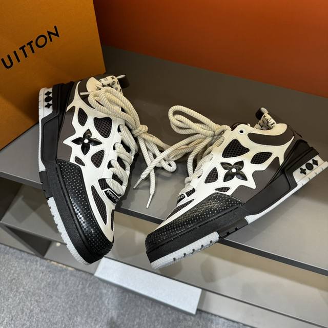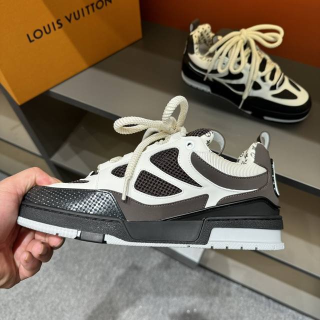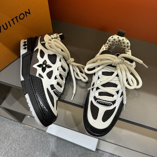 Sizes 38-46 L*Skate Sneakers. This LV Skate sneaker combines Monogram denim with a technical mesh upper, featuring technical laces and a rubber outsole, showcasing the striking style of the 1990s. The padded collar and tongue continue the iconic elements, with the "Lv Since 54" logo representing Louis Vuitton's founding year of 1854. The Monogram floral embellishment on the rubber outsole is crafted from top-grain leather and high-tech fabric, with a contrasting rubber toe cap and mesh lining with cotton padding, ensuring unparalleled comfort. A timeless classic, prioritizing quality, and a worthy addition to any collection.