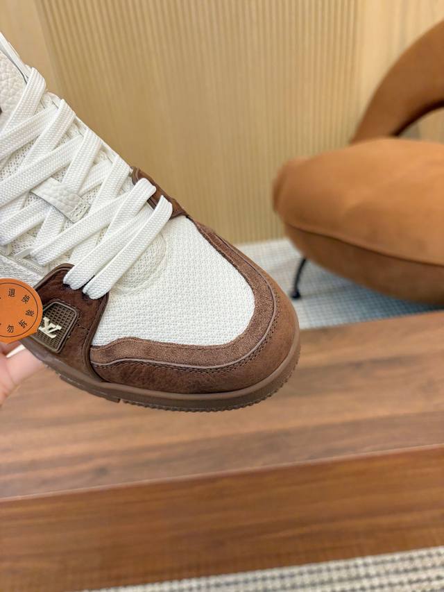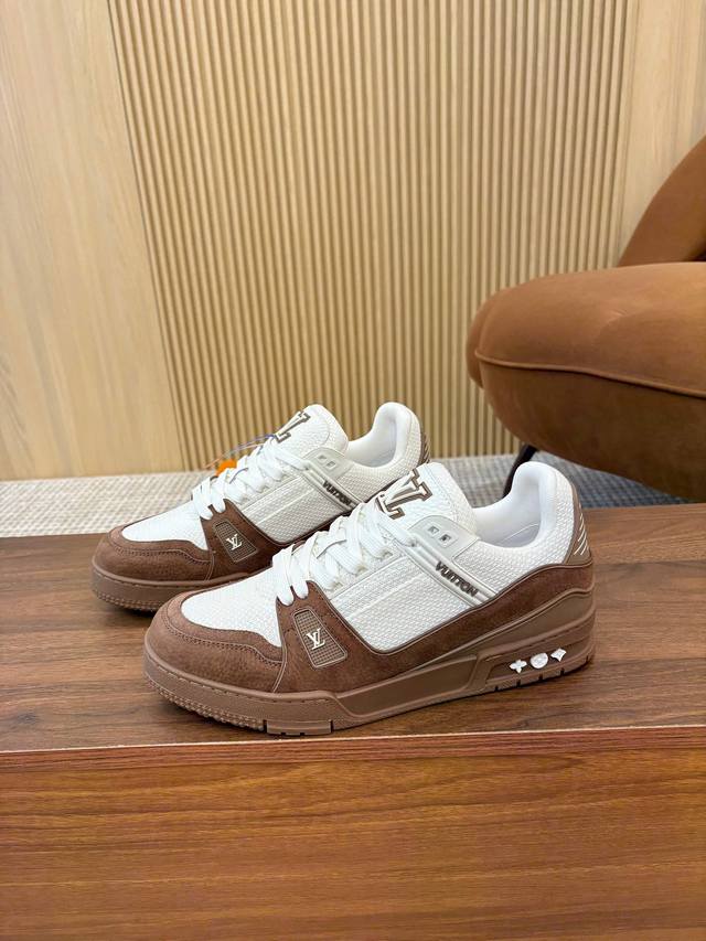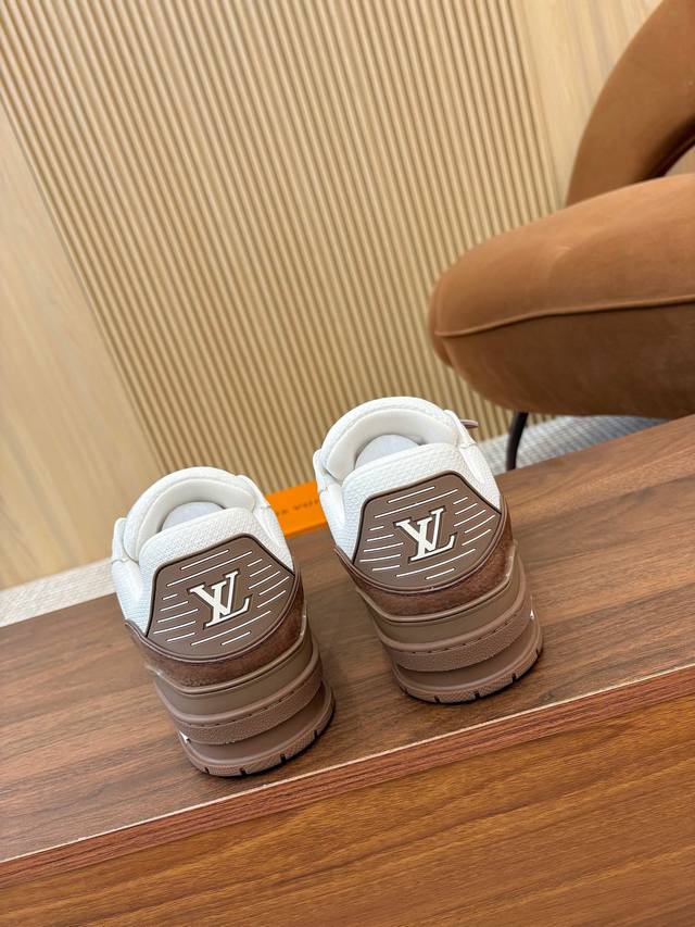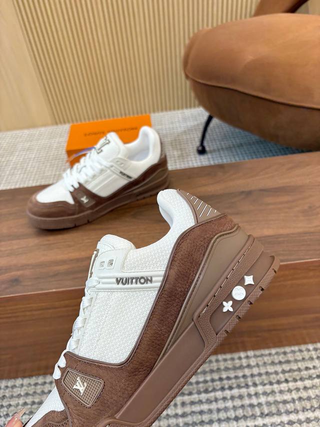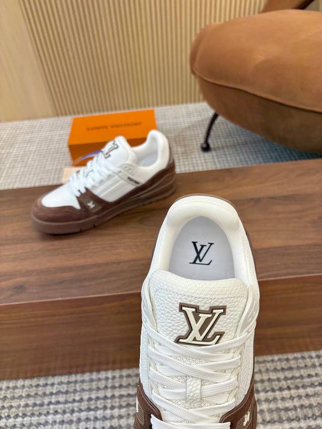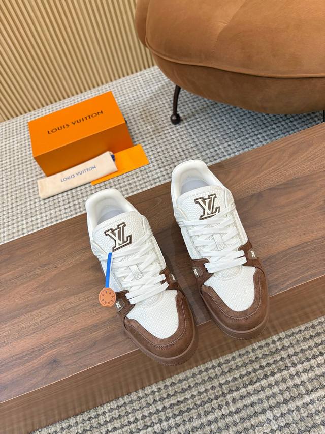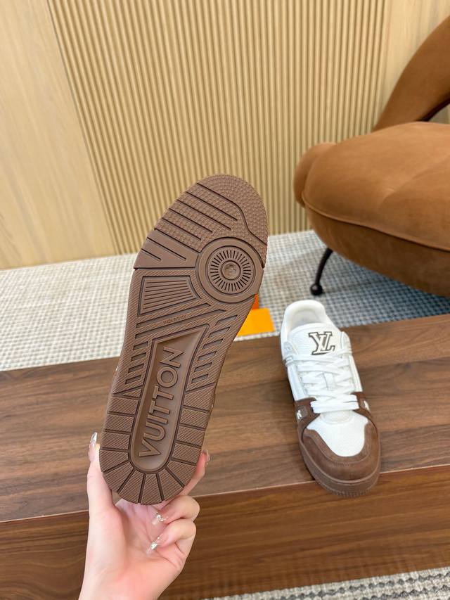 Top-tier version Louis Vuitton Lv Tarine casual sneakers/skate shoes for couples. This Lv Trainer sneaker features an intricate upper crafted from cowhide leather, requiring hours of meticulous stitching to complete. The spray-painted effect creates a unique retro look, with a classic design inspired by retro basketball shoes, inspired by Virgil Abloh. Comes with exquisite boutique packaging. Material: Original custom top-grain cowhide leather. Lining: Original custom breathable mesh lining. Outsole: Original molded two-tone TPU combination outsole.