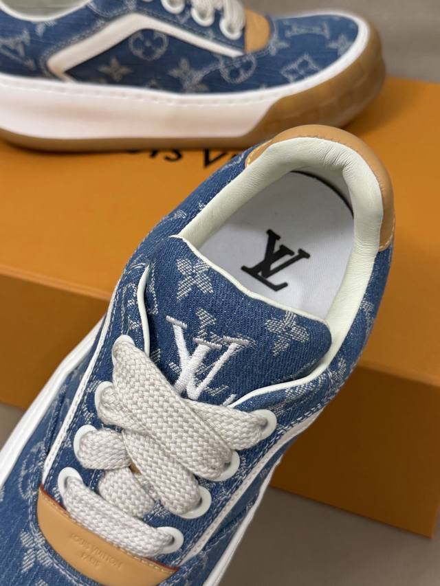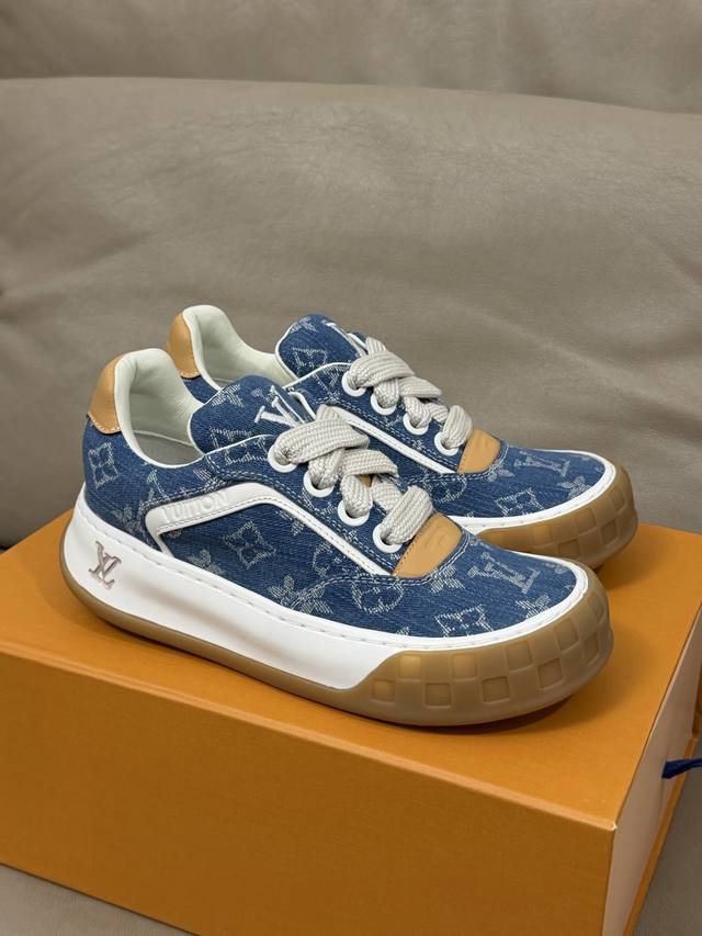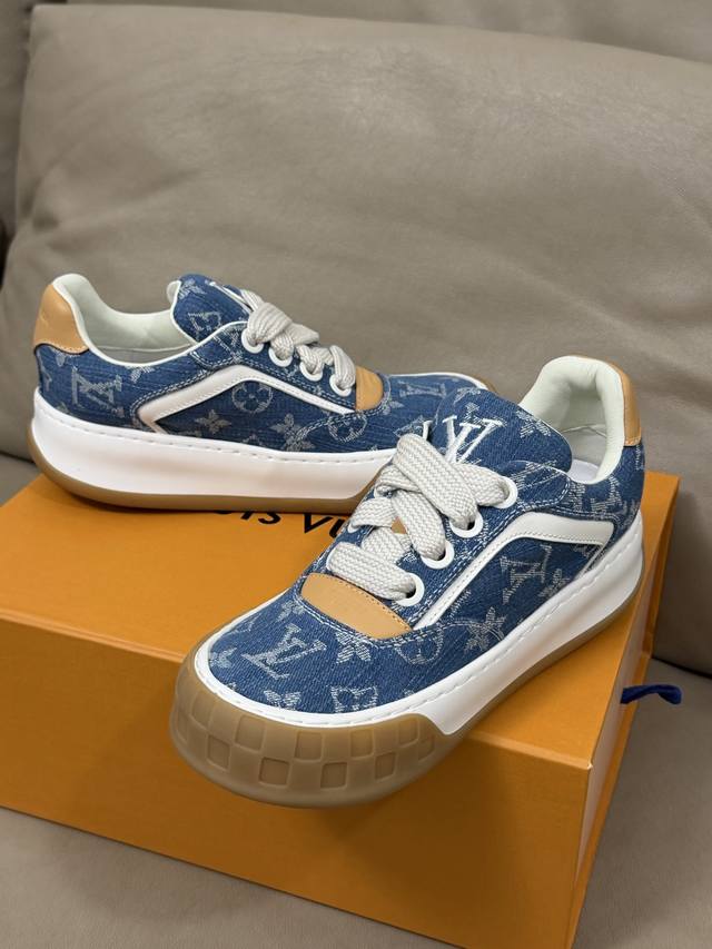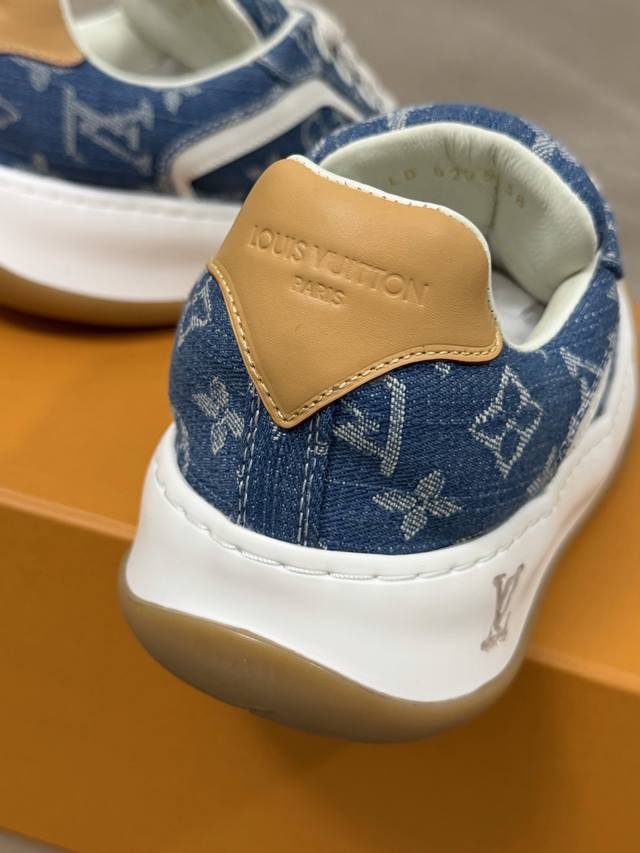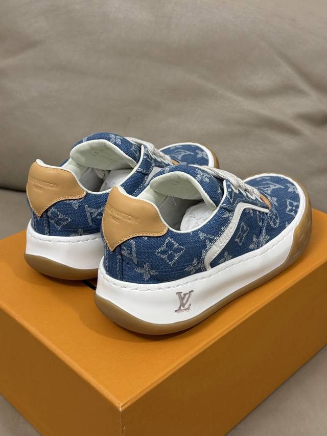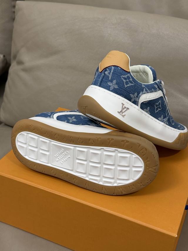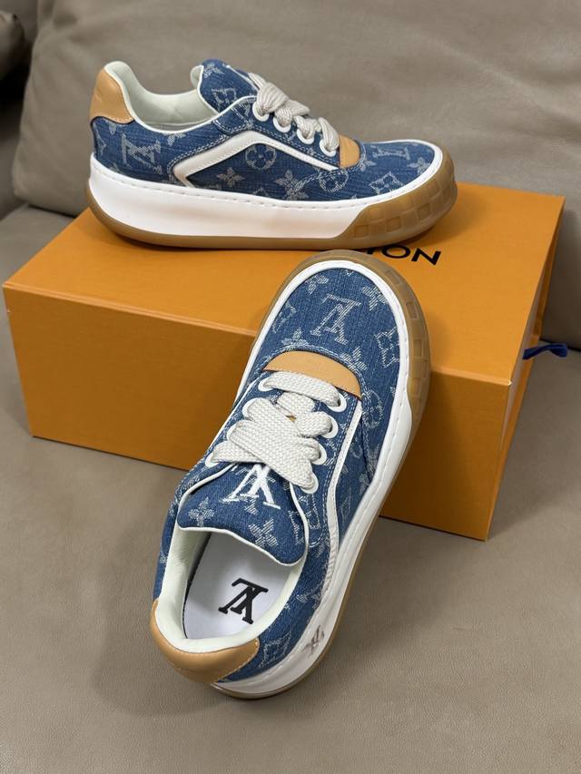 Lv Tilted Suede Sneakers, Couple Style. It seems to be the same style worn by Gong Jun. At first glance, it looks a bit like Sunnei's chunky sneakers? Haha! These shoes are incredibly lightweight!! They feel very soft and light on the feet. The Lv Tilted men's sneakers feature a dark blue suede and white leather combination, with a Monogram embossed toe for high recognizability*. The thick sole and beige rubber outsole provide comfort and a subtle height boost! Combining retro and modern styles, they look great for everyday casual wear or street style, easily creating a fashionable look. Couple Size 35-45.