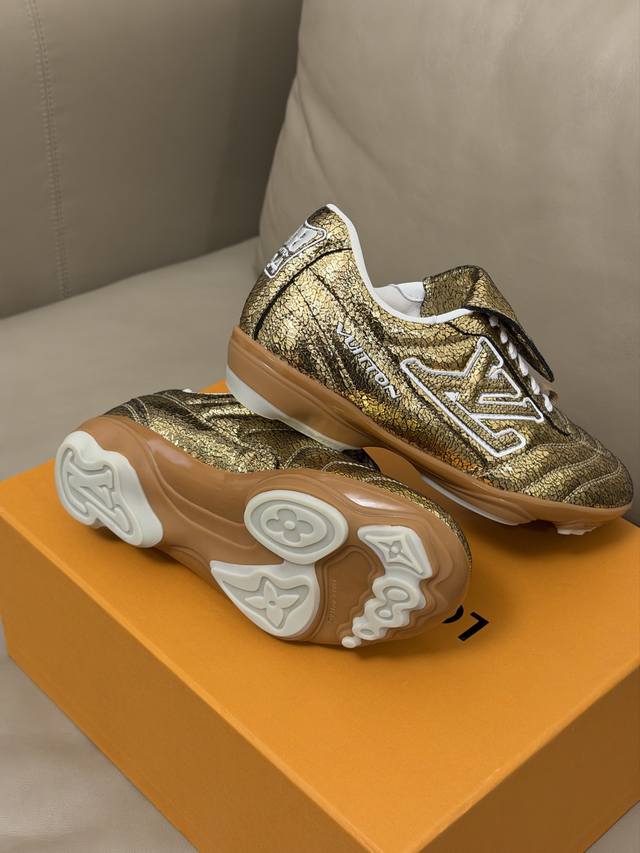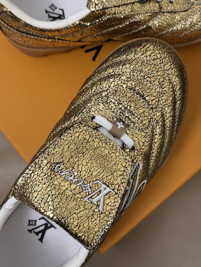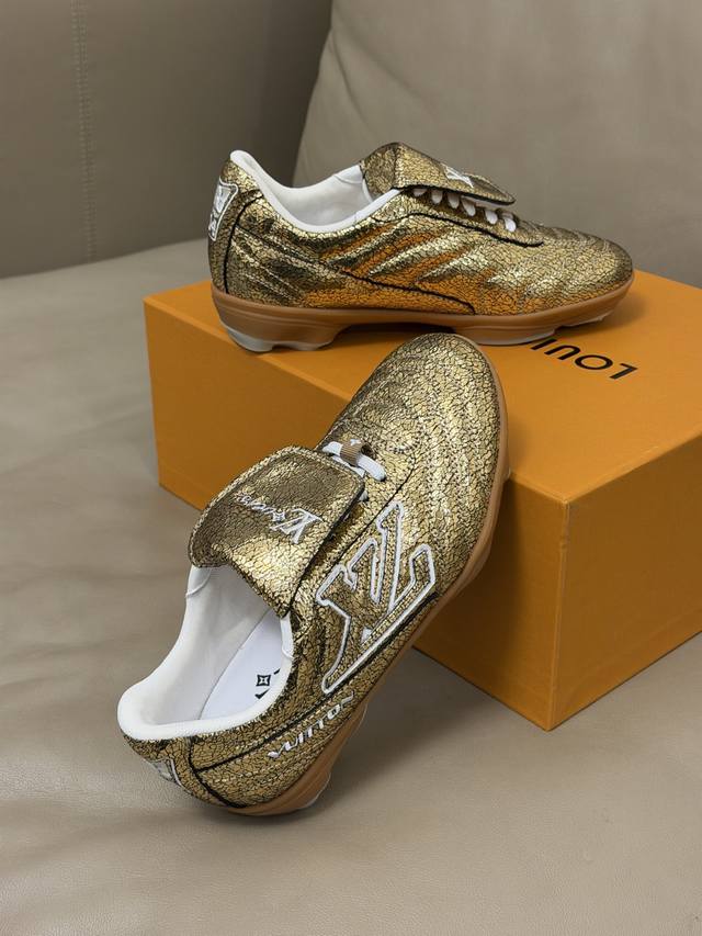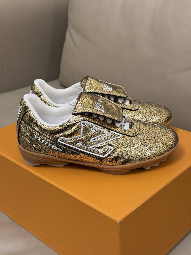 Lv X pharrell New Footprint Football Boots - New Colorways Ddd. Louis Vuitton menswear under pharrell's leadership has released another "hot item," this time injecting a cool gene into the football boot category. Ddd The new colorways include black, silver, and gold. The most eye-catching feature is the cracked texture material, giving it a vintage, distressed look. The iconic LV logo is embedded in the shoe with three-dimensional lines, paired with a Velcro closure, preserving the functionality of a football boot while maximizing LV's luxurious feel, transforming a sporty item into a "styling tool" for everyday wear. Ddd As a representative of high-end luxury brands venturing into the football boot field, this series thoroughly embodies the concept of "luxury sports": it meets the practical needs of football scenarios while also becoming an eye-catching highlight in one's outfit. Ddd Couple sizes 35-45 DDD