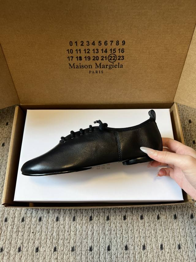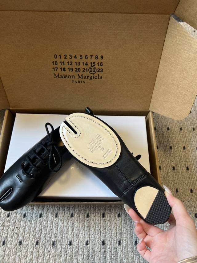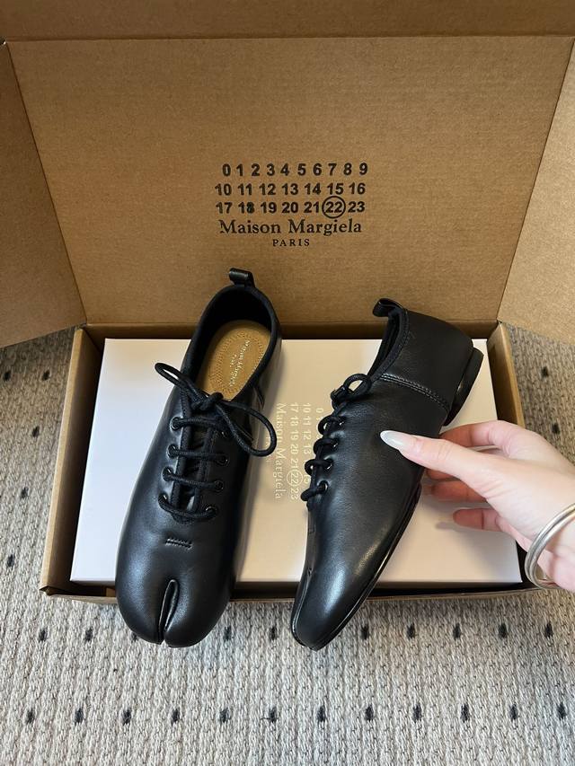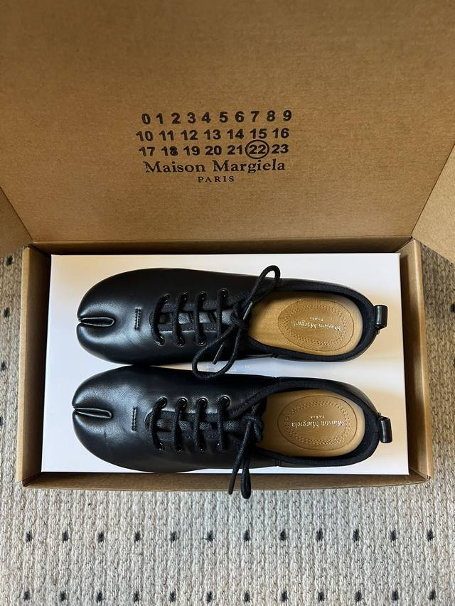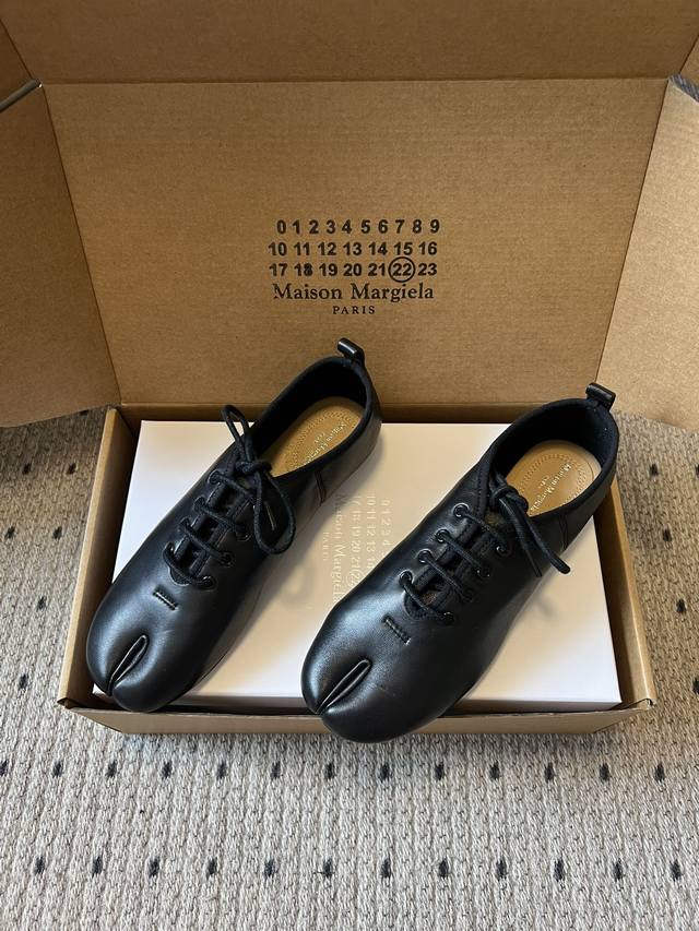 Maison Margiel* Low-top Flat Lace-up Casual Shoes with Split Toe DDD The Tabi toe design, originating from Japanese tabi socks, is a key identifying feature, dividing the toe in two and representing one of the brand's most iconic design languages. Materials include smooth leather and suede; the brand also uses high-end leathers such as sheepskin and horsehide. Some styles incorporate distressed or patchwork techniques. DDD The low-top, lace-up silhouette features flat, waxed laces. The shoe body has minimal embellishment, with only a subtle brand logo on the tongue. The shoe box is printed with the brand's signature numerical code, enhancing brand recognition. DDD Upper: Sheepskin Ddd Lining: Sheepskin Ddd Outsole: Genuine Leather Outsole Ddd Height Increase: 1cm Ddd Size: 35-40, Size 40 (custom sizes, no returns or exchanges) Ddd DDD