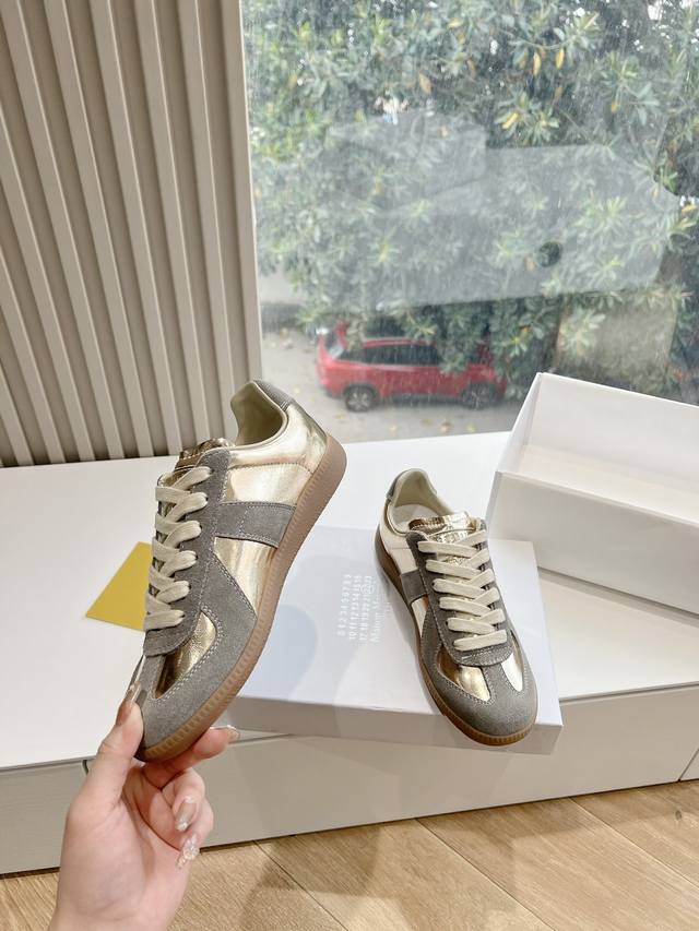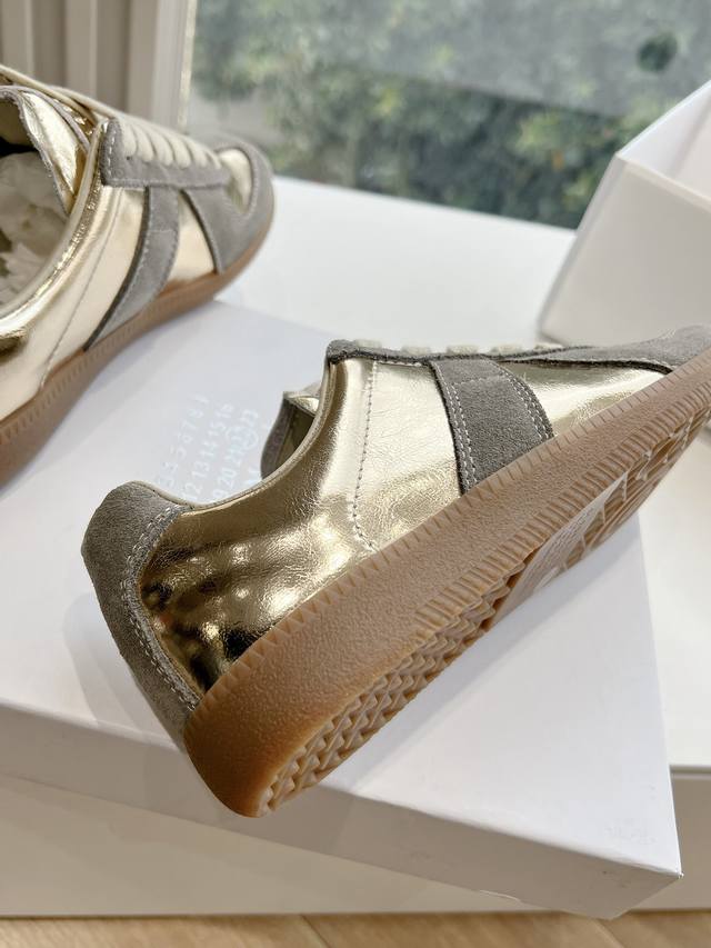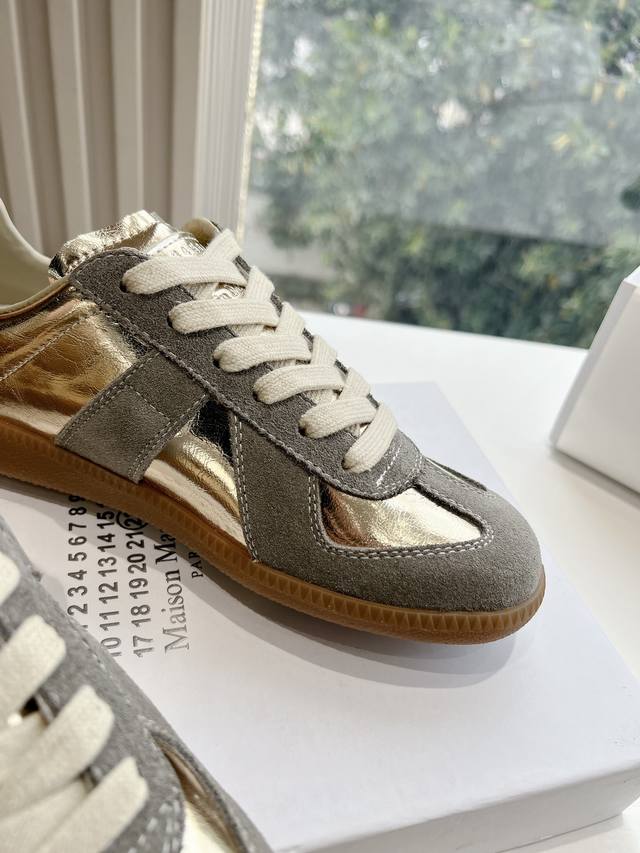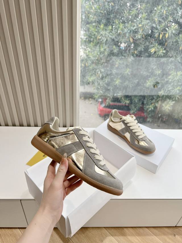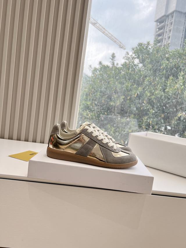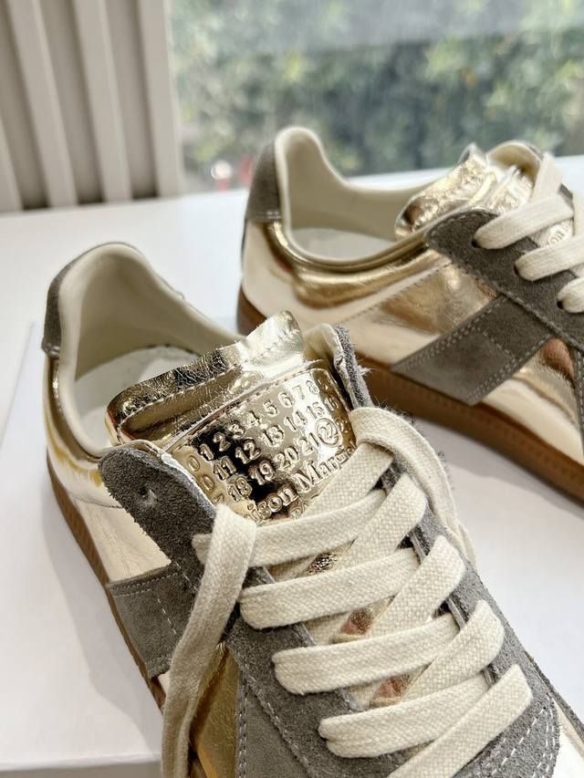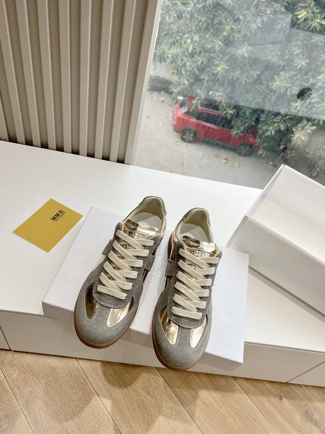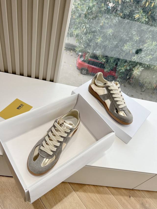 Maisonmargiela Mm6 German training casual shoes, a designer brand known for its innovative designs. A mid-range luxury brand, these shoes are incredibly versatile and comfortable. This German training shoe continues the classic T-shaped genuine leather patchwork design, meticulously refined by the design team to give you the most authentic military feel. The soft and delicate texture of top-grain cowhide combined with the texture of suede provides both exceptional softness and comfort while maintaining good breathability. Comfort and quality go hand in hand, easily adaptable to any season and any outfit. Material: Cowhide. Sizes: 35-40 (Women's 39, Men's 45).