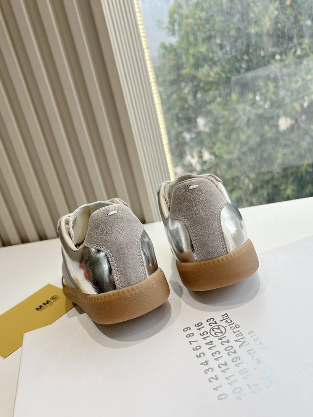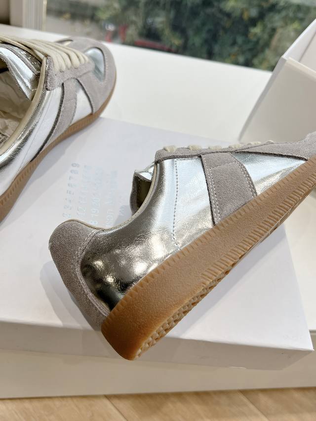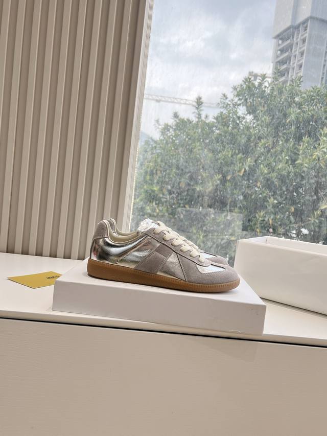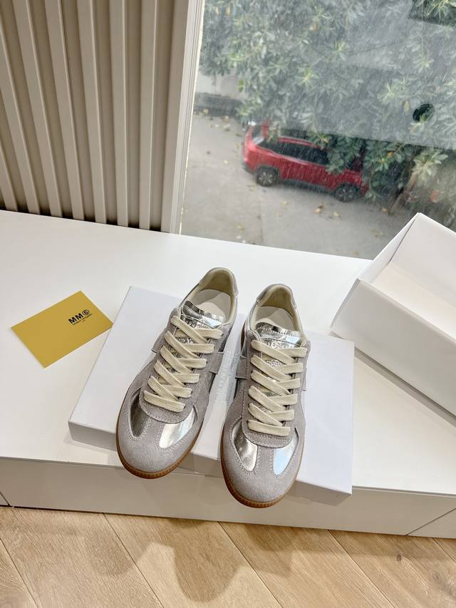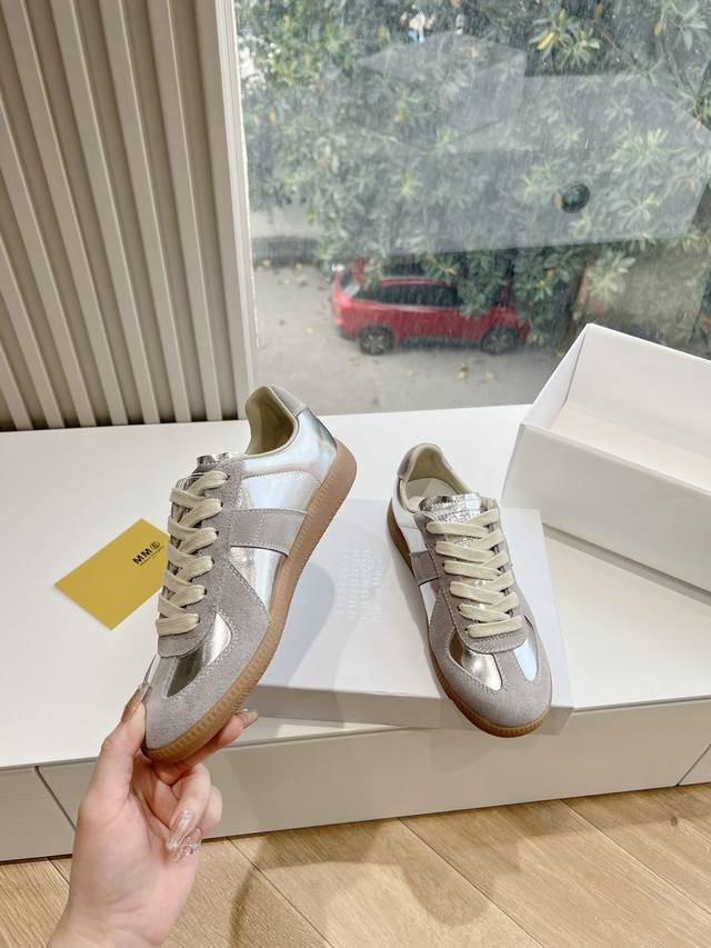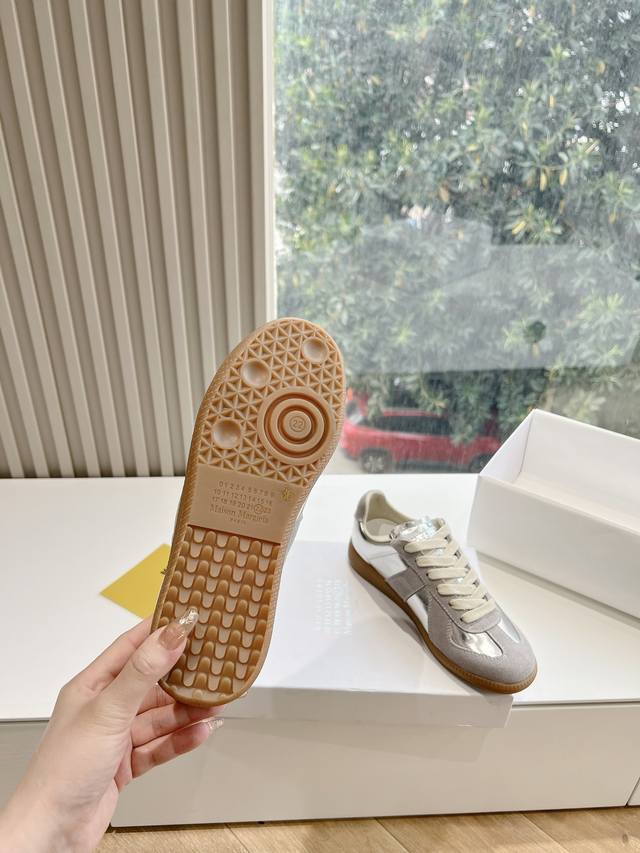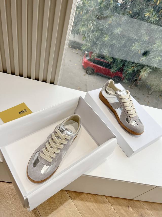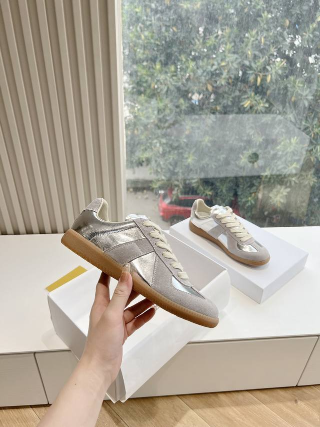 Maisonmargiela Mm6 German training casual shoes, a designer brand known for its innovative designs. A mid-range luxury brand, these shoes are incredibly versatile and comfortable. This German training shoe continues the classic T-shaped genuine leather patchwork design, meticulously refined by the design team to give you the most authentic military feel. The combination of soft, supple top-grain cowhide and the texture of suede provides exceptional softness and comfort while maintaining good breathability. Comfort and quality go hand in hand, easily adaptable to any season and any outfit. Material: Cowhide. Sizes: 35-40 (Women's 39, Men's 45).