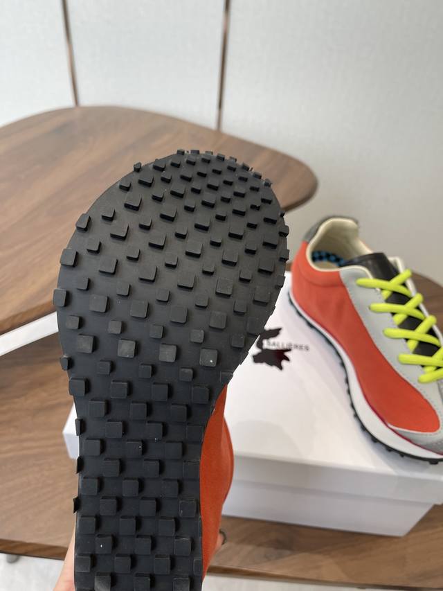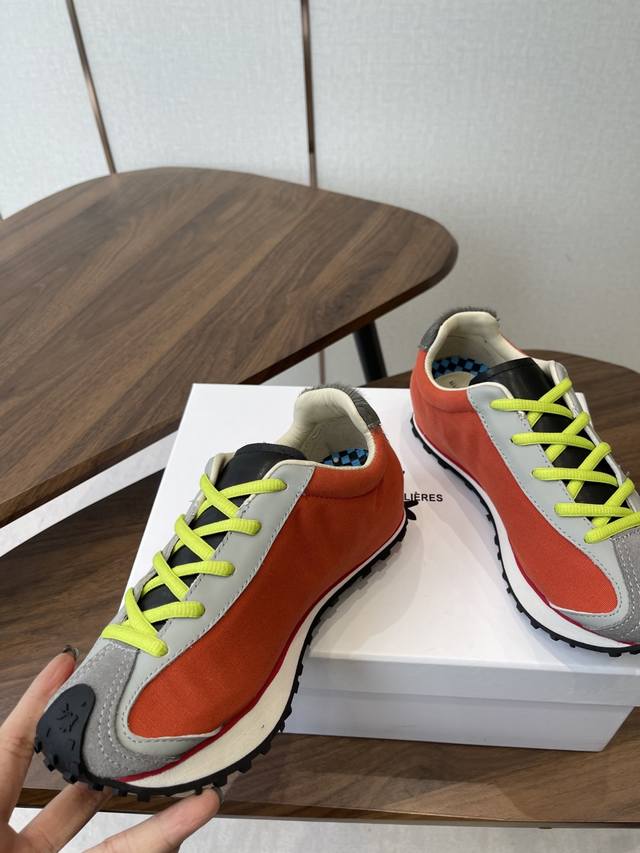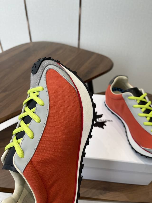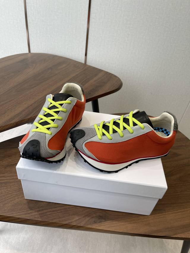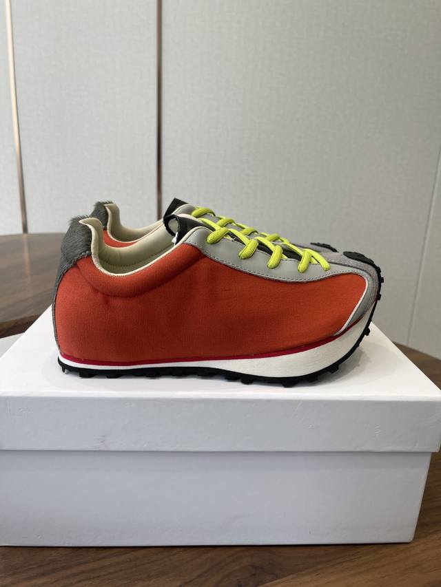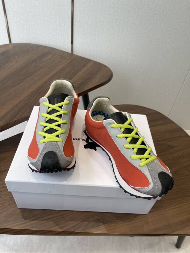 Martin Sallieres Retro Forrest Gump Sneakers, Racing Shoe Style, DDD. Featuring a retro streamlined upper combined with a color-blocked design, these sneakers blend the classic silhouette of the Forrest Gump shoe with the dynamic elements of racing shoes, resulting in a retro yet trendy look. Multiple color options are available, including green, white, and red color blocking; all-black with white laces; beige and brown with blue laces; and orange and grey with fluorescent green laces, creating a strong visual impact. The upper uses different textured materials, with a checkered detail on the inside of the tongue. The laces contrast with the upper, and the durable rubber sole balances style and practicality. The shoe features the brand logo inside. The overall design leans towards a niche, affordable luxury style of sporty fashion, differentiating itself from the conventional styles of mainstream sports brands. DDD Upper: Cowhide and fabric DDD Lining: Sheepskin DDD Outsole: Foamed rubber combination DDD Height increase: 4cm DDD Size: 35-45, sizes 40 and 41 are custom-made and non-refundable DDD