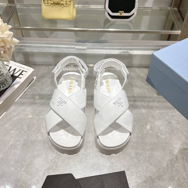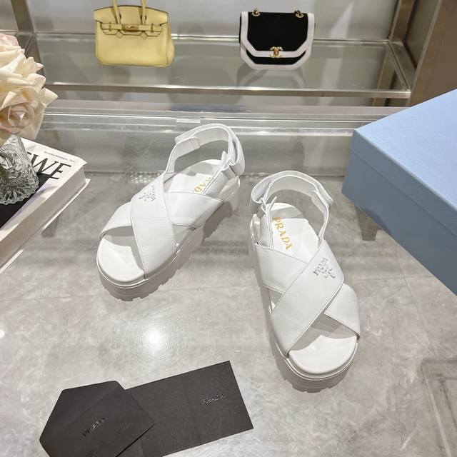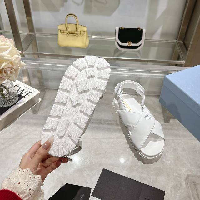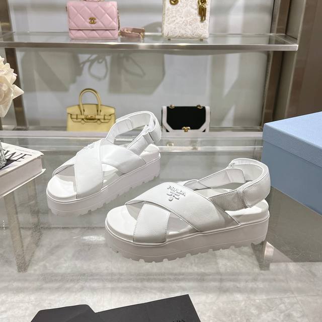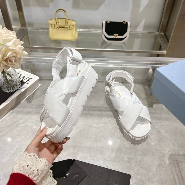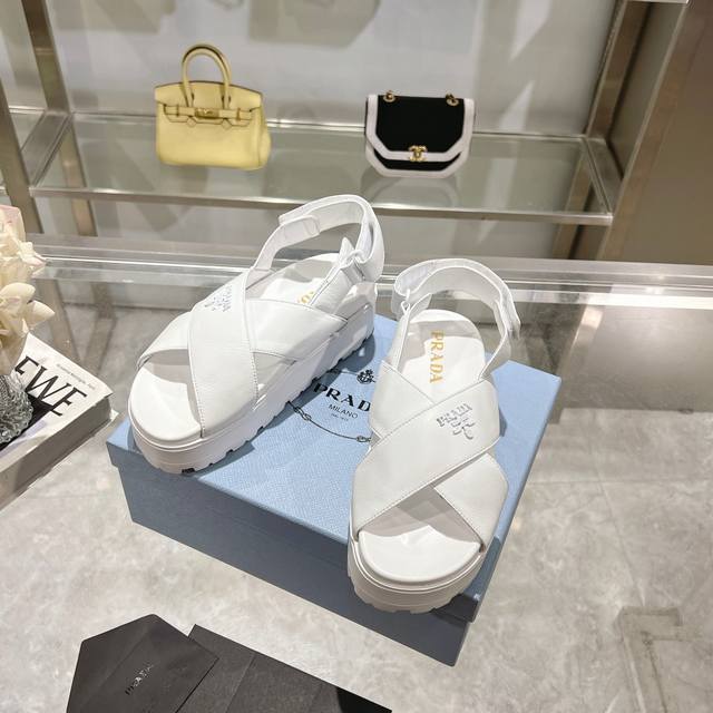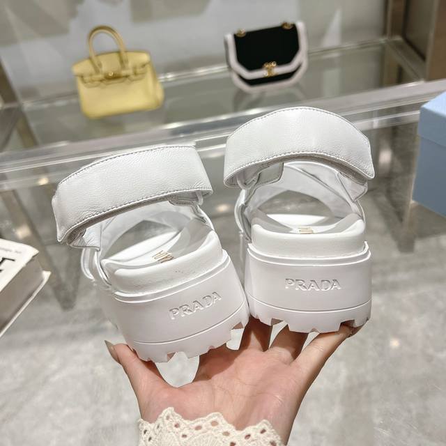 The latest Prada sandal is made of summery woven fabric, which is more modern and sporty, making the whole design unique. This very versatile shoe features hook-and-loop straps and a embossed sole with an enameled metal triangle logo.