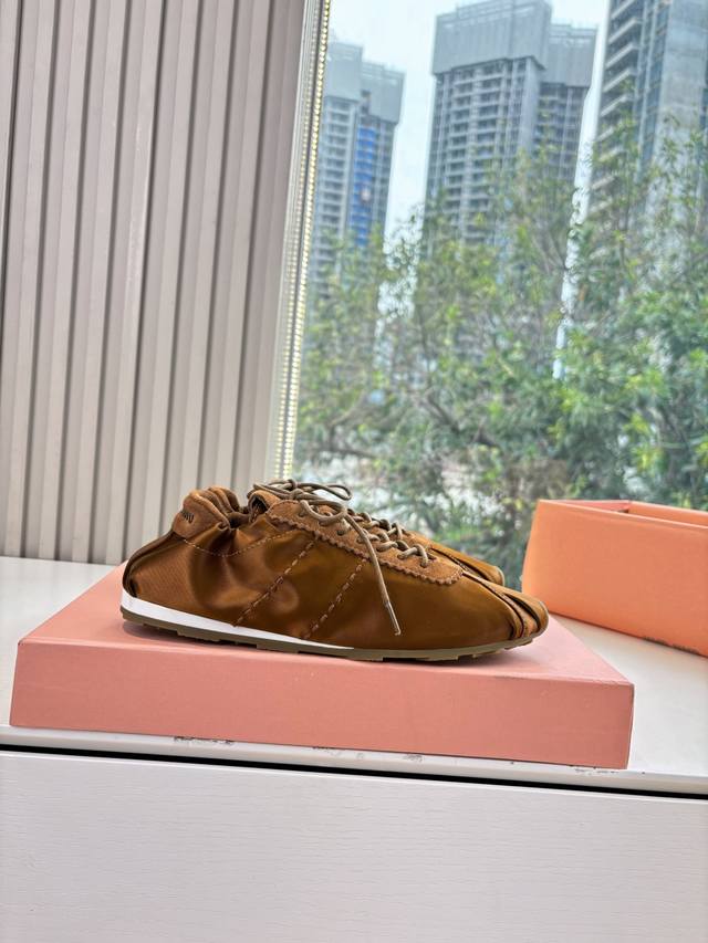 Miumiu Spring/Summer Latest Runway Style Thin-Soled Casual Shoes This is a super popular choice among celebrities, influencers, and bloggers worldwide, especially on Xiaohongshu (Little Red Book). Retro yet stylish, these shoes look amazing on! The simple athletic design and distinctive tongue create a relaxed and sweet casual style. They exude confidence and are easy to match with any outfit