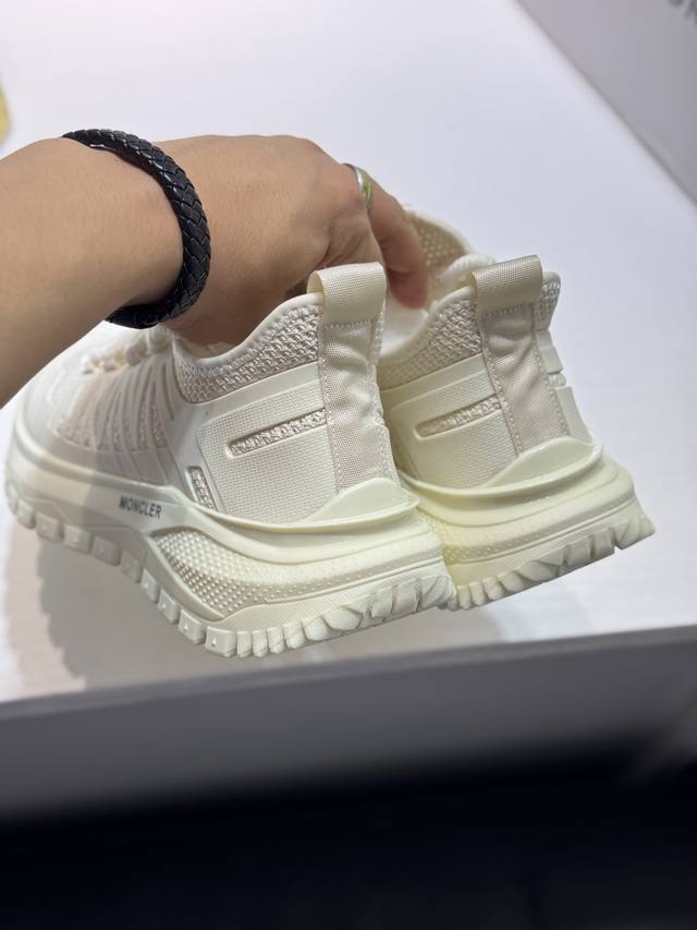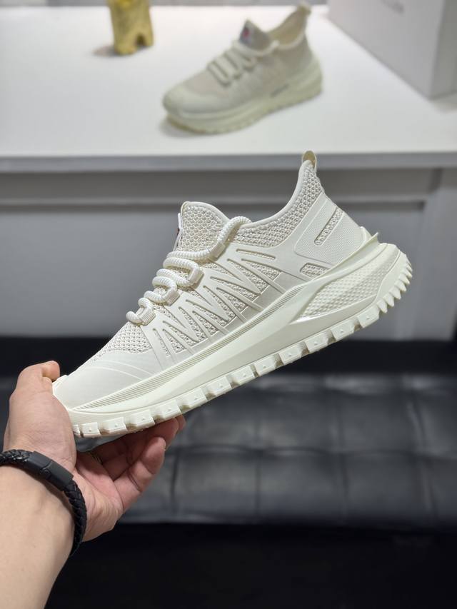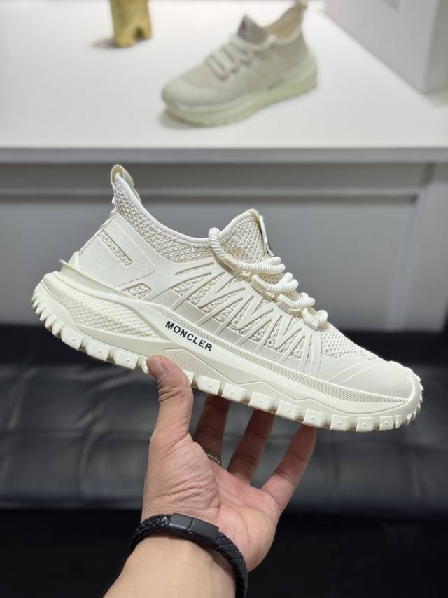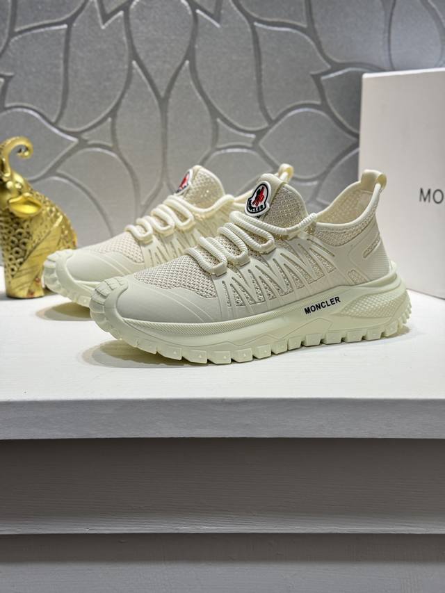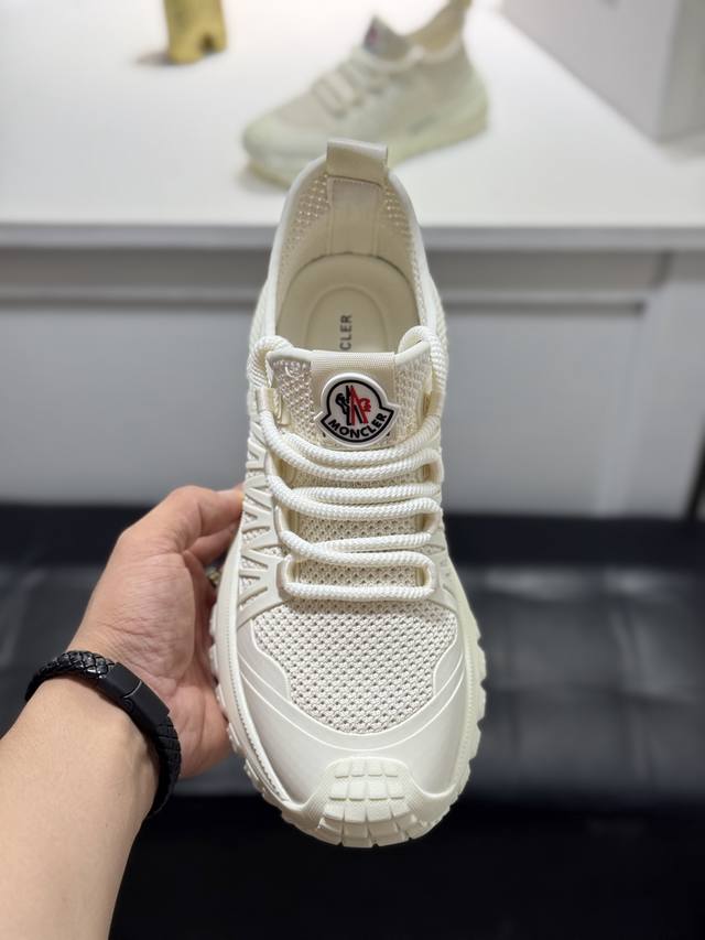 Moncler men's casual sneakers, featuring a comfortable, non-slip mesh upper, combine innovation, functionality, and graphic details for a stylish and fashionable look. The outsole is molded from high-elastic rubber, offering high elasticity and wear resistance for enhanced comfort. Sizes: 38-44, 45, customizable.