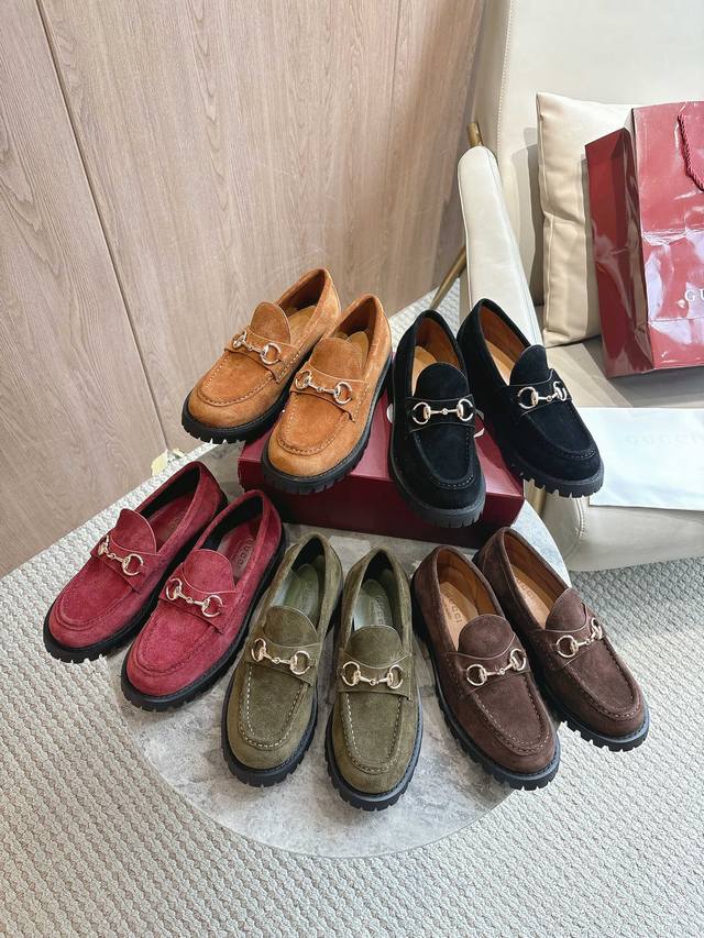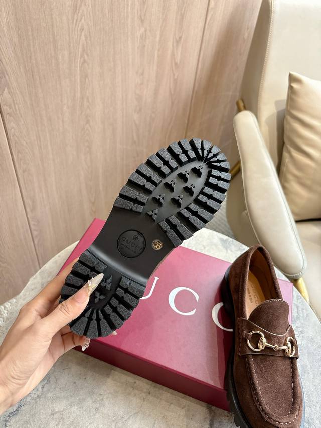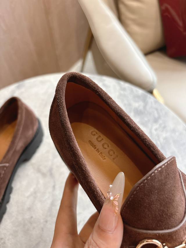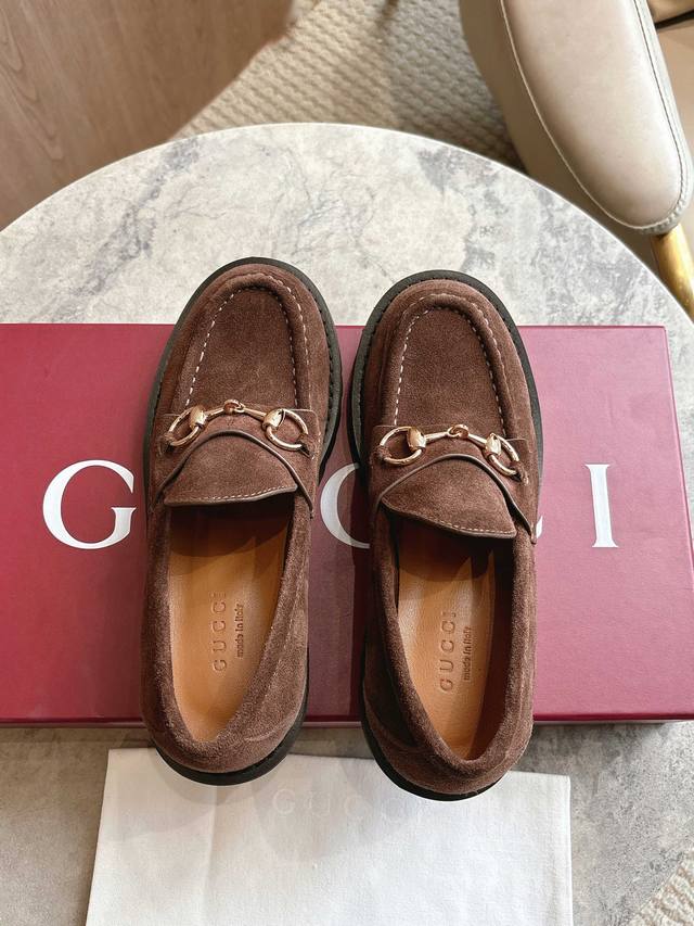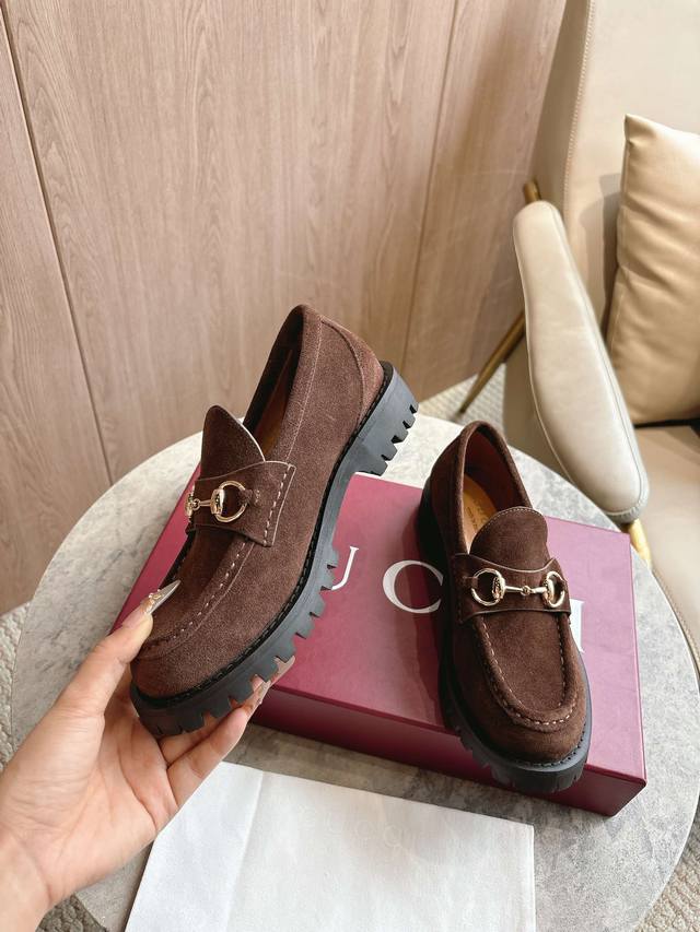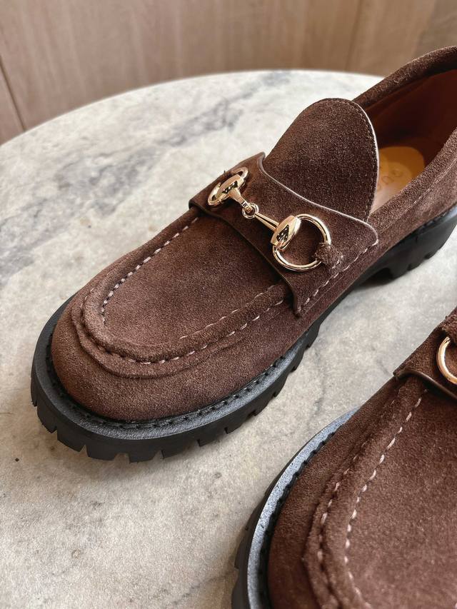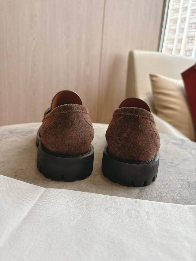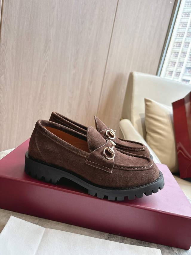 0453-8 Brown 35-42 Subtle details imbue these loafers with an elegant touch. Crafted from smooth suede, they sit atop a lug-grooved rubber sole, adding a touch of class. A light gold-toned horsebit adds a touch of brand identity to this classic yet modern design.