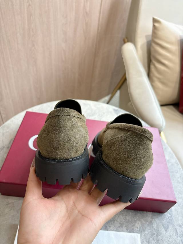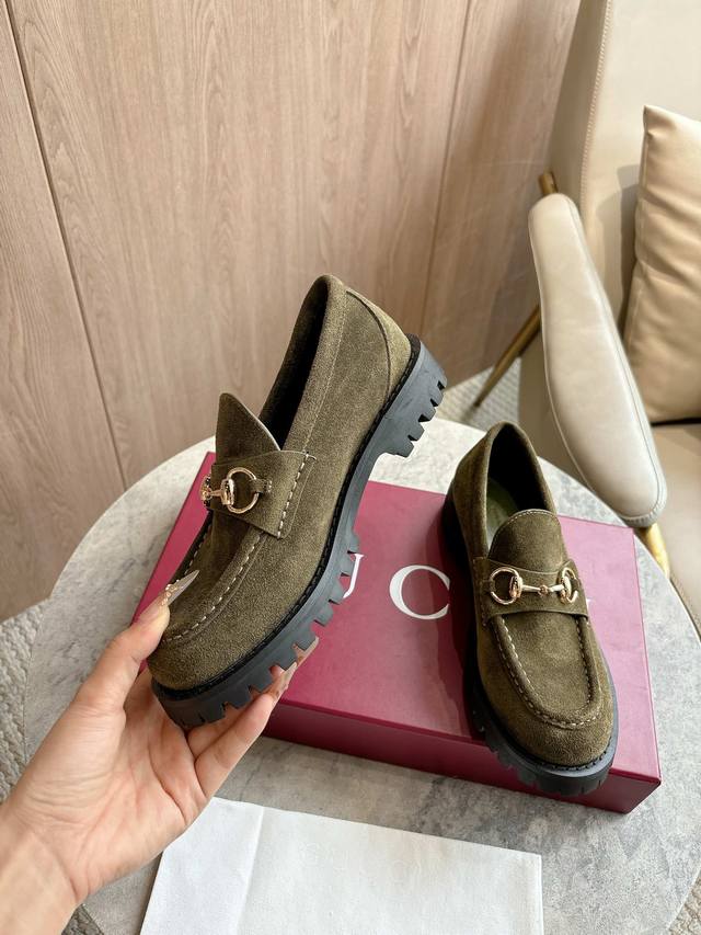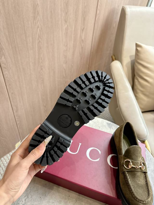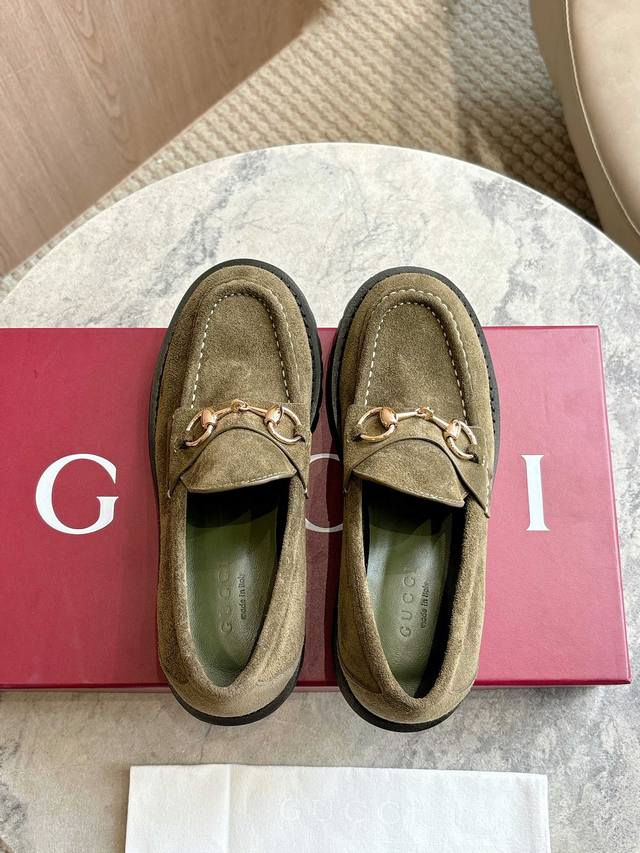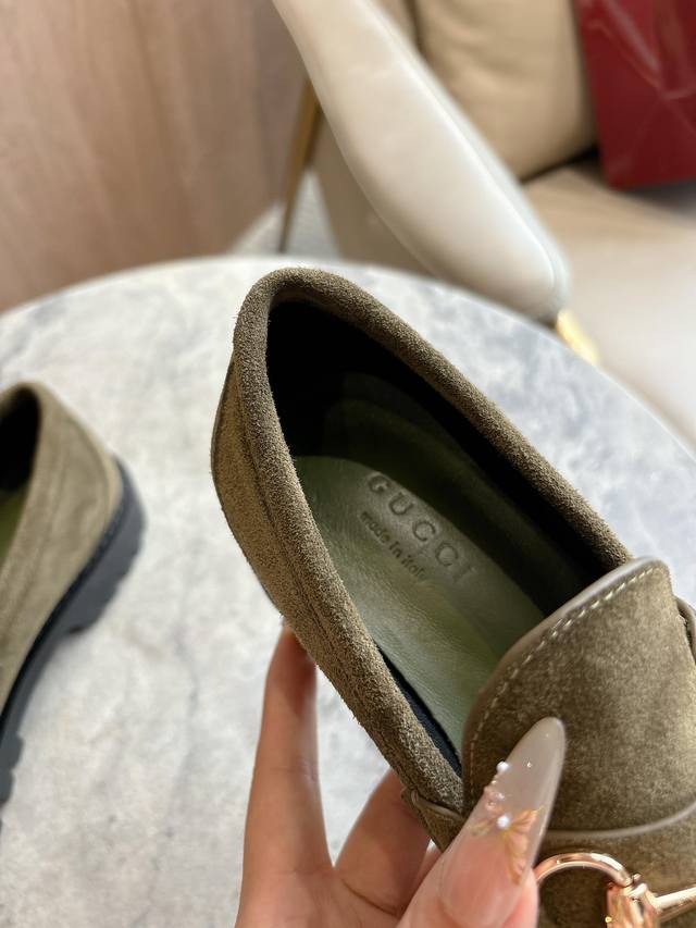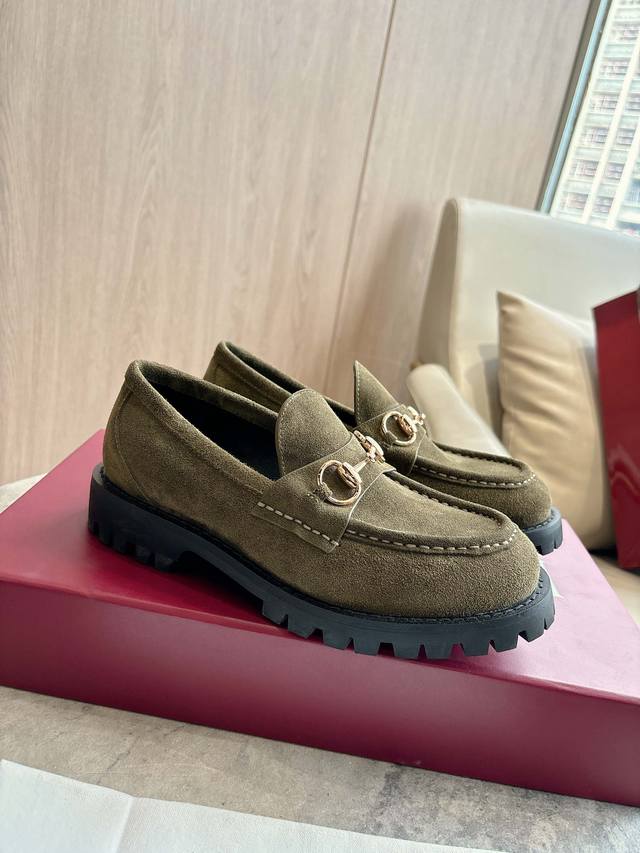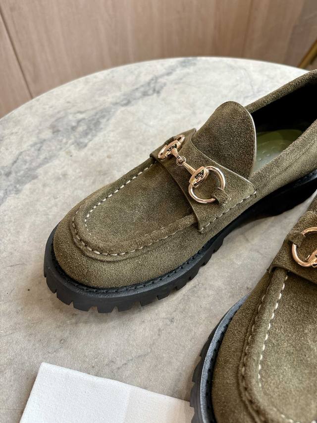 0453-8 Green 35-42 Subtle details add an elegant touch to these loafers. Crafted from smooth suede, they sit atop a lugged rubber sole, adding a touch of class. A light gold-toned horsebit adds a touch of brand identity to this classic yet modern design.