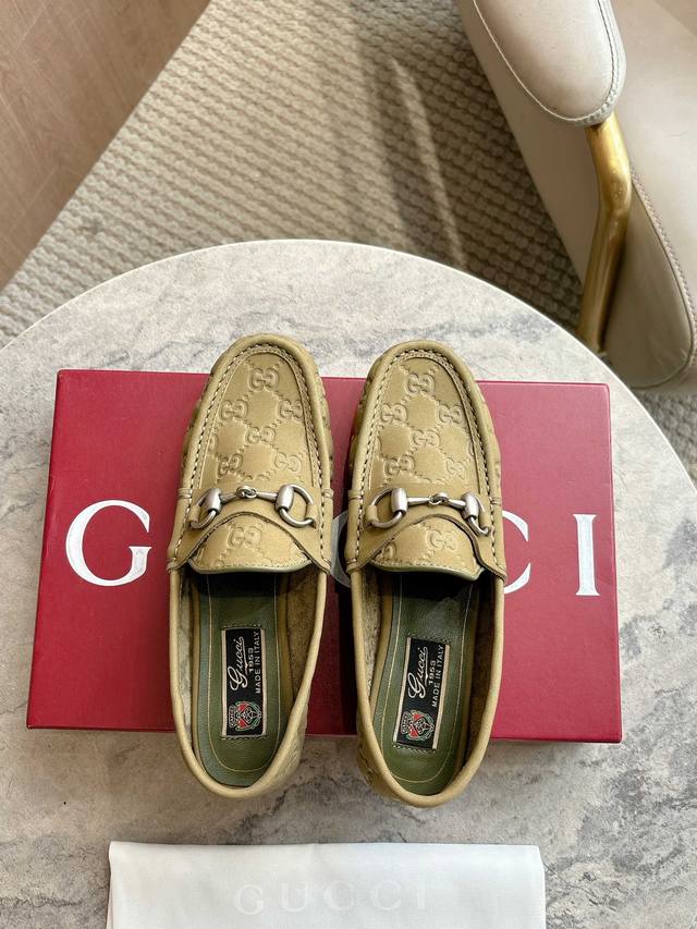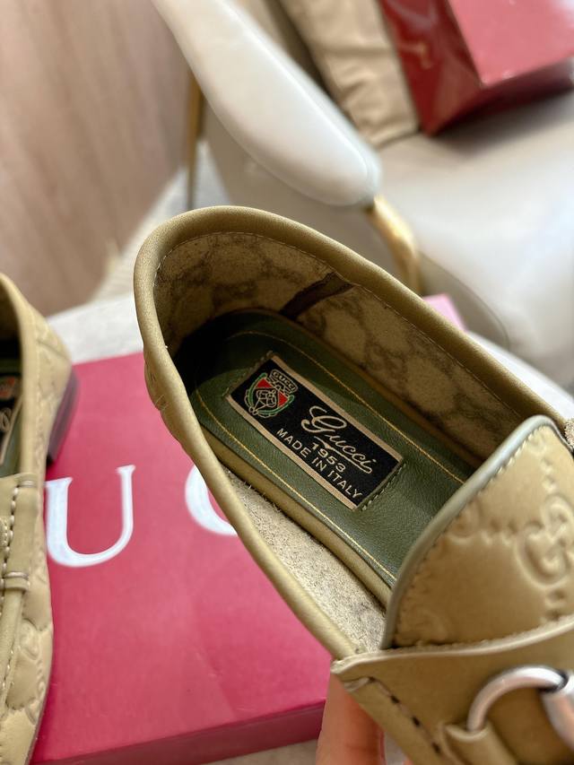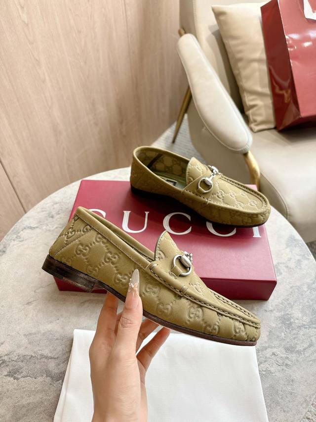 1054-2 Green 35-42 These women's loafers boast an elegant silhouette, crafted from exquisite Gg suede, offering a modern yet classic look. A chic horsebit accessory, shimmering in silver, adds a touch of glamour to the design. Green Gg suede, silver hardware, leather lining, horsebit, leather sole, heel height: 1.5 cm.