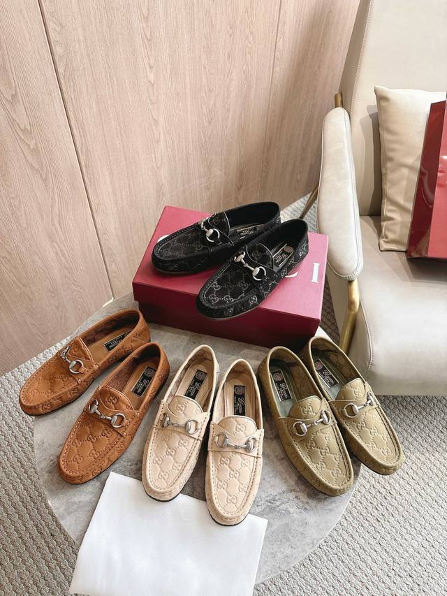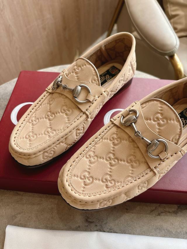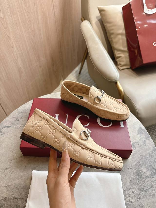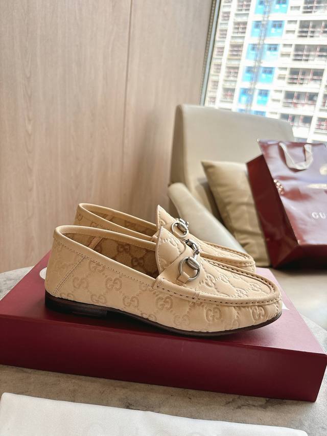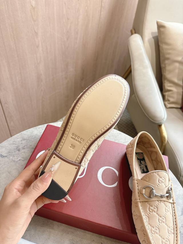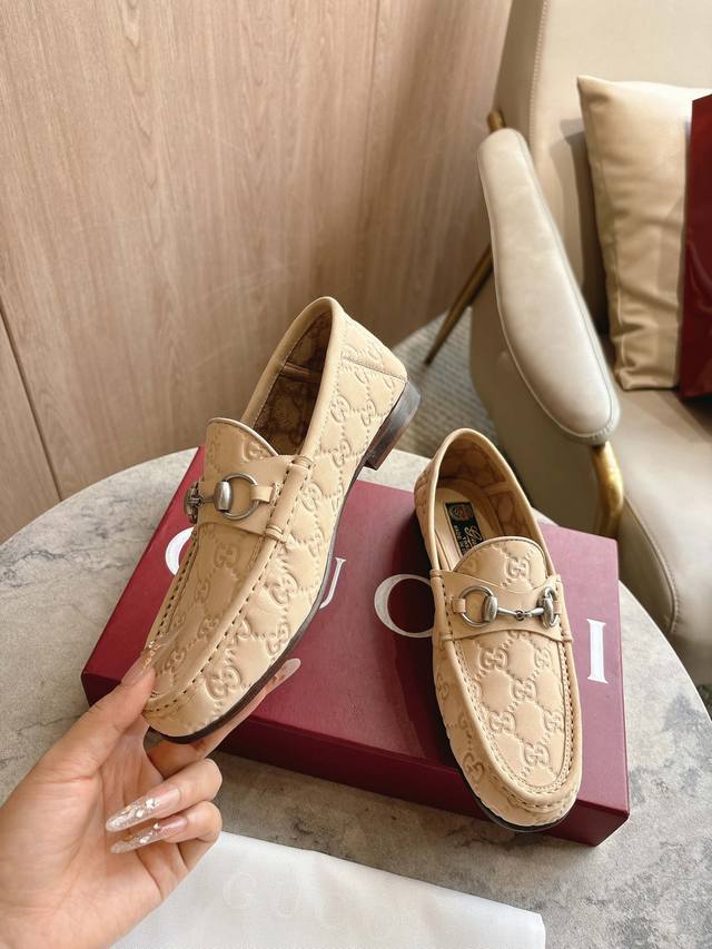 1054-2 Grey 35-42 These women's loafers boast an elegant silhouette, crafted from exquisite Gg suede, offering a modern yet classic look. A chic horsebit accessory, shimmering in silver, adds a touch of glamour to the overall design. Oatmeal Gg suede, silver hardware, leather lining, horsebit, leather sole, heel height: 1.5 cm.