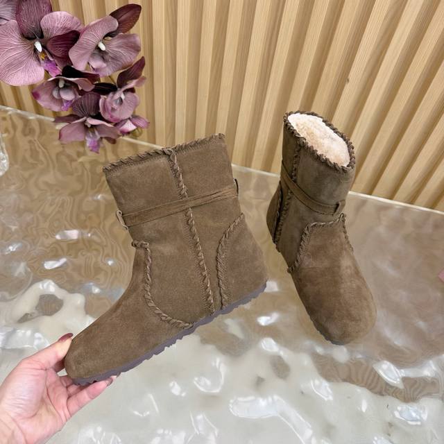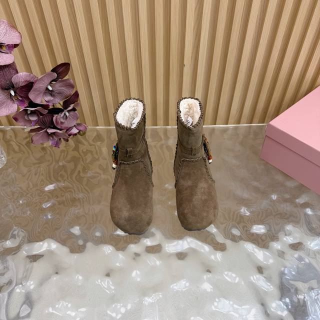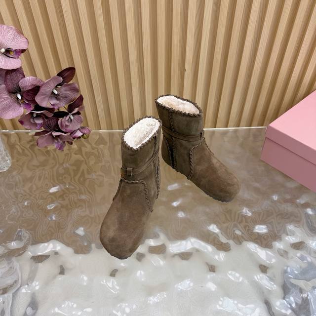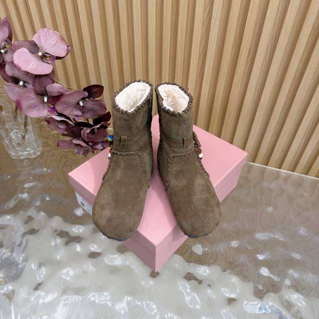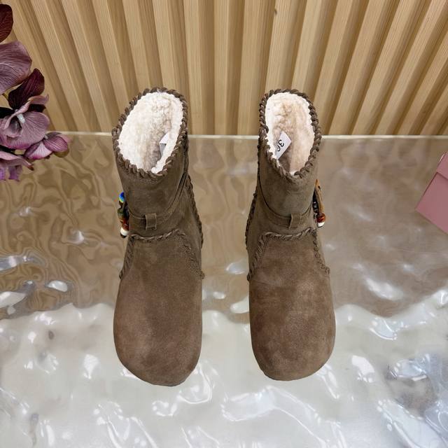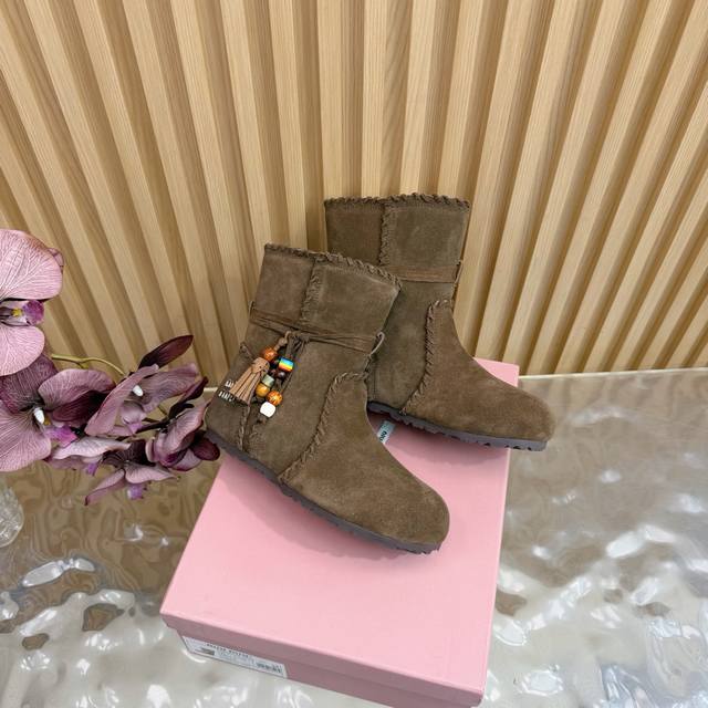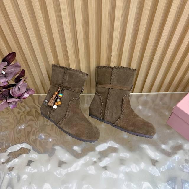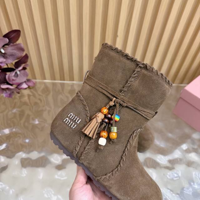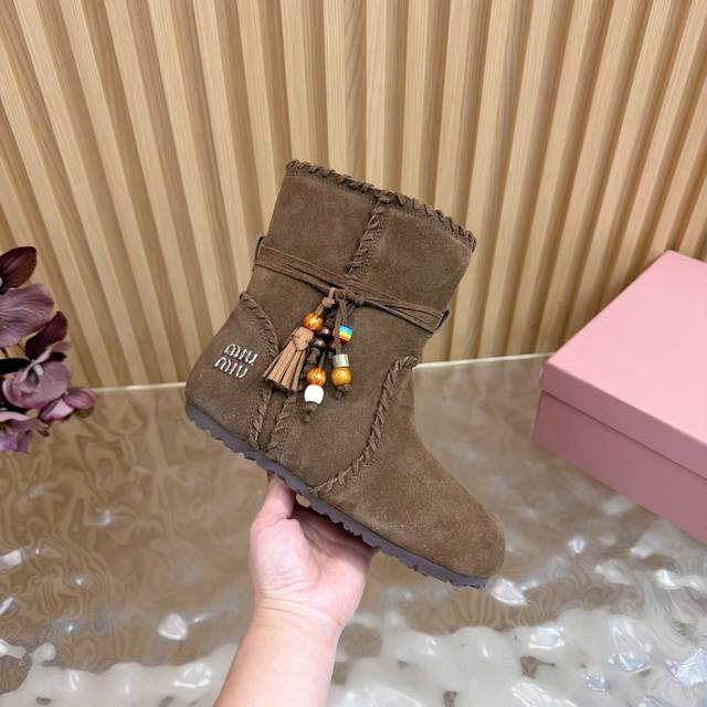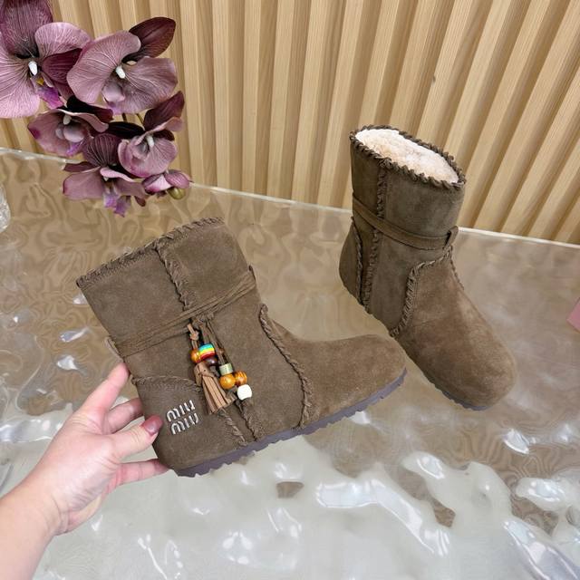 2025 Autumn/Winter New Miumiu Ethnic Bohemian Style Snow Boots/Fur Boots - A warm choice for sweet and cool girls this winter. These snow boots reach new heights of sweetness and coolness. From the design to the details, they perfectly balance girlishness and warmth. The silky suede fabric has a delicate and high-end feel, and the wool trim at the opening is fluffy and soft, visually very warm. They also flatter the ankle line, making the calves look slimmer. Suitable for everyday outings or winter commutes. Sizes: 35-40. Sizes 40 and 41 are custom-made.