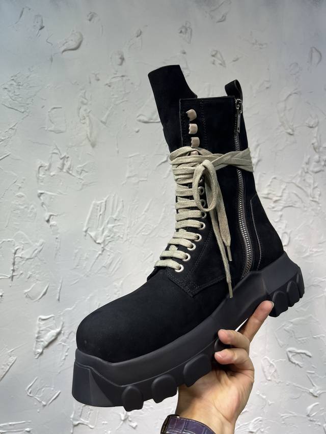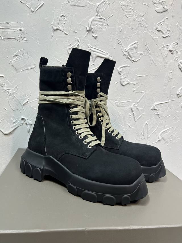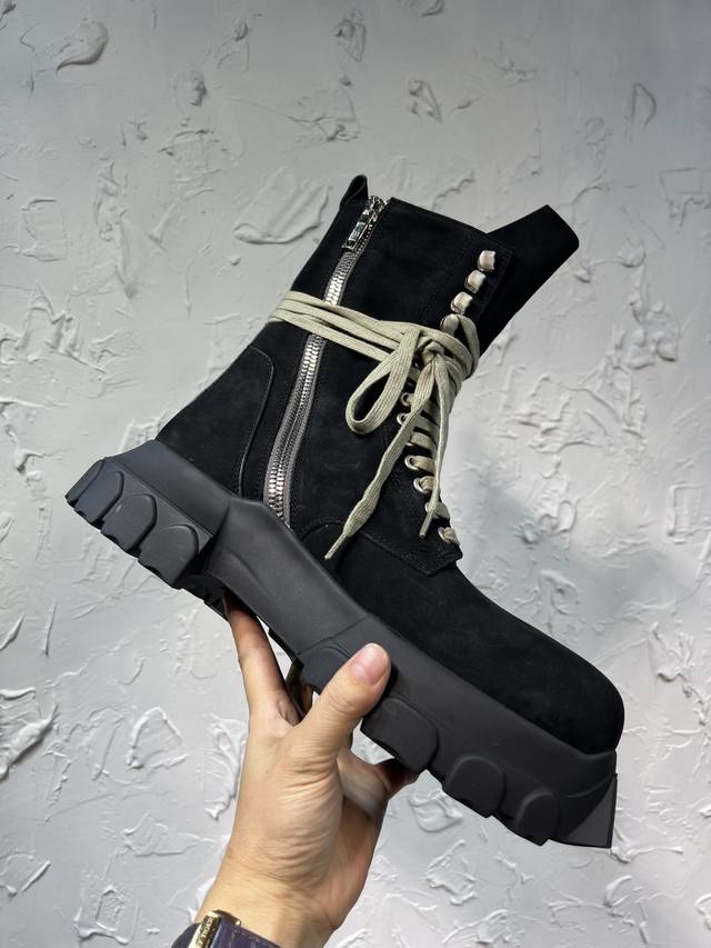 2025 Newest Rick Owens Black Porterville Army Mege Tracror Lace-up Zipper Mid-Length Boots for Men, Imported Cowhide Leather, Cowhide Leather Lining, Original Packaging. Sizes: 39-46.