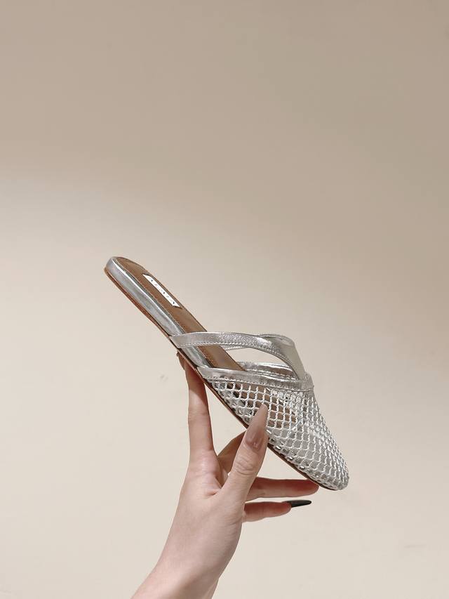 Alaia's latest slippers. Inspired by classic Japanese footwear, these slippers feature a mesh and patent leather upper, creating a simple yet elegant look that's versatile and stylish with every step. The avant-garde mesh upper highlights the exquisite craftsmanship and soft materials. The patent leather trim creates a casual yet elegant look, adding a touch of uninhibited flair to the already sweet silhouette. Sizes 35-41, 40, 41