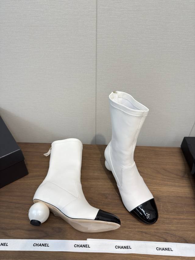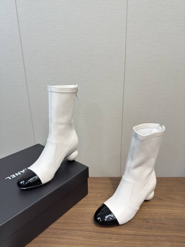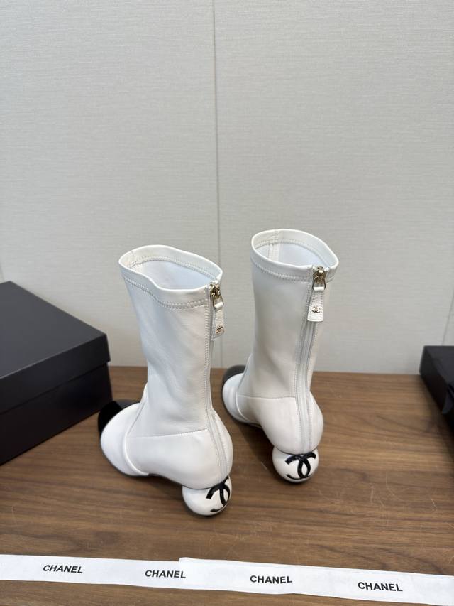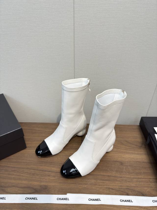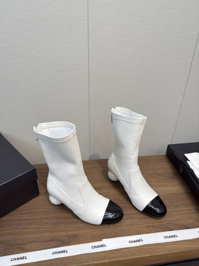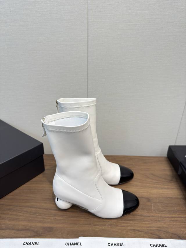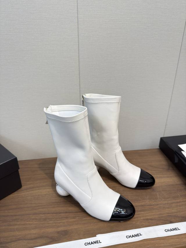25B Early autumn short boots catwalk stretch boots, lightweight and comfortable, unique Chanel pearl logo, large round heel pure sheepskin high version