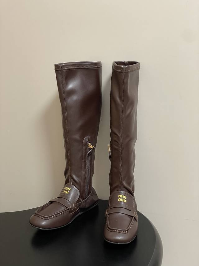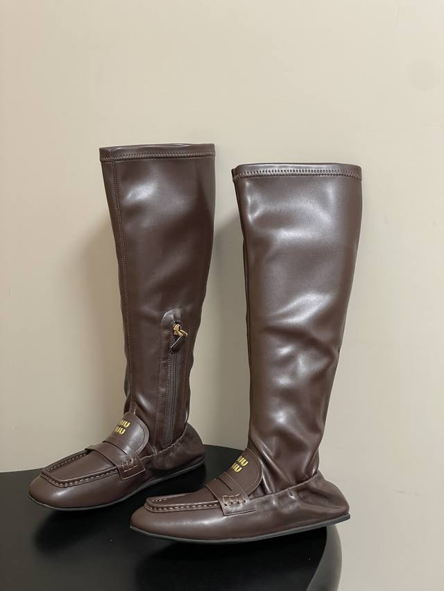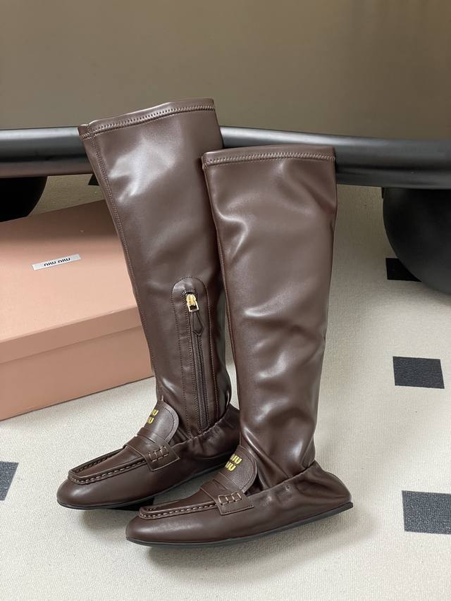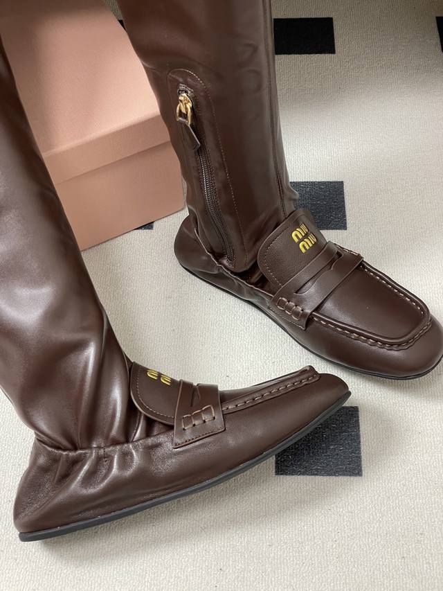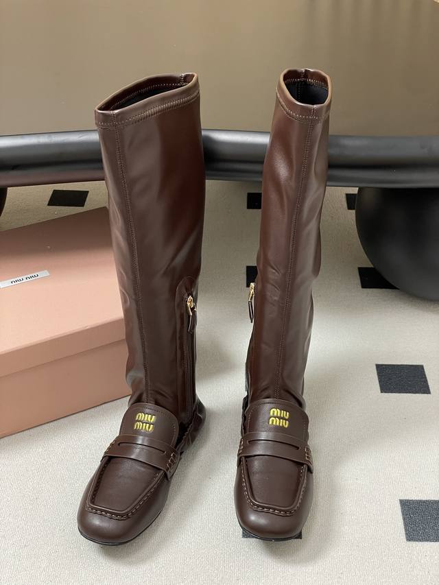 25Fw Autumn/Winter New Miu Miu Retro Square Toe Loafer Boots. These boots feature a square toe design, incorporating classic loafer elements. The prominent yellow " Miu Miu" logo on the upper enhances brand recognition. They are a sleek, tall style with a side zipper for easy on and off. The leather boot shaft has some stretch, conforming to the leg line. Pair them with skinny jeans or black leggings to highlight their sleek look. Complete the outfit with a short jacket or sweater for a cool, street-style vibe. They can also be paired with a dress for a "no-pants" look, showcasing a sweet and cool mix-and-match style, suitable for everyday wear or fashion parties.