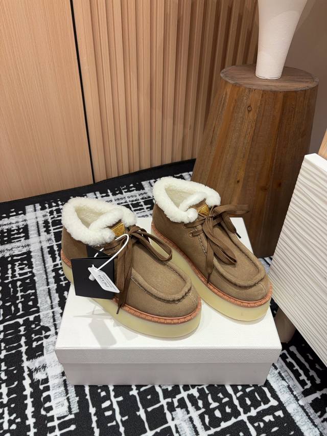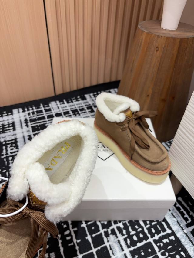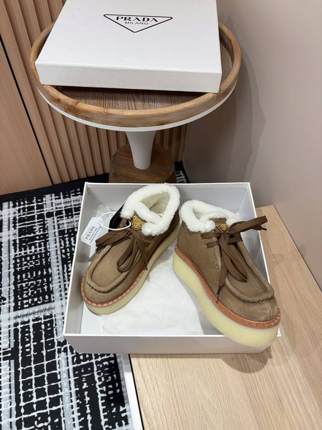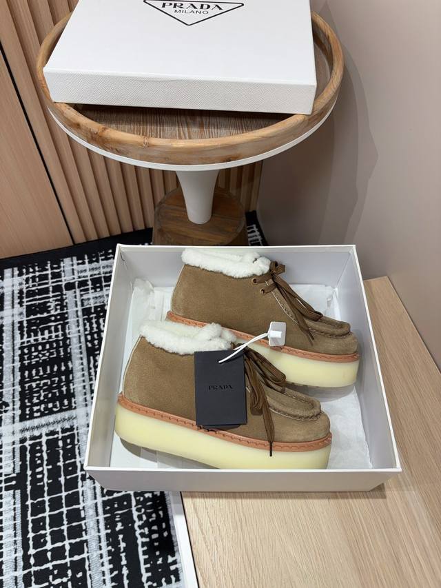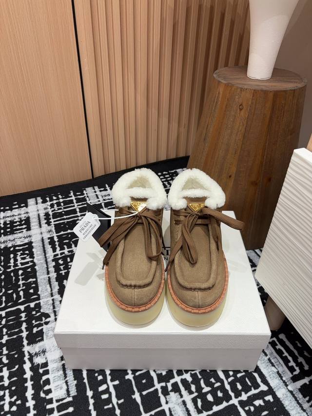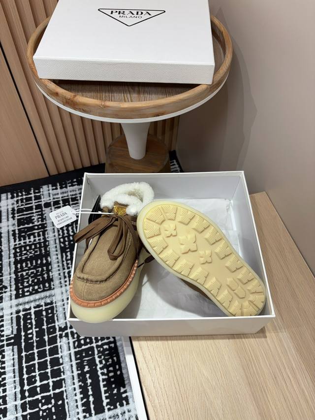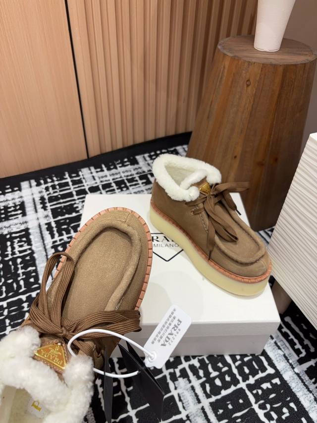 25Ss Autumn/Winter New Prada Triangle Logo Thick-Soled Ankle Boots Lace-up Snow Boots Ddd These simple thick-soled, fur-lined ankle boots are crafted from lamb's wool. The innovative triangle logo is reinterpreted as a classic element! Ddd Upper: Two-tone distressed calfskin Ddd Lining: Genuine lamb's wool Ddd Sole: TPU sole with genuine leather welt Ddd Sizes: 35-39 40, 41 Custom orders are non-refundable Ddd
