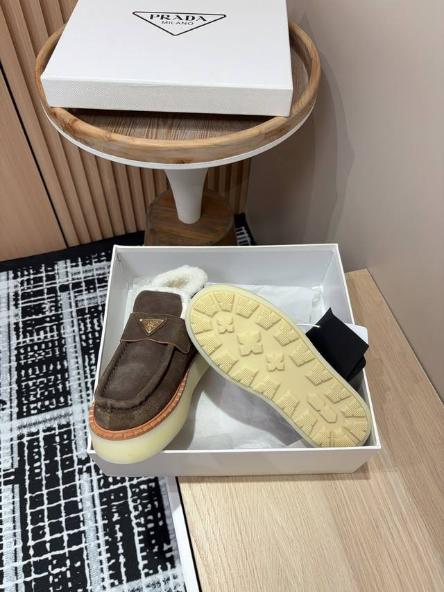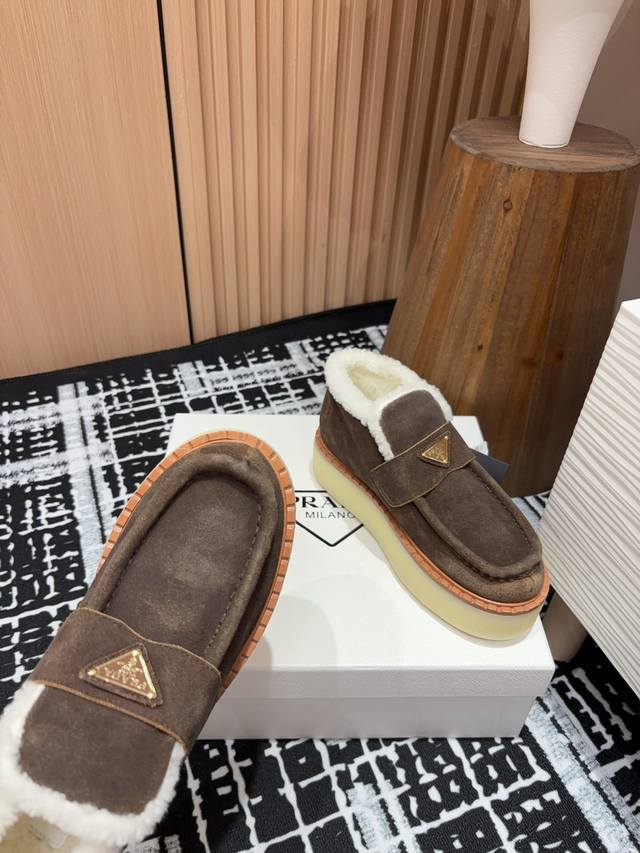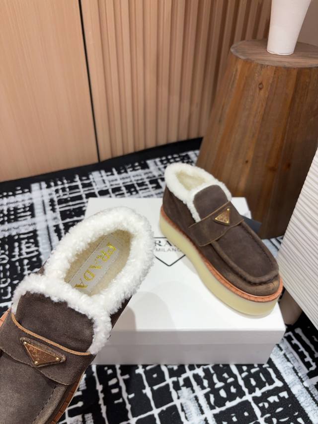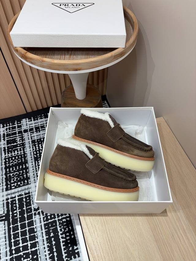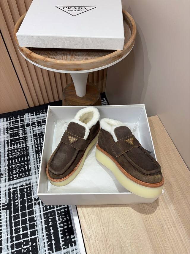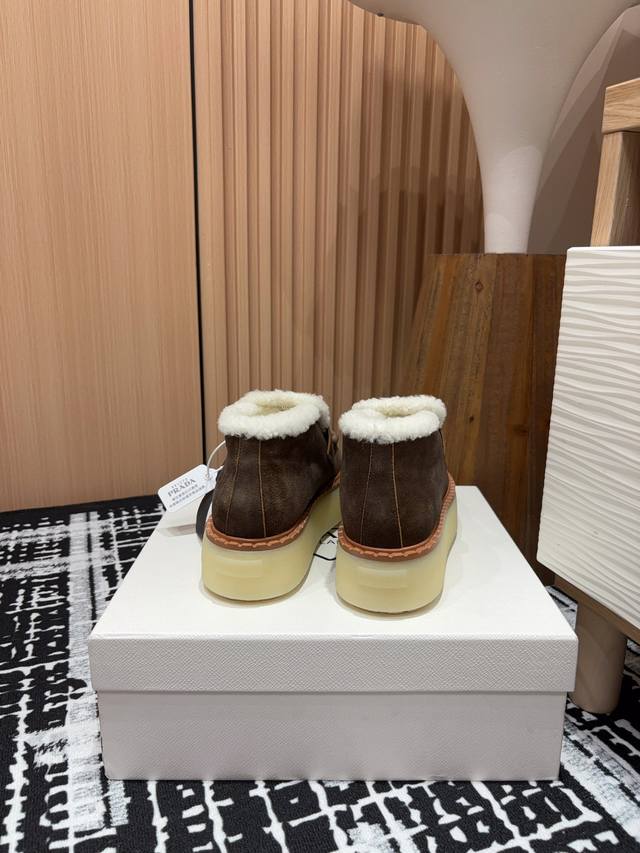 25Ss Autumn/Winter New Prada Triangle Logo Thick-Soled Ankle Boots Lace-up Snow Boots Ddd These simple thick-soled, fur-lined ankle boots are crafted from lamb's wool. The innovative triangle logo is reinterpreted as a classic element! Ddd Upper: Two-tone distressed calfskin Ddd Lining: Genuine lamb's wool Ddd Sole: TPU sole with genuine leather welt Ddd Sizes: 35-39 40, 41 (Custom orders are non-refundable/non-exchangeable) Ddd