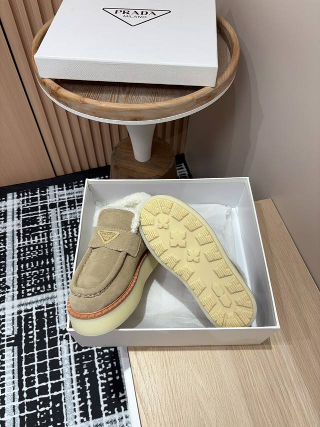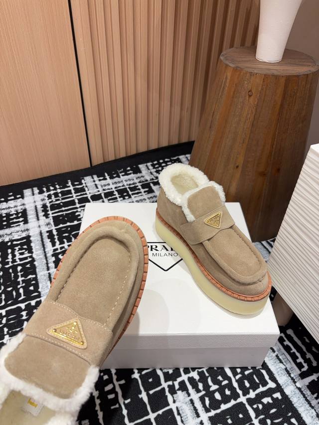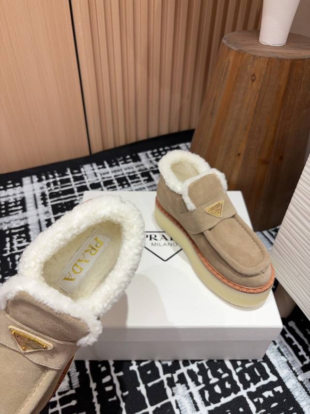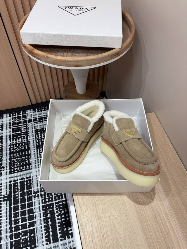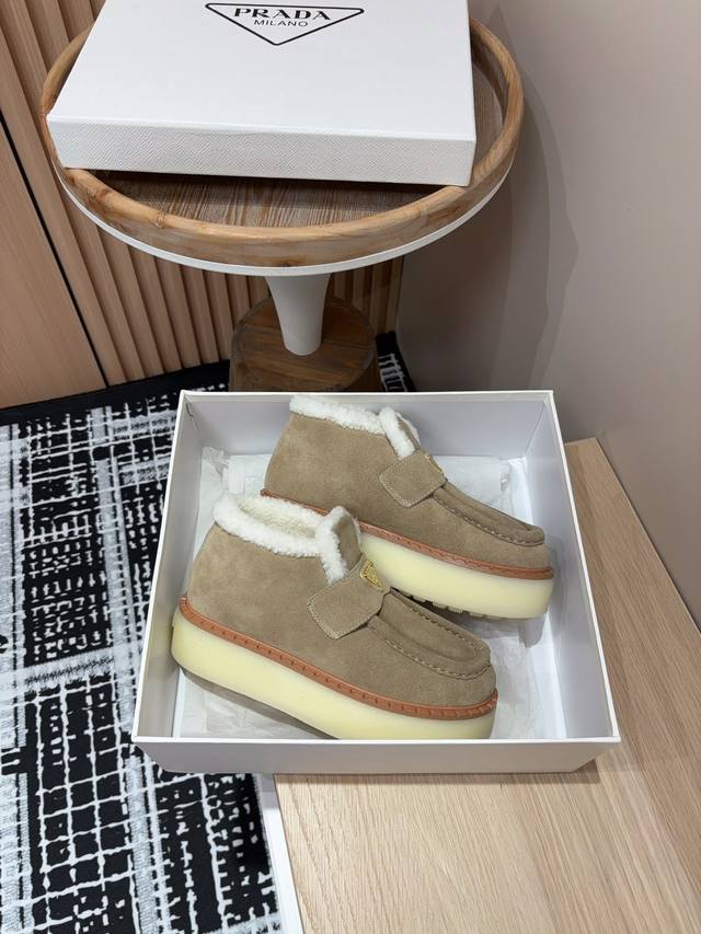 25Ss Autumn/Winter New Prada Triangle Logo Thick-Soled Ankle Boots Lace-up Snow Boots Ddd These simple thick-soled, fur-lined ankle boots are crafted from lamb's wool. The innovative triangle logo is reinterpreted as a classic element! Ddd Upper: Two-tone distressed calfskin Ddd Lining: Genuine lamb's wool Ddd Sole: TPU sole with genuine leather welt Ddd Sizes: 35-39 40, 41 (Custom orders are non-refundable/non-exchangeable) Ddd
