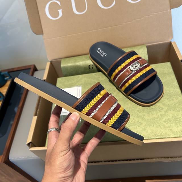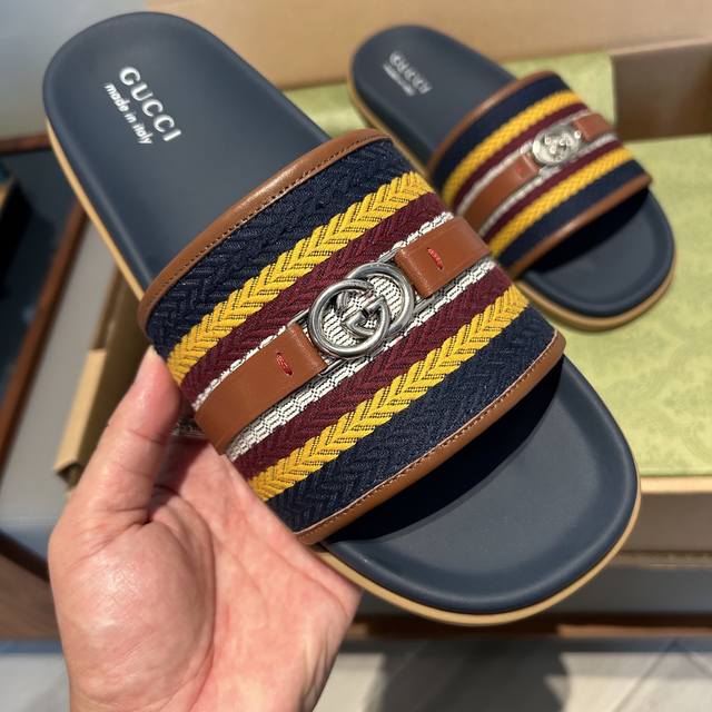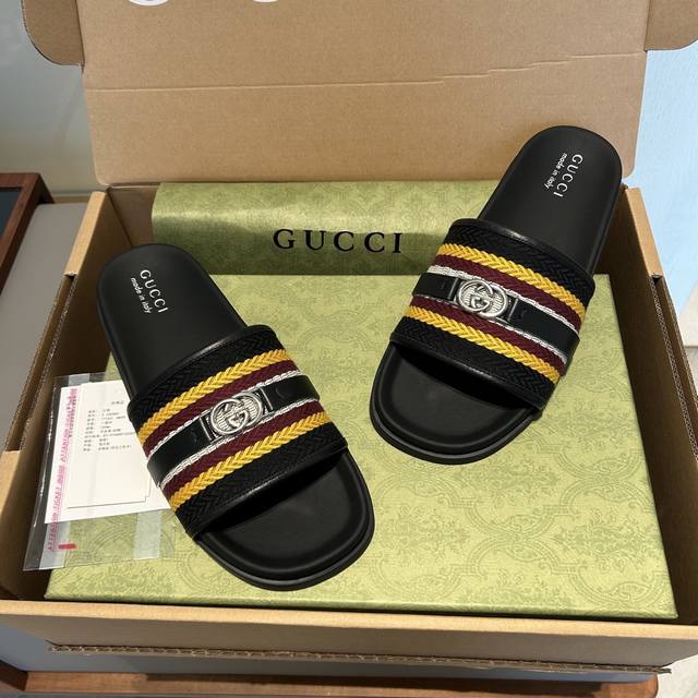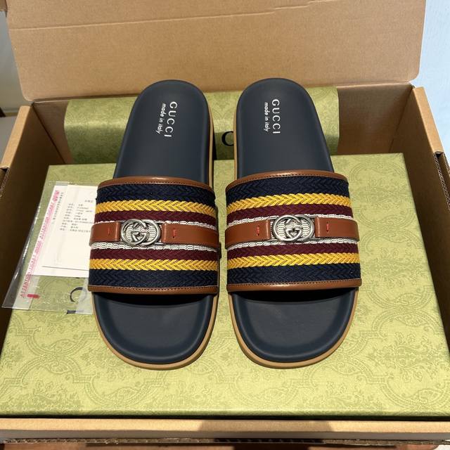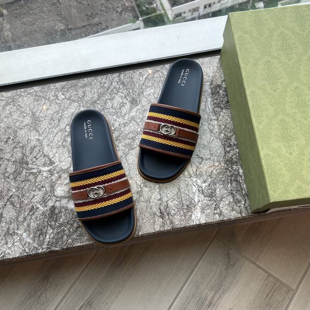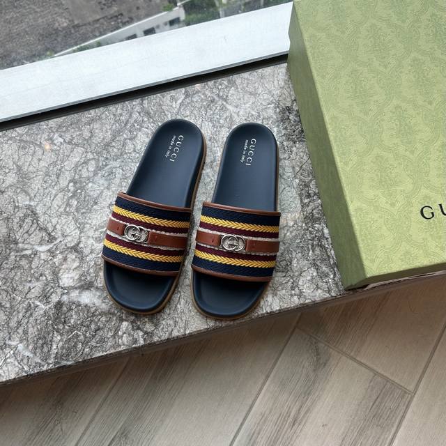 25Ss Latest Men's Interlocking Double G Slippers, Hardware and Outsole, Private Mold Design. These slippers draw inspiration from the brand's iconic webbing element, featuring green and red stripes in various colors, crafted with nylon and silver interlocking double G details. The red, green, and silver nylon accents and interlocking double G details are also present. Available in 3 colors! Full packaging! Upper: Full-grain cowhide with colorful stripes. Lining: Imported original cowhide. Outsole: Original rubber outsole. Size: 38-45. Sizes 38 and 45 are custom-made and non-refundable.
