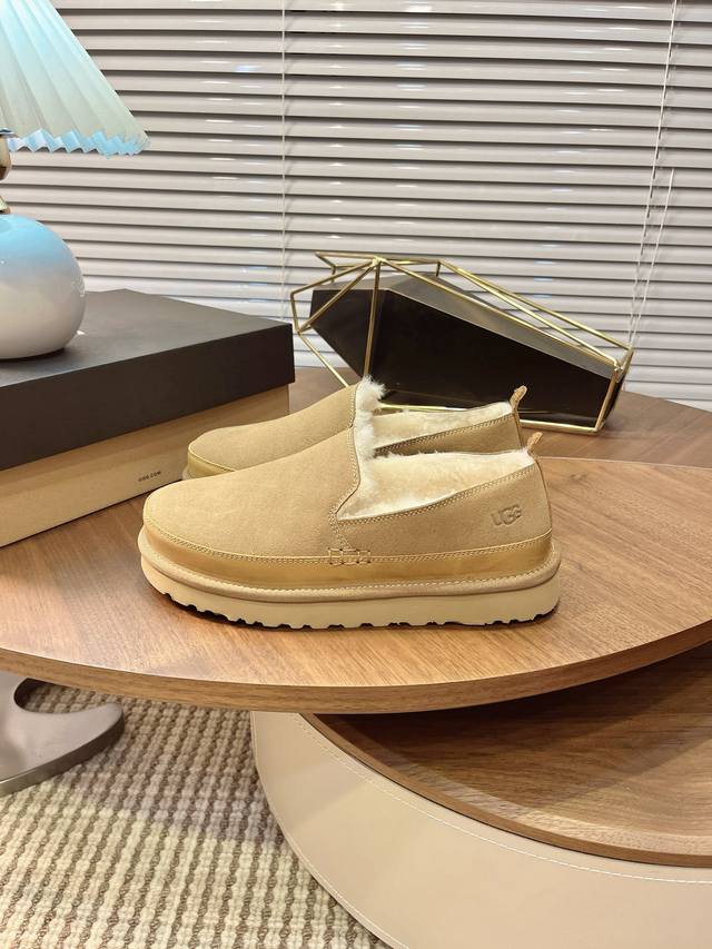 2670 New Men's Style. Men's winter snow boots, furry shoes, incredibly stylish and versatile, boosting your presence. Upper: High-quality cow suede; Lining: Sheepskin and wool lining; Outsole: Eva non-slip outsole; Sizes: 39-45.