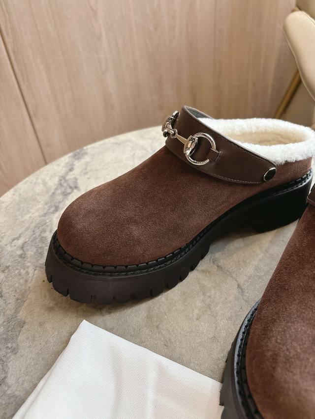 731-1A As a tribute to the brand's equestrian origins, the horsebit, refined over time, seamlessly blends rich historical heritage with modern style. This women's mule is crafted with smooth suede and imported super-short wool. Sizes: 35-41, 40, 41. Custom-made. Packaging: Full packaging.