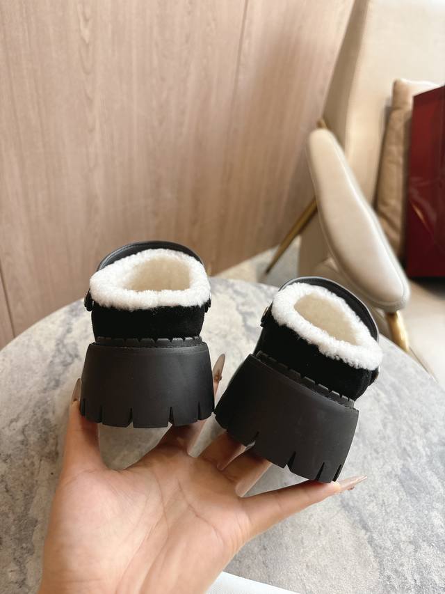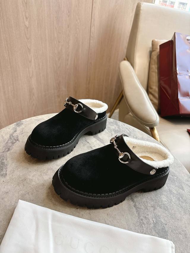 731-1A Black: A tribute to the brand's equestrian roots, the horsebit, weathered by time, blends rich historical heritage with modern style. This women's mule is crafted from smooth suede and imported super-short wool. Sizes: 35-41, 40, 41. Custom-made. Packaging: Full packaging.