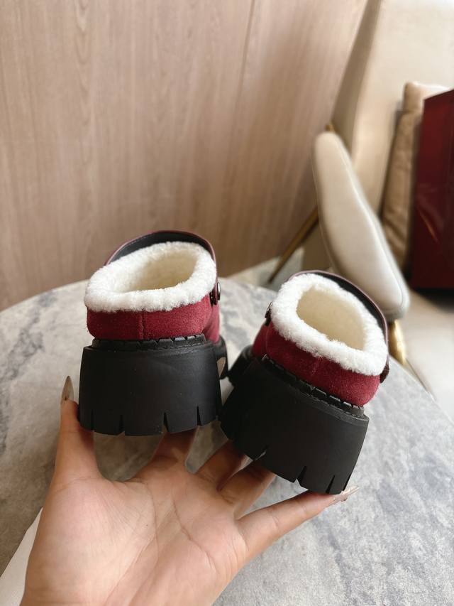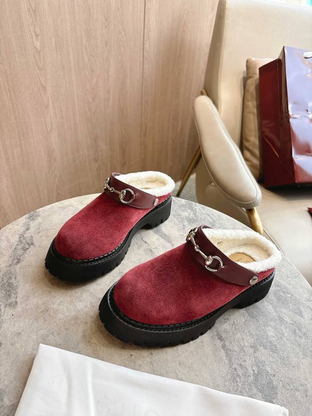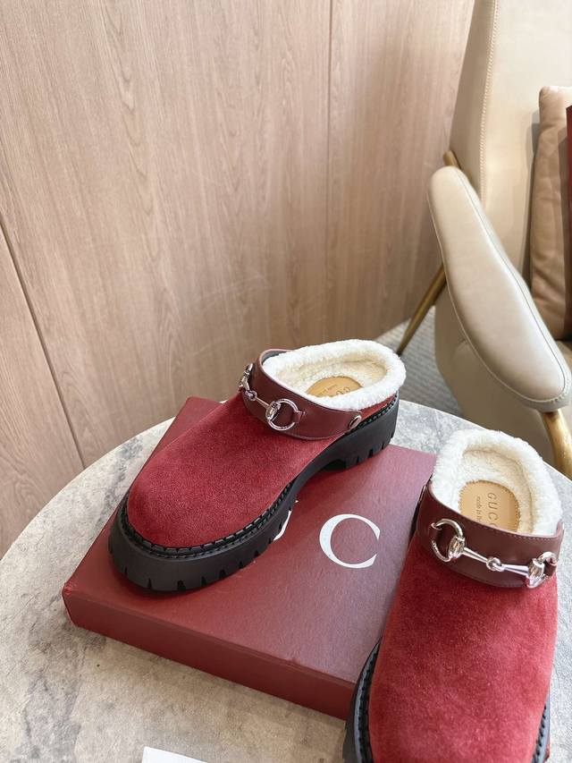 731-1A The burgundy color pays homage to the brand's equestrian roots. The horsebit, weathered by time, blends rich historical heritage with modern style. This women's mule is crafted from smooth suede and imported super-short wool. Sizes: 35-41, 40, 41. Custom-made. Packaging: Full packaging.