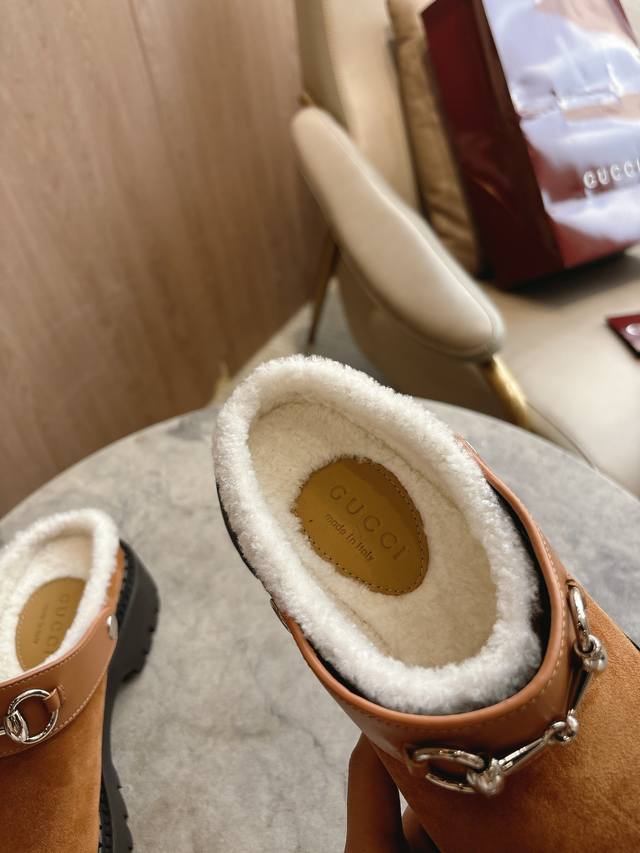 731-3A Brown ?35-41 As a tribute to the brand's equestrian roots, the Horsebit, having withstood the test of time, blends rich historical heritage with modern style. This women's mule is crafted from smooth suede and imported supershort wool. Brown suede material, silver accents, Horsebit, rubber grooved sole, mid-heel, 5cm height.
