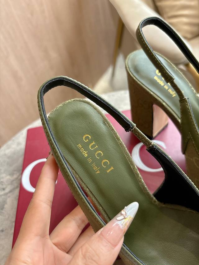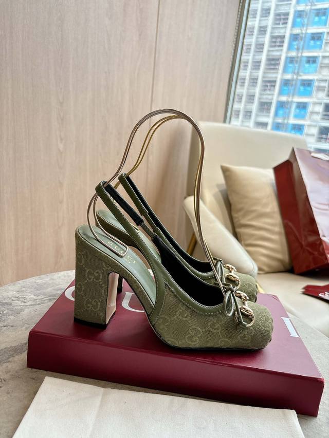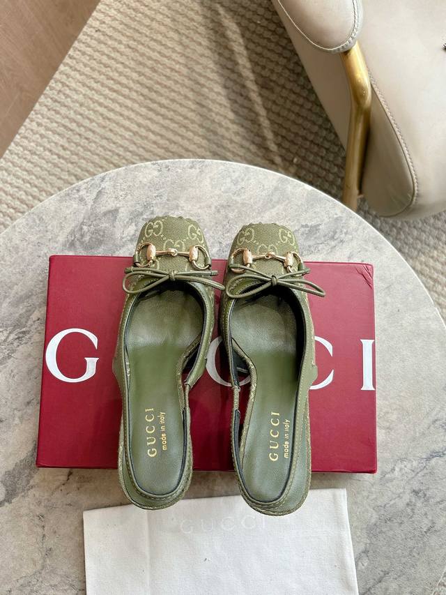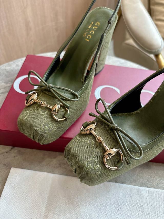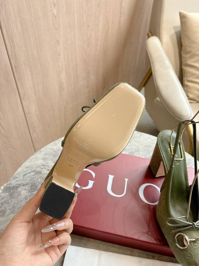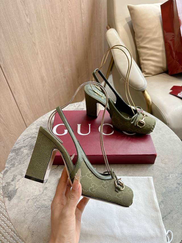 918-1 Green G 35-42 41 42 Made to order, no returns or exchanges, 2025 Autumn/Winter collection. This horsebit back-lacing pump features a square toe design with elegant bow details, paying homage to traditional ballet flats. Crafted from leather and adorned with light gold hardware, the "Sacchetto" construction ensures exceptional comfort. Military green Gg canvas, light gold hardware, leather lining, horsebit, leather bow detail, leather sole, "Sacchetto" construction, lace-up design with adjustable buckle, high heel, 9.5 cm.