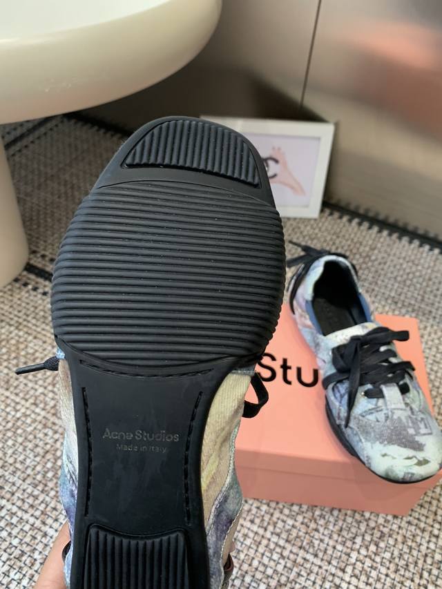Acne Studios New Ballet Sneakers DDD Acne Studios combines sneakers with the currently popular elements of ballet shoes to launch its first ballet sneakers DDD The entire shoe is inspired by the pointe shoes worn by actual ballet dancers, featuring a strappy design on the forefoot and crisscross straps at the heel. The boat-shaped upper and narrow toe box are reminiscent of pointe shoes DDD The upper is made of textured leather, and the heel features delicate decorative straps. It's a flat shoe that combines romance and street style DDD Sizes: 35-40 40 (custom sizes available) DDD