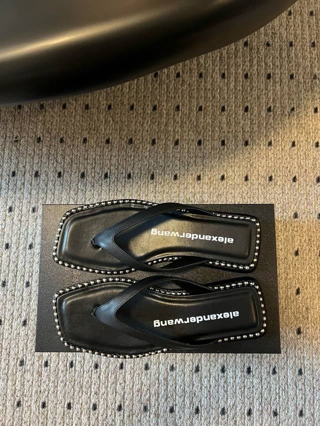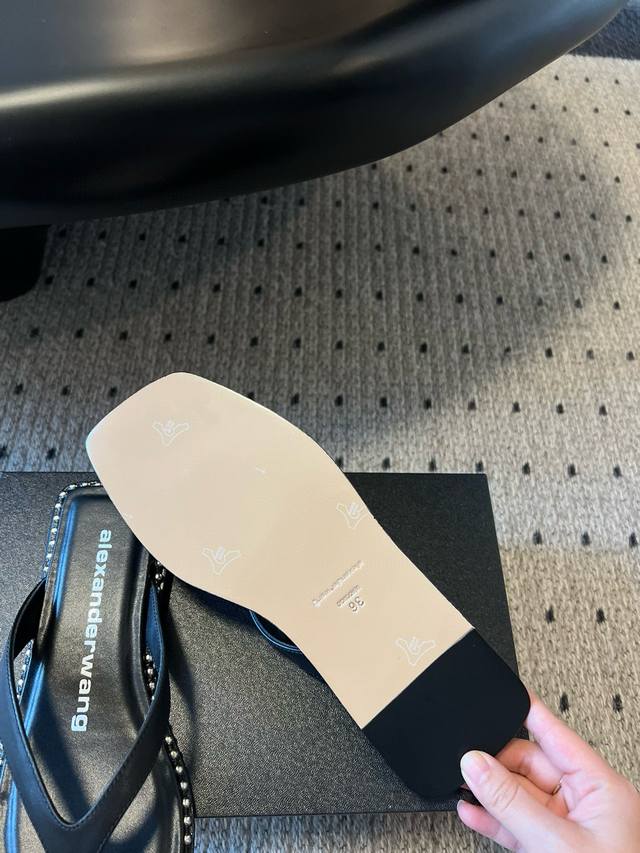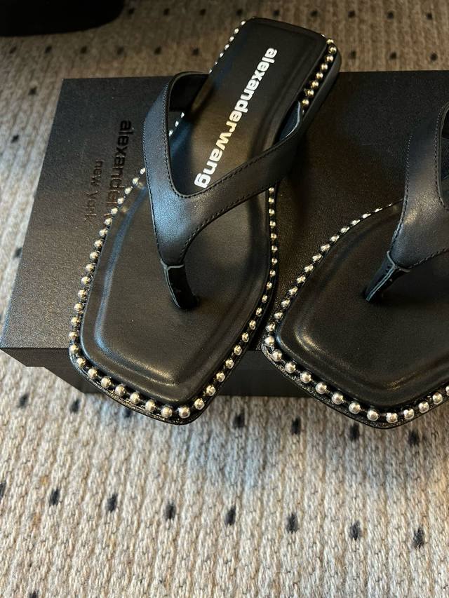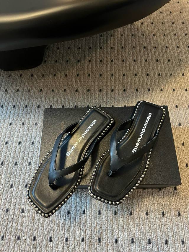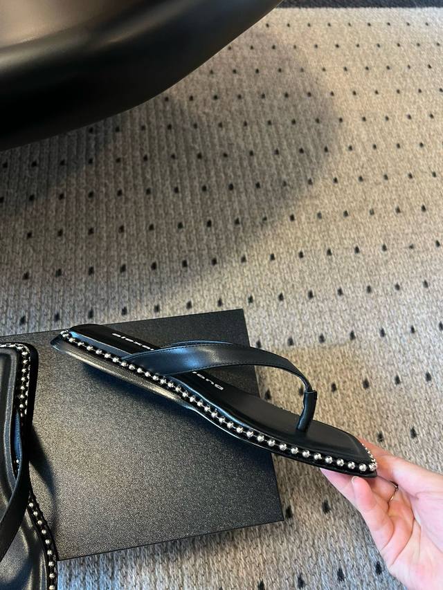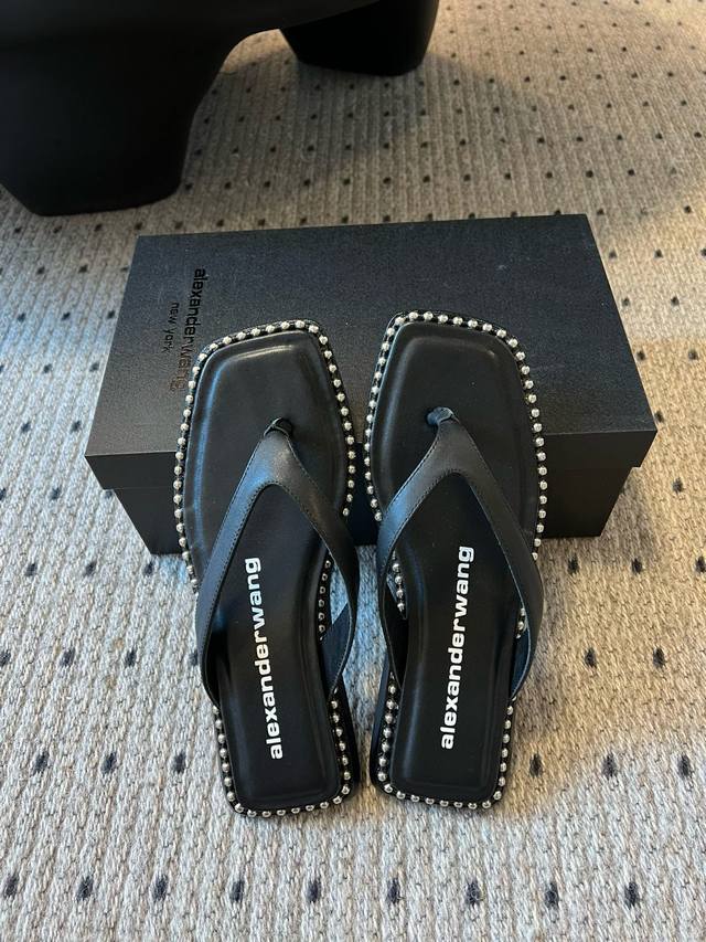 Alexandere* Wang 25Ss newest spring/summer flip-flops. Love the stylish, sophisticated style of these simple Wang flip-flops. This summer essential is stylish and comfortable, showcasing a fresh new look for Wang's iconic silhouette. The flat sole is accented with a beaded edging for a unique look. Upper: Original cowhide with open mold and button studs. Lining: Sheepskin. Sole: Genuine Italian leather outsole. Sizes: 35, 40, 40. Made to order, no returns or exchanges.