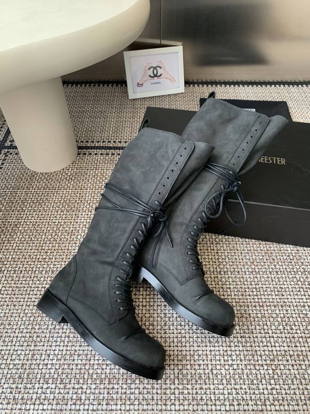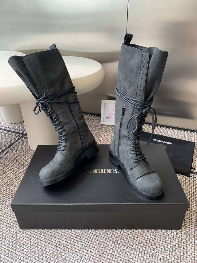 This series creatively combines raw, rough textures with a delicate, fragile aesthetic, creating a modern female image that combines strength and tenderness through deconstructed tailoring, highlighting the brand's pioneering black high boots in the context of contemporary fashion, a perfect combination of elegance and retro. The round toe and thick sole are full of retro charm; the lace-up side zippers reveal exquisite details. A full range of sizes are available to suit various styles. Whether paired with a dress or a long skirt, it is easy to create an elegant retro look. This pair of black high boots will allow you to show your unique elegance in the retro trend.