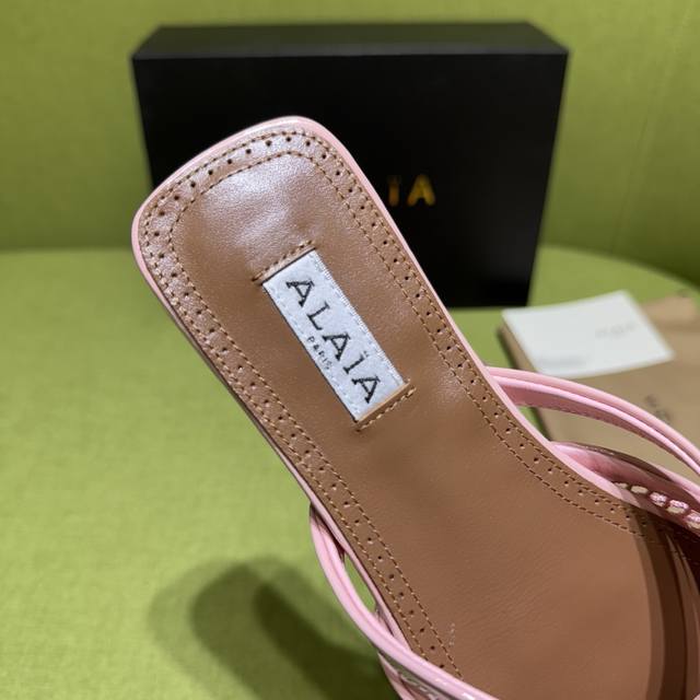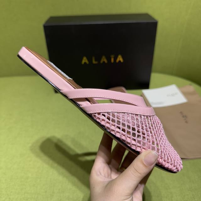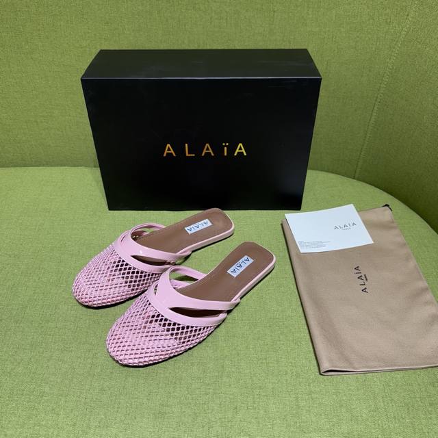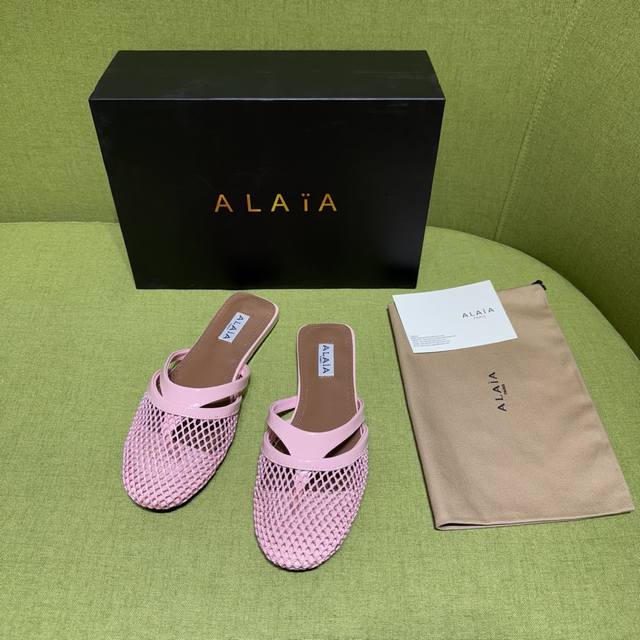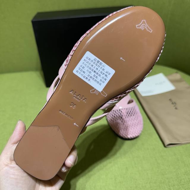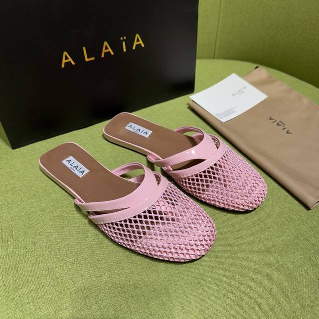 Alaia 2025 Spring/Summer New Flip-Flops Sandals with a fishnet and leather design. Patent leather details complement the fishnet upper, releasing a modern tension with every step. Material: Patent Leather Lining/Insole: Sheepskin Outsole: Genuine Leather Sizes: 35-42, 40, 41, 42 (Made to Order) Factory Price (pp):