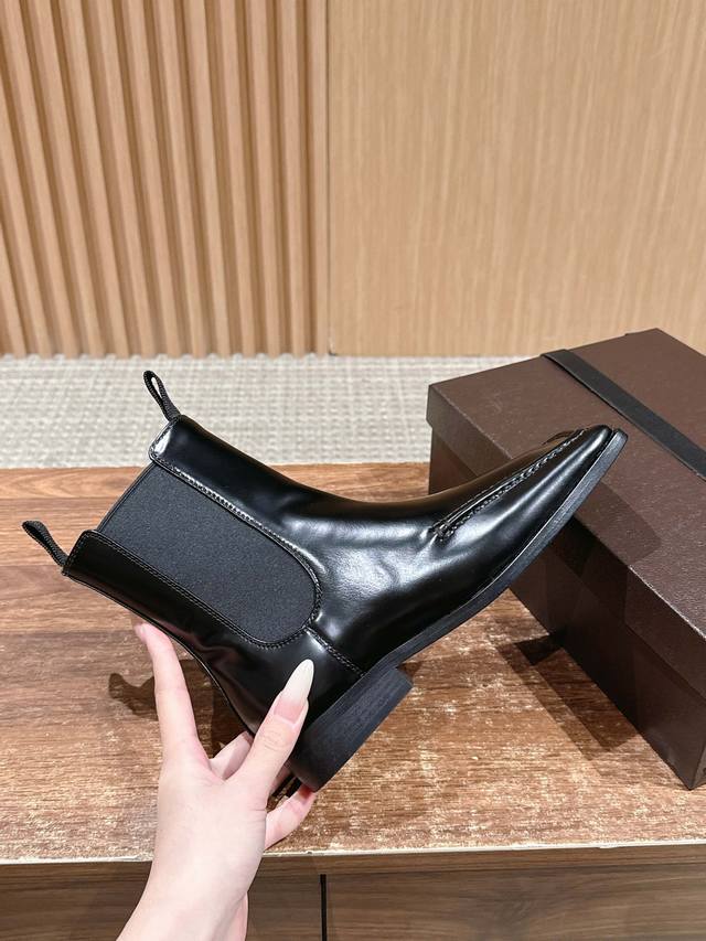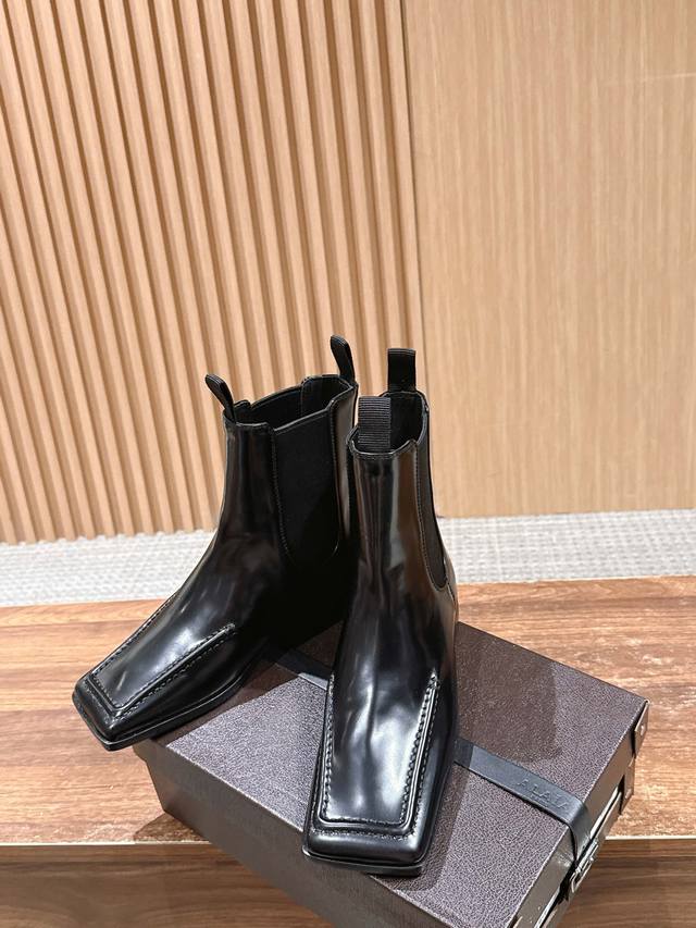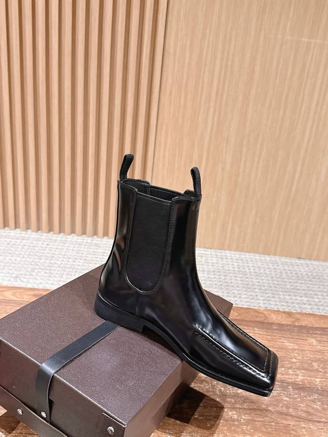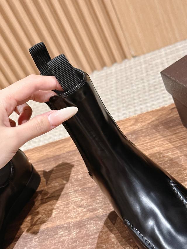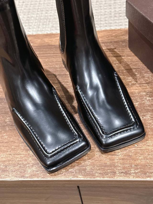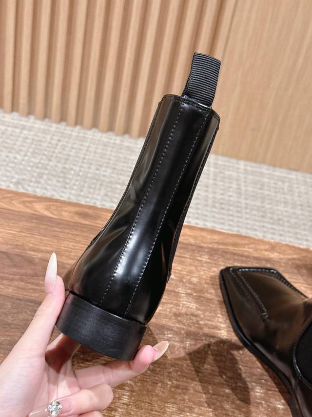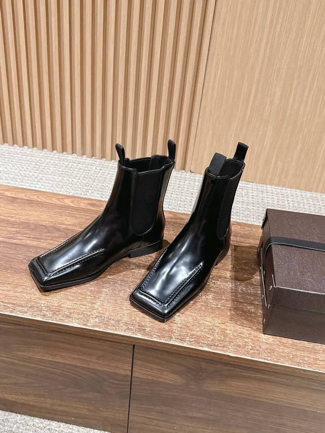 Alaya New Minimalist Square-Toe Flat Ankle Boots DDD Continuing the brand's signature square toe, these boots feature a chunky heel and wedge heel, ensuring stability while naturally elongating the legs. The ankle-length silhouette is a slim fit, wrapping the ankle without being constricting. DDD Available in glossy cowhide and matte suede, both handcrafted in Italy. The boots feature elasticated side panels and a back zipper. Color options are primarily black and brown, allowing for both a French retro look and a sophisticated workwear style