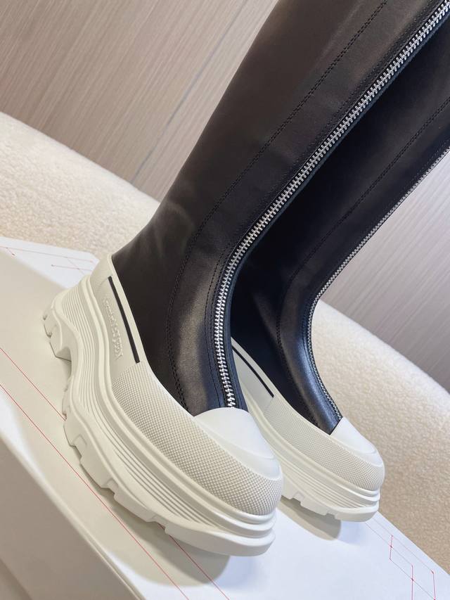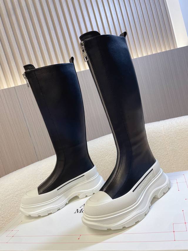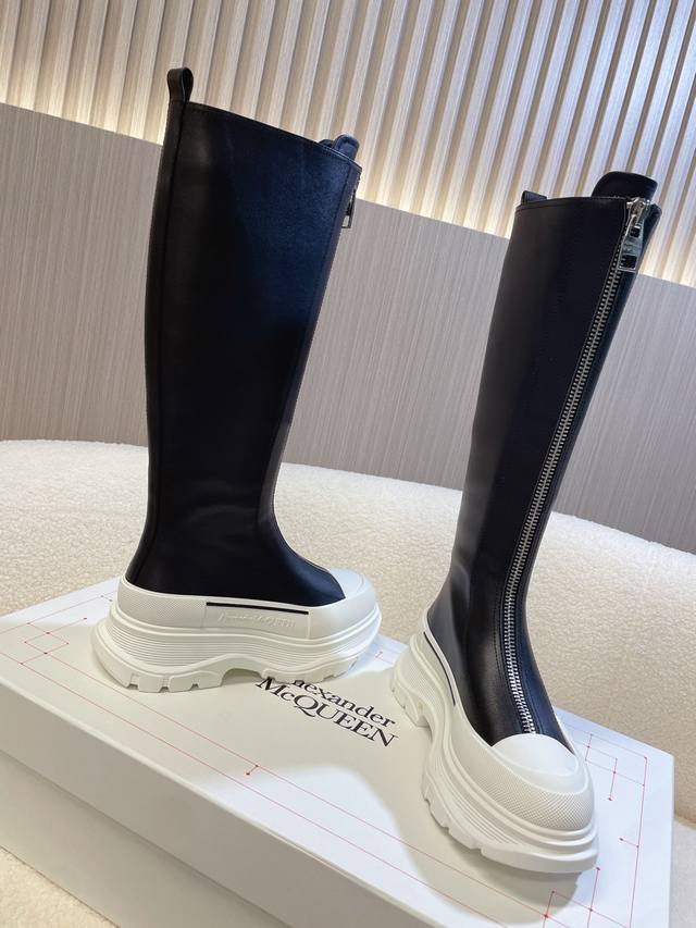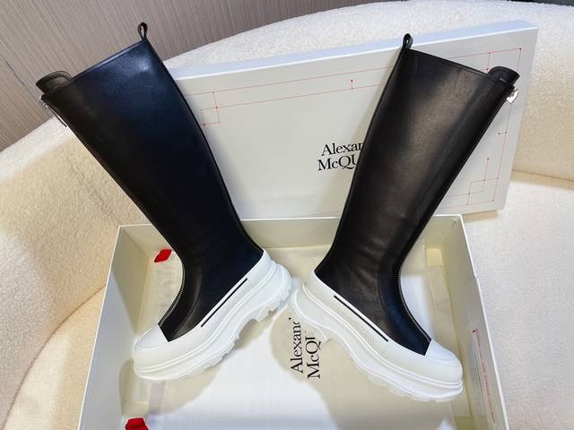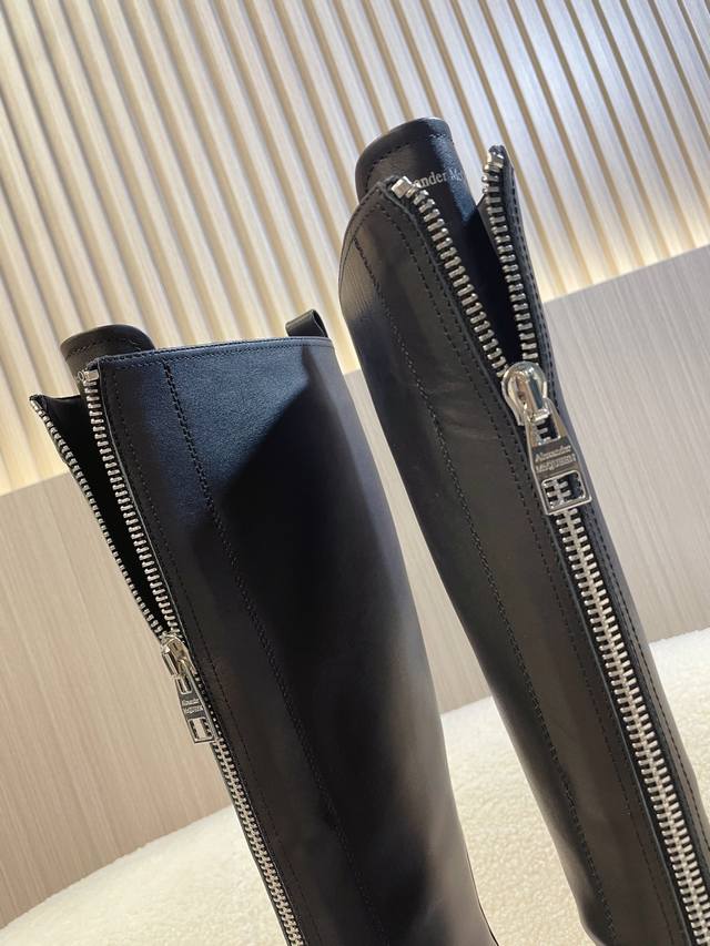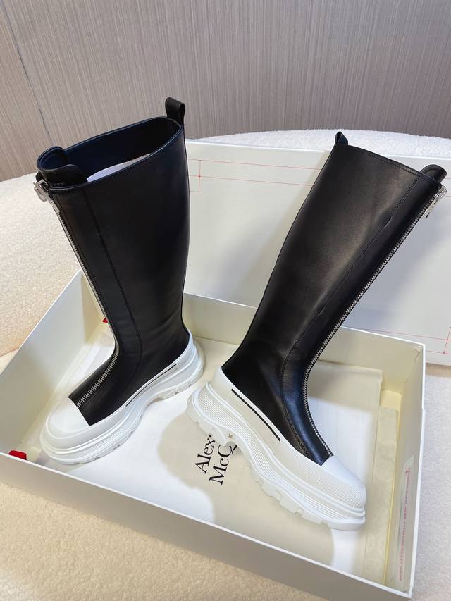 Alexander McQueen Martin Boots; Ankle Boots; Long Boots. This boot is a must-have on Xiaohongshu (Little Red Book) and endorsed by celebrities. A universally loved and versatile bestseller. High-end quality with custom details, a 1:1 replica of the original, featuring an original mold, sole, and leather. Full top-grain cowhide upper; genuine leather lining; original shell toe; TPU outsole; central iron zipper design; letter logo embellishments on the tongue and heel. Sizes 35 and 40 true to size, comes with packaging.