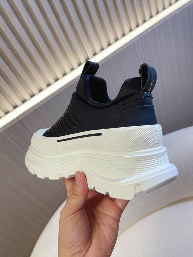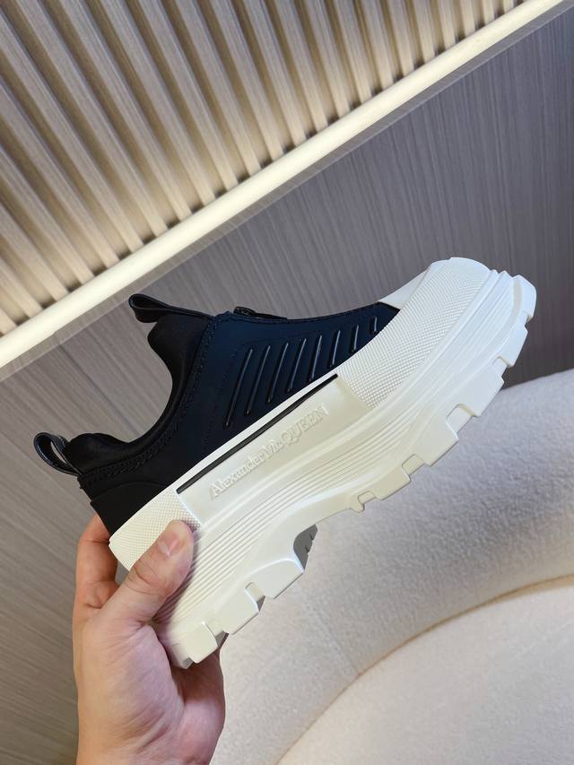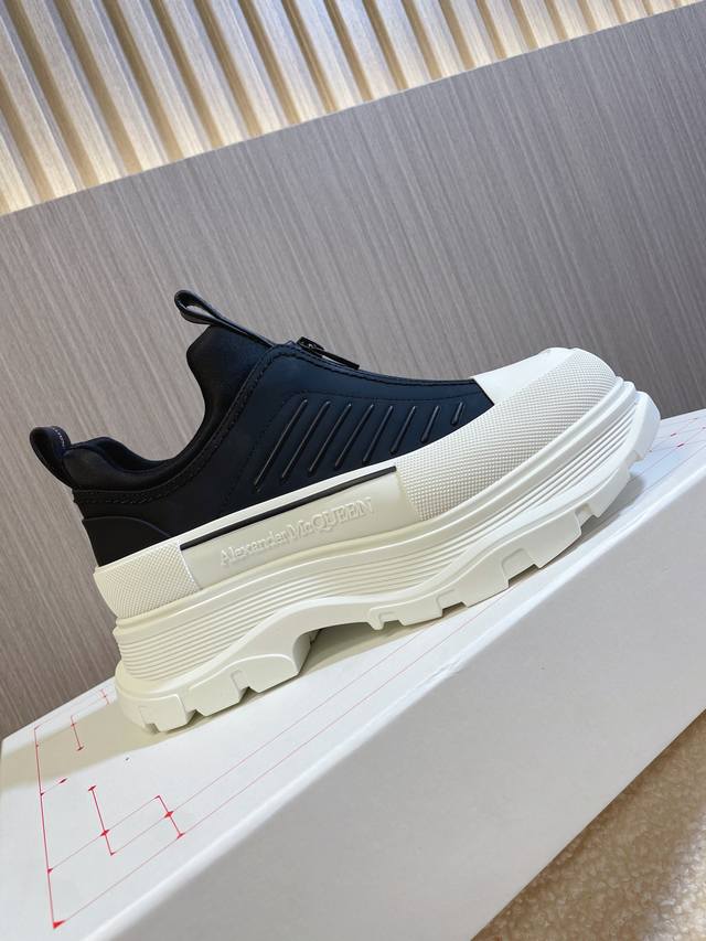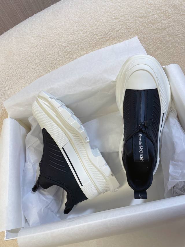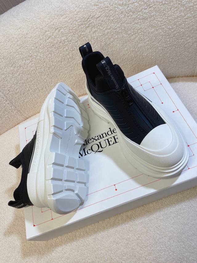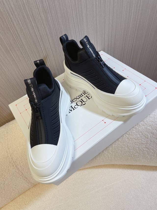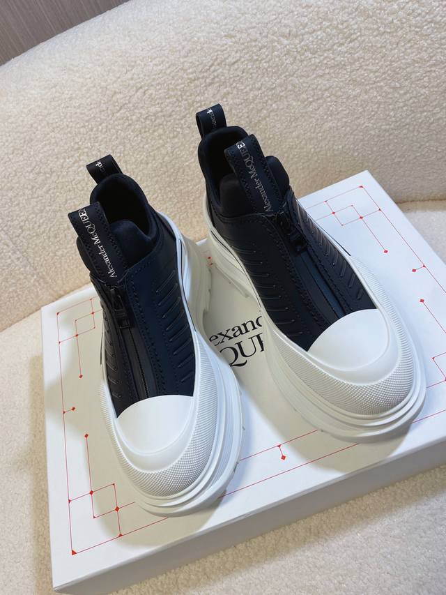 Alexander McQueen DDD New Tread Slisck Moto Functional Ankle Boots; Elastic Shoes; Couple Style, Absolutely Loved; So Cool and Stylish DDD High-End Custom Details, 1:1 Replica, Exclusive Mold, Original Last, Original Sole, Original Leather DDD Full Grain Leather Upper; High-Density Elastic Lycra Lining; Original Shell Toe TPU Outsole; Central Zipper Design; Letter Logo on Tongue and Heel DDD Women's Sizes 35 & 40, Men's Sizes 39 & 44, Matching Packaging DDD